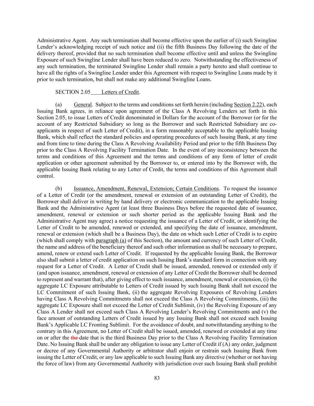 113 Section 2.20 and such technical amendments (including, without limitation, as set forth in clause (f) above) as may be necessary or appropriate in the reasonable opinion of the Administrative Agent and the Borrower in connection with the establishment of such new Classes or sub-Classes, in each case on terms consistent with this Section 2.20. (j) Notwithstanding anything to the contrary, this Section 2.20 shall supersede any provisions in Section 2.18 or Section 9.02 to the contrary. SECTION 2.21 [Reserved]. SECTION 2.22 Defaulting Lenders. (a) General. Notwithstanding anything to the contrary contained in this Agreement, if any Lender becomes a Defaulting Lender, then, until such time as that Lender is no longer a Defaulting Lender, to the extent permitted by applicable law: (i) Waivers and Amendments. Such Defaulting Lender’s right to approve or disapprove any amendment, waiver or consent with respect to this Agreement shall be restricted as set forth in Section 9.02. (ii) Reallocation of Payments. Subject to the last sentence of Section 2.11(f)(i), the last sentence of Section 2.11(f)(ii) and the last sentence of Section 2.11(g), any payment of principal, interest, fees or other amounts received by the Administrative Agent for the account of that Defaulting Lender (whether voluntary or mandatory, at maturity, pursuant to Article VII or otherwise, and including any amounts made available to the Administrative Agent by that Defaulting Lender pursuant to Section 9.08), shall be applied at such time or times as may be determined by the Administrative Agent as follows: first, to the payment of any amounts owing by that Defaulting Lender to the Administrative Agent hereunder; second, in the case of a Revolving Lender, to the payment on a pro rata basis of any amounts owing by that Defaulting Lender to each Issuing Bank and the Swingline Lender hereunder; third, as the Borrower may request (so long as no Default or Event of Default exists), to the funding of any Loan in respect of which that Defaulting Lender has failed to fund its portion thereof as required by this Agreement, as determined by the Administrative Agent; fourth, in the case of a Revolving Lender, if so determined by the Administrative Agent, Holdings and the Borrower, to be held in a non-interest bearing deposit account and released in order to satisfy obligations of that Defaulting Lender to fund Loans under this Agreement; fifth, to the payment of any amounts owing to the Lenders, the Issuing Banks or the Swingline Lender as a result of any judgment of a court of competent jurisdiction obtained by any Lender, such Issuing Bank or the Swingline Lender against that Defaulting Lender as a result of that Defaulting Lender’s breach of its obligations under this Agreement; sixth, so long as no Default or Event of Default exists, to the payment of any amounts owing to the Borrower as a result of any judgment of a court of competent jurisdiction obtained by the Borrower against that Defaulting Lender as a result of that Defaulting Lender’s breach of its obligations under this Agreement; and seventh, to that Defaulting Lender or as otherwise directed by a court of competent jurisdiction; provided that if such payment is a payment of the principal amount of any Loans or LC Disbursements and such Lender is a Defaulting Lender under clause (a) of the definition thereof, such payment shall be applied solely to pay the relevant Loans of, or LC Disbursements owed to, as applicable, the relevant non-Defaulting Lenders on a pro rata basis prior to being applied pursuant to the other provisions of this Section 2.22(a)(ii). Any payments, prepayments or other amounts paid or payable to a Defaulting Lender that are applied (or held) to pay amounts owed by a Defaulting Lender or to post Cash Collateral pursuant to Section 2.05(j) shall be deemed paid to and redirected by that Defaulting Lender, and each Lender irrevocably consents hereto.