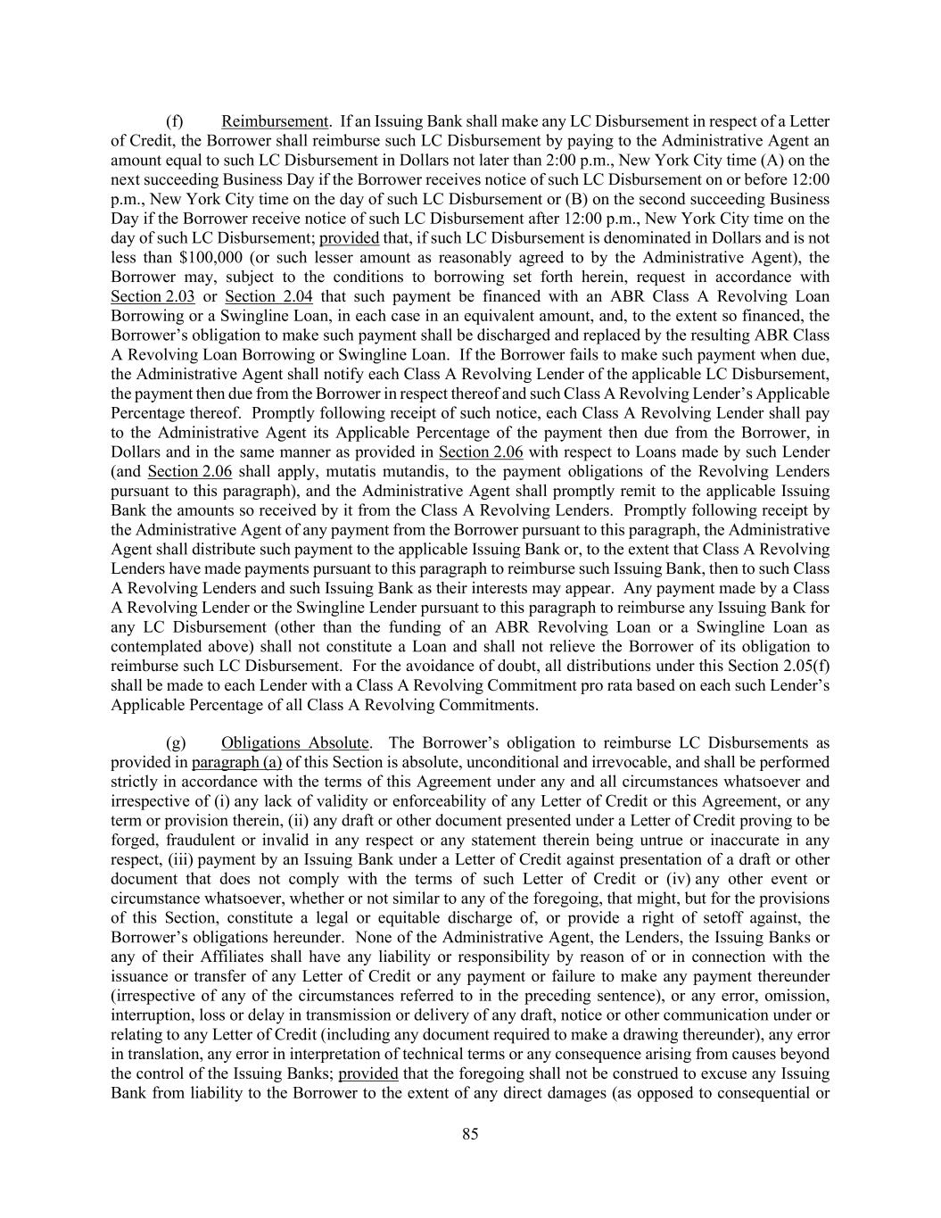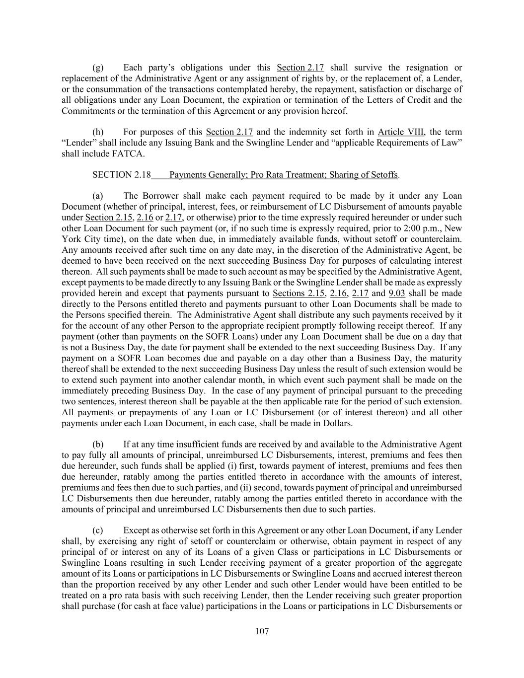 107 (g) Each party’s obligations under this Section 2.17 shall survive the resignation or replacement of the Administrative Agent or any assignment of rights by, or the replacement of, a Lender, or the consummation of the transactions contemplated hereby, the repayment, satisfaction or discharge of all obligations under any Loan Document, the expiration or termination of the Letters of Credit and the Commitments or the termination of this Agreement or any provision hereof. (h) For purposes of this Section 2.17 and the indemnity set forth in Article VIII, the term “Lender” shall include any Issuing Bank and the Swingline Lender and “applicable Requirements of Law” shall include FATCA. SECTION 2.18 Payments Generally; Pro Rata Treatment; Sharing of Setoffs. (a) The Borrower shall make each payment required to be made by it under any Loan Document (whether of principal, interest, fees, or reimbursement of LC Disbursement of amounts payable under Section 2.15, 2.16 or 2.17, or otherwise) prior to the time expressly required hereunder or under such other Loan Document for such payment (or, if no such time is expressly required, prior to 2:00 p.m., New York City time), on the date when due, in immediately available funds, without setoff or counterclaim. Any amounts received after such time on any date may, in the discretion of the Administrative Agent, be deemed to have been received on the next succeeding Business Day for purposes of calculating interest thereon. All such payments shall be made to such account as may be specified by the Administrative Agent, except payments to be made directly to any Issuing Bank or the Swingline Lender shall be made as expressly provided herein and except that payments pursuant to Sections 2.15, 2.16, 2.17 and 9.03 shall be made directly to the Persons entitled thereto and payments pursuant to other Loan Documents shall be made to the Persons specified therein. The Administrative Agent shall distribute any such payments received by it for the account of any other Person to the appropriate recipient promptly following receipt thereof. If any payment (other than payments on the SOFR Loans) under any Loan Document shall be due on a day that is not a Business Day, the date for payment shall be extended to the next succeeding Business Day. If any payment on a SOFR Loan becomes due and payable on a day other than a Business Day, the maturity thereof shall be extended to the next succeeding Business Day unless the result of such extension would be to extend such payment into another calendar month, in which event such payment shall be made on the immediately preceding Business Day. In the case of any payment of principal pursuant to the preceding two sentences, interest thereon shall be payable at the then applicable rate for the period of such extension. All payments or prepayments of any Loan or LC Disbursement (or of interest thereon) and all other payments under each Loan Document, in each case, shall be made in Dollars. (b) If at any time insufficient funds are received by and available to the Administrative Agent to pay fully all amounts of principal, unreimbursed LC Disbursements, interest, premiums and fees then due hereunder, such funds shall be applied (i) first, towards payment of interest, premiums and fees then due hereunder, ratably among the parties entitled thereto in accordance with the amounts of interest, premiums and fees then due to such parties, and (ii) second, towards payment of principal and unreimbursed LC Disbursements then due hereunder, ratably among the parties entitled thereto in accordance with the amounts of principal and unreimbursed LC Disbursements then due to such parties. (c) Except as otherwise set forth in this Agreement or any other Loan Document, if any Lender shall, by exercising any right of setoff or counterclaim or otherwise, obtain payment in respect of any principal of or interest on any of its Loans of a given Class or participations in LC Disbursements or Swingline Loans resulting in such Lender receiving payment of a greater proportion of the aggregate amount of its Loans or participations in LC Disbursements or Swingline Loans and accrued interest thereon than the proportion received by any other Lender and such other Lender would have been entitled to be treated on a pro rata basis with such receiving Lender, then the Lender receiving such greater proportion shall purchase (for cash at face value) participations in the Loans or participations in LC Disbursements or