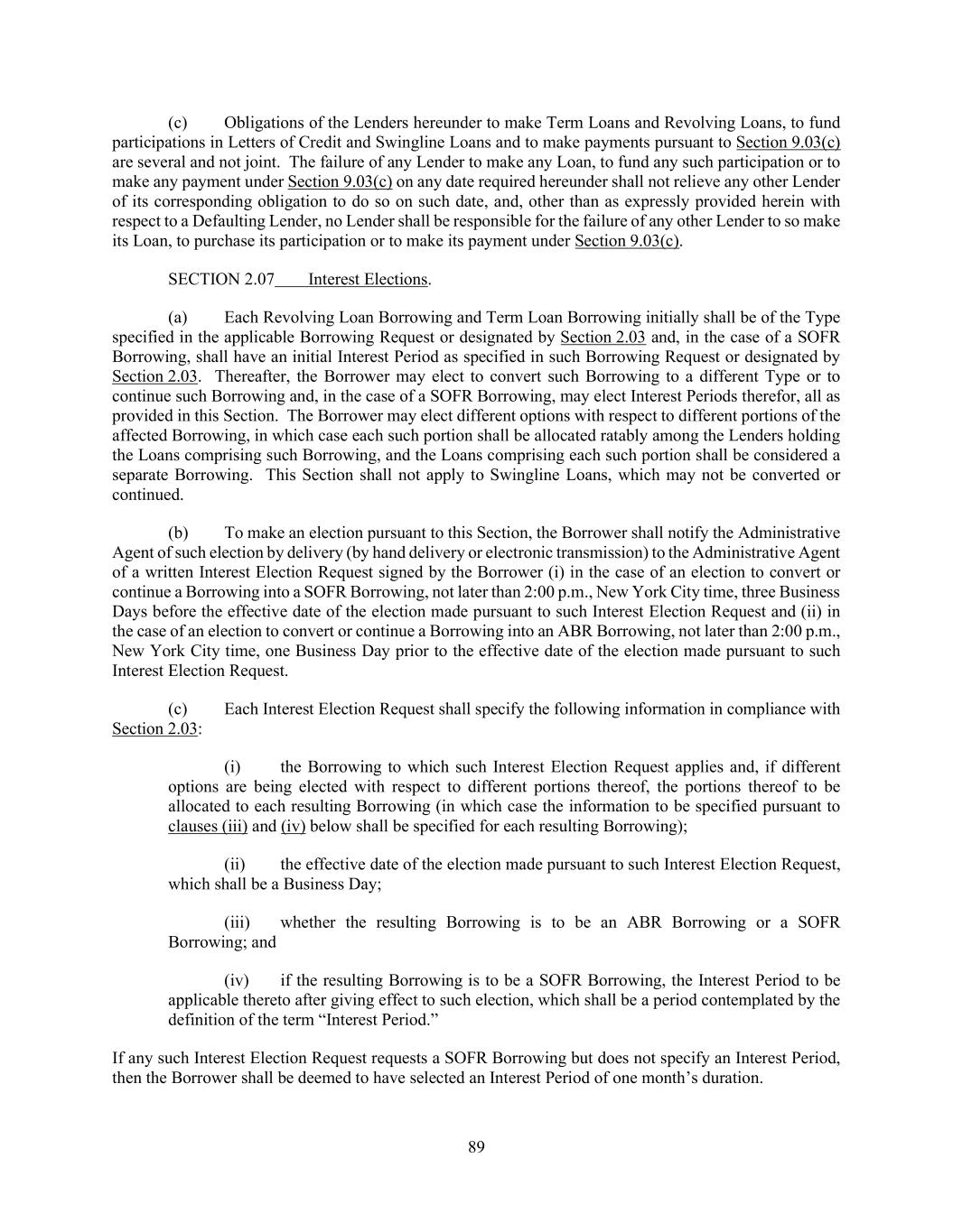 102 definition) for all Benchmark settings at or after such time to reinstate such previously removed tenor. (v) Benchmark Unavailability Period. Upon the Borrower’s receipt of notice of the commencement of a Benchmark Unavailability Period, (A) the Borrower may revoke any pending request for a Borrowing of, conversion to or continuation of SOFR Loans to be made, converted or continued during any Benchmark Unavailability Period and, failing that, the Borrower will be deemed to have converted any such request into a request for a Borrowing of or conversion to ABR Loans and (B) any outstanding affected SOFR Loans will be deemed to have been converted to ABR Loans at the end of the applicable Interest Period. During a Benchmark Unavailability Period or at any time that a tenor for the then-current Benchmark is not an Available Tenor, the component of Alternate Base Rate based upon the then-current Benchmark or such tenor for such Benchmark, as applicable, will not be used in any determination of Alternate Base Rate. SECTION 2.15 Increased Costs. (a) If any Change in Law shall: (i) impose, modify or deem applicable any reserve, special deposit, compulsory loan, insurance charge or similar requirement against assets of, deposits with or for the account of, or credit extended by, any Lender or any Issuing Bank; or (ii) impose on any Lender or any Issuing Bank any other condition, cost or expense (other than with respect to Taxes) affecting this Agreement or SOFR Loans made by such Lender or any Letter of Credit or participation therein; or (iii) subject any Lender or any Issuing Bank to any Taxes on its Loans, letters of credit, Commitments, or other obligations, or its deposits, reserves, other liabilities or capital attributable thereto; and the result of any of the foregoing shall be to increase the cost to such Lender or Issuing Bank of making or maintaining any Loan (or of maintaining its obligation to make any such Loan) or to increase the cost to such Lender or Issuing Bank of participating in, issuing or maintaining any Letter of Credit (or of maintaining its obligation to participate in or issue any Letter of Credit) or to reduce the amount of any sum received or receivable by such Lender or Issuing Bank hereunder (whether of principal, interest or otherwise), then, from time to time upon request of such Lender or Issuing Bank, the Borrower will pay to such Lender or Issuing Bank, as the case may be, such additional amount or amounts as will compensate such Lender or Issuing Bank, as the case may be, for such increased costs actually incurred or reduction actually suffered, provided that the Borrower shall not be liable for such compensation if, in the case of requests for reimbursement under clause (ii) above resulting from a market disruption, (A) the relevant circumstances are not generally affecting the banking market or (B) the applicable request has not been made by Lenders constituting Required Lenders; provided, further, that to the extent any such costs or reductions are incurred by any Lender as a result of any requests, rules, guidelines or directives enacted or promulgated under the Dodd-Frank Wall Street Reform and Consumer Protection Act of 2010 or under Basel III, then such Lender shall be compensated pursuant to this Section 2.15(a) only to the extent such Lender is imposing such charges on similarly situated borrowers where the terms of other syndicated credit facilities permit it to impose such charges. Notwithstanding the foregoing, this paragraph will not apply to (A) Indemnified Taxes, (B) Taxes described in clauses (b) through (d) of the definition of Excluded Taxes and (C) Connection Income Taxes.