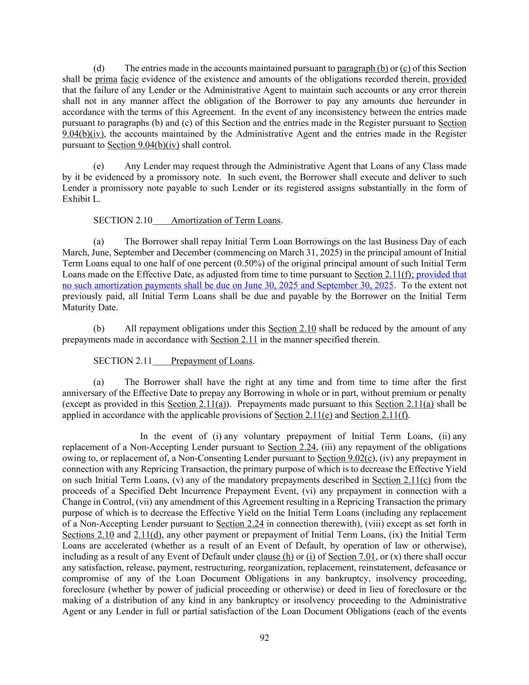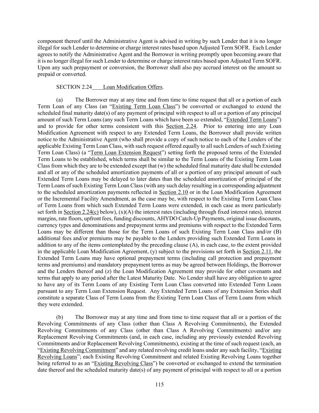 115 component thereof until the Administrative Agent is advised in writing by such Lender that it is no longer illegal for such Lender to determine or charge interest rates based upon Adjusted Term SOFR. Each Lender agrees to notify the Administrative Agent and the Borrower in writing promptly upon becoming aware that it is no longer illegal for such Lender to determine or charge interest rates based upon Adjusted Term SOFR. Upon any such prepayment or conversion, the Borrower shall also pay accrued interest on the amount so prepaid or converted. SECTION 2.24 Loan Modification Offers. (a) The Borrower may at any time and from time to time request that all or a portion of each Term Loan of any Class (an “Existing Term Loan Class”) be converted or exchanged to extend the scheduled final maturity date(s) of any payment of principal with respect to all or a portion of any principal amount of such Term Loans (any such Term Loans which have been so extended, “Extended Term Loans”) and to provide for other terms consistent with this Section 2.24. Prior to entering into any Loan Modification Agreement with respect to any Extended Term Loans, the Borrower shall provide written notice to the Administrative Agent (who shall provide a copy of such notice to each of the Lenders of the applicable Existing Term Loan Class, with such request offered equally to all such Lenders of such Existing Term Loan Class) (a “Term Loan Extension Request”) setting forth the proposed terms of the Extended Term Loans to be established, which terms shall be similar to the Term Loans of the Existing Term Loan Class from which they are to be extended except that (w) the scheduled final maturity date shall be extended and all or any of the scheduled amortization payments of all or a portion of any principal amount of such Extended Term Loans may be delayed to later dates than the scheduled amortization of principal of the Term Loans of such Existing Term Loan Class (with any such delay resulting in a corresponding adjustment to the scheduled amortization payments reflected in Section 2.10 or in the Loan Modification Agreement or the Incremental Facility Amendment, as the case may be, with respect to the Existing Term Loan Class of Term Loans from which such Extended Term Loans were extended, in each case as more particularly set forth in Section 2.24(c) below), (x)(A) the interest rates (including through fixed interest rates), interest margins, rate floors, upfront fees, funding discounts, AHYDO Catch-Up Payments, original issue discounts, currency types and denominations and prepayment terms and premiums with respect to the Extended Term Loans may be different than those for the Term Loans of such Existing Term Loan Class and/or (B) additional fees and/or premiums may be payable to the Lenders providing such Extended Term Loans in addition to any of the items contemplated by the preceding clause (A), in each case, to the extent provided in the applicable Loan Modification Agreement, (y) subject to the provisions set forth in Section 2.11, the Extended Term Loans may have optional prepayment terms (including call protection and prepayment terms and premiums) and mandatory prepayment terms as may be agreed between Holdings, the Borrower and the Lenders thereof and (z) the Loan Modification Agreement may provide for other covenants and terms that apply to any period after the Latest Maturity Date. No Lender shall have any obligation to agree to have any of its Term Loans of any Existing Term Loan Class converted into Extended Term Loans pursuant to any Term Loan Extension Request. Any Extended Term Loans of any Extension Series shall constitute a separate Class of Term Loans from the Existing Term Loan Class of Term Loans from which they were extended. (b) The Borrower may at any time and from time to time request that all or a portion of the Revolving Commitments of any Class (other than Class A Revolving Commitments), the Extended Revolving Commitments of any Class (other than Class A Revolving Commitments) and/or any Replacement Revolving Commitments (and, in each case, including any previously extended Revolving Commitments and/or Replacement Revolving Commitments), existing at the time of such request (each, an “Existing Revolving Commitment” and any related revolving credit loans under any such facility, “Existing Revolving Loans”; each Existing Revolving Commitment and related Existing Revolving Loans together being referred to as an “Existing Revolving Class”) be converted or exchanged to extend the termination date thereof and the scheduled maturity date(s) of any payment of principal with respect to all or a portion