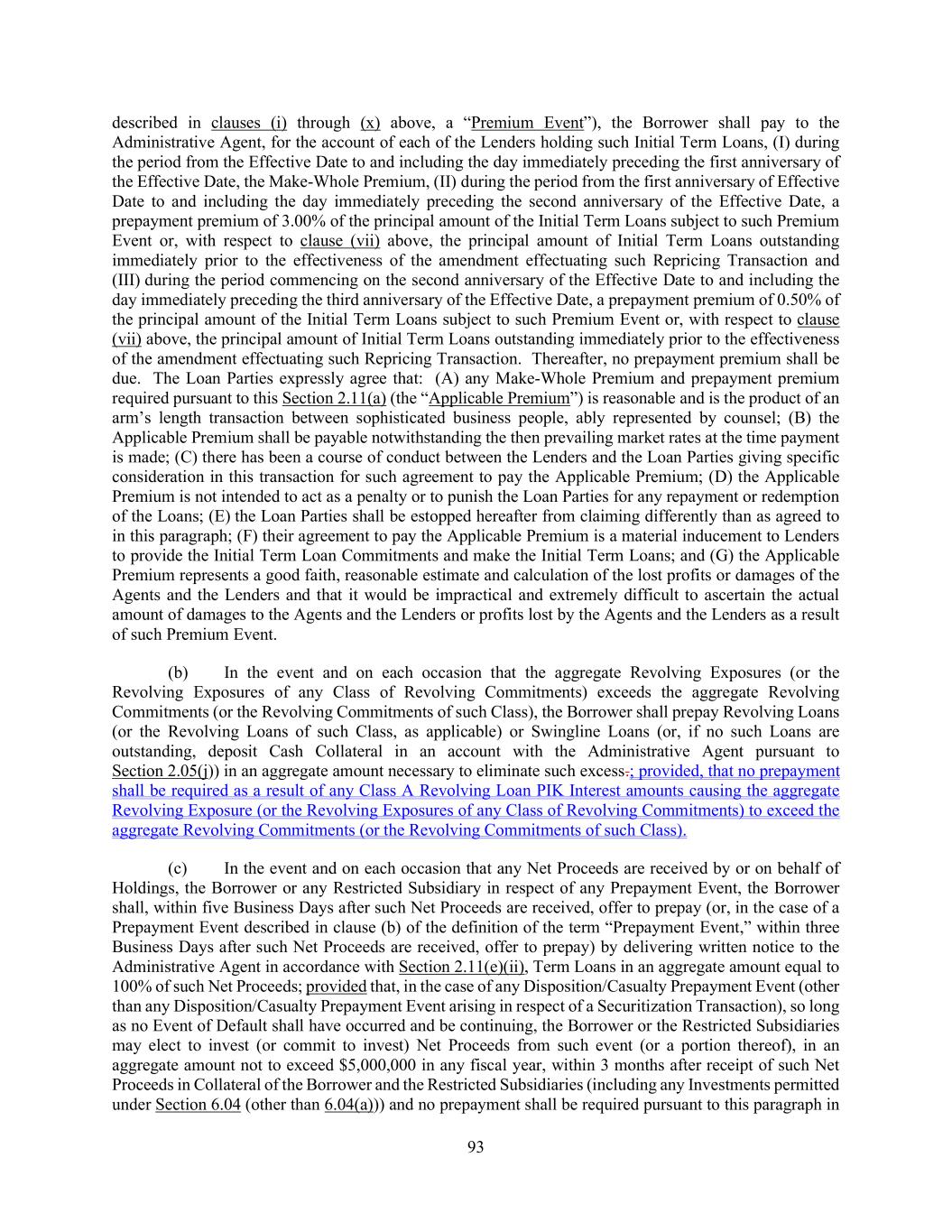 3 matching of assignment terms and contract formations on electronic platforms approved by the Administrative Agent, or the keeping of records in electronic form, each of which shall be of the same legal effect, validity or enforceability as a manually executed signature or the use of a paper-based recordkeeping system, as the case may be, to the extent and as provided for in any applicable law, including the Federal Electronic Signatures in Global and National Commerce Act, the New York State Electronic Signatures and Records Act, or any other similar state laws based on the Uniform Electronic Transactions Act. Each of the parties hereto agrees and acknowledges that (i) the transaction consisting of this Amendment may be conducted by electronic means, (ii) it is such party’s intent that, if such party signs this Amendment using an electronic signature, it is signing, adopting and accepting this Amendment and that signing this Amendment using an electronic signature is the legal equivalent of having placed its handwritten signature on this Amendment on paper and (iii) it is being provided with an electronic or paper copy of this Amendment in a useable format. Section 7. Conditions Precedent to Effectiveness of this Amendment. This Amendment shall become effective on the date (the “Amendment No. 13 Effective Date”) when each of the following conditions shall have been satisfied (or waived): (a) the Administrative Agent shall have received counterparts of this Amendment executed by a duly authorized officer of each of Holdings, the Borrower, the Administrative Agent and the Lenders party hereto (constituting the Required Lenders, each of the Revolving Lenders and each of the Term Lenders as of the date hereof); (b) the representations and warranties set forth in Section 4 hereof shall be true and correct as of the Amendment No. 13 Effective Date; (c) the Borrower shall have paid to each Class A Revolving Lender party hereto a structuring consent fee equal to 1.00% of the outstanding Class A Revolving Commitments held by such Class A Revolving Lender as of the date hereof, payable in kind and capitalized and added to the principal amount of Class A Revolving Loans held by such Class A Revolving Lender as of the Amendment No. 13 Effective Date and which amount shall thereafter constitute outstanding Class A Revolving Loans (the “Class A Revolving Structuring Fee”); provided that the Class A Revolving Structuring Fee shall be fully credited against any fees earned by the Class A Revolving Lenders in connection with any subsequent amendment to the Loan Documents and/or any other financing transaction; (d) the Borrower shall have paid to each Term Lender party hereto a consent premium equal to 1.00% of the aggregate outstanding principal amount of Term Loans held by such Term Lender as of the date hereof, payable in kind and capitalized and added to the principal amount of Term Loans held by such Term Lender as of the Amendment No. 13 Effective Date and which amount shall thereafter constitute outstanding Term Loans (the “Term Loan Consent Premium”); provided that the Term Loan Consent Premium shall be fully credited against any fees earned by the Term Lenders in connection with any subsequent amendment to the Loan Documents and/or any other financing transaction; (e) the Administrative Agent and the Lenders shall have received payment for all reasonable and documented out-of-pocket costs and expenses of Akin Gump, Cahill and FTI (each, as defined below); (f) after giving effect to all of the transactions contemplated hereby, the Loan Parties and their Subsidiaries on a consolidated basis are Solvent;