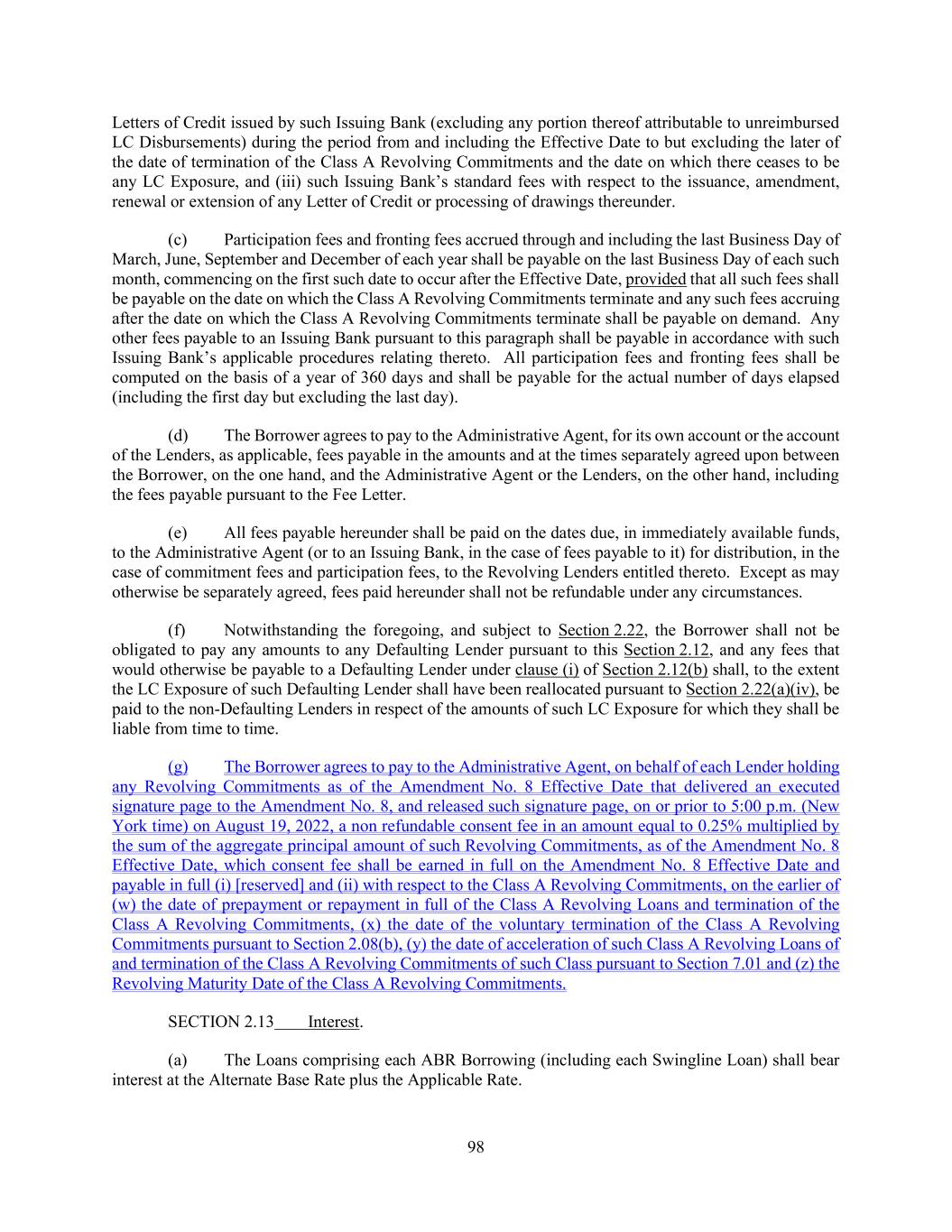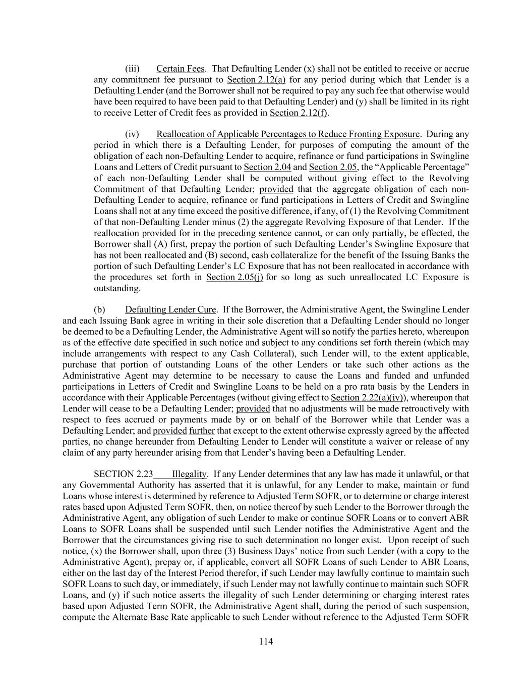 114 (iii) Certain Fees. That Defaulting Lender (x) shall not be entitled to receive or accrue any commitment fee pursuant to Section 2.12(a) for any period during which that Lender is a Defaulting Lender (and the Borrower shall not be required to pay any such fee that otherwise would have been required to have been paid to that Defaulting Lender) and (y) shall be limited in its right to receive Letter of Credit fees as provided in Section 2.12(f). (iv) Reallocation of Applicable Percentages to Reduce Fronting Exposure. During any period in which there is a Defaulting Lender, for purposes of computing the amount of the obligation of each non-Defaulting Lender to acquire, refinance or fund participations in Swingline Loans and Letters of Credit pursuant to Section 2.04 and Section 2.05, the “Applicable Percentage” of each non-Defaulting Lender shall be computed without giving effect to the Revolving Commitment of that Defaulting Lender; provided that the aggregate obligation of each non- Defaulting Lender to acquire, refinance or fund participations in Letters of Credit and Swingline Loans shall not at any time exceed the positive difference, if any, of (1) the Revolving Commitment of that non-Defaulting Lender minus (2) the aggregate Revolving Exposure of that Lender. If the reallocation provided for in the preceding sentence cannot, or can only partially, be effected, the Borrower shall (A) first, prepay the portion of such Defaulting Lender’s Swingline Exposure that has not been reallocated and (B) second, cash collateralize for the benefit of the Issuing Banks the portion of such Defaulting Lender’s LC Exposure that has not been reallocated in accordance with the procedures set forth in Section 2.05(j) for so long as such unreallocated LC Exposure is outstanding. (b) Defaulting Lender Cure. If the Borrower, the Administrative Agent, the Swingline Lender and each Issuing Bank agree in writing in their sole discretion that a Defaulting Lender should no longer be deemed to be a Defaulting Lender, the Administrative Agent will so notify the parties hereto, whereupon as of the effective date specified in such notice and subject to any conditions set forth therein (which may include arrangements with respect to any Cash Collateral), such Lender will, to the extent applicable, purchase that portion of outstanding Loans of the other Lenders or take such other actions as the Administrative Agent may determine to be necessary to cause the Loans and funded and unfunded participations in Letters of Credit and Swingline Loans to be held on a pro rata basis by the Lenders in accordance with their Applicable Percentages (without giving effect to Section 2.22(a)(iv)), whereupon that Lender will cease to be a Defaulting Lender; provided that no adjustments will be made retroactively with respect to fees accrued or payments made by or on behalf of the Borrower while that Lender was a Defaulting Lender; and provided further that except to the extent otherwise expressly agreed by the affected parties, no change hereunder from Defaulting Lender to Lender will constitute a waiver or release of any claim of any party hereunder arising from that Lender’s having been a Defaulting Lender. SECTION 2.23 Illegality. If any Lender determines that any law has made it unlawful, or that any Governmental Authority has asserted that it is unlawful, for any Lender to make, maintain or fund Loans whose interest is determined by reference to Adjusted Term SOFR, or to determine or charge interest rates based upon Adjusted Term SOFR, then, on notice thereof by such Lender to the Borrower through the Administrative Agent, any obligation of such Lender to make or continue SOFR Loans or to convert ABR Loans to SOFR Loans shall be suspended until such Lender notifies the Administrative Agent and the Borrower that the circumstances giving rise to such determination no longer exist. Upon receipt of such notice, (x) the Borrower shall, upon three (3) Business Days’ notice from such Lender (with a copy to the Administrative Agent), prepay or, if applicable, convert all SOFR Loans of such Lender to ABR Loans, either on the last day of the Interest Period therefor, if such Lender may lawfully continue to maintain such SOFR Loans to such day, or immediately, if such Lender may not lawfully continue to maintain such SOFR Loans, and (y) if such notice asserts the illegality of such Lender determining or charging interest rates based upon Adjusted Term SOFR, the Administrative Agent shall, during the period of such suspension, compute the Alternate Base Rate applicable to such Lender without reference to the Adjusted Term SOFR