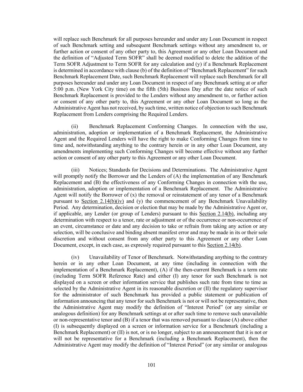 101 will replace such Benchmark for all purposes hereunder and under any Loan Document in respect of such Benchmark setting and subsequent Benchmark settings without any amendment to, or further action or consent of any other party to, this Agreement or any other Loan Document and the definition of “Adjusted Term SOFR” shall be deemed modified to delete the addition of the Term SOFR Adjustment to Term SOFR for any calculation and (y) if a Benchmark Replacement is determined in accordance with clause (b) of the definition of “Benchmark Replacement” for such Benchmark Replacement Date, such Benchmark Replacement will replace such Benchmark for all purposes hereunder and under any Loan Document in respect of any Benchmark setting at or after 5:00 p.m. (New York City time) on the fifth (5th) Business Day after the date notice of such Benchmark Replacement is provided to the Lenders without any amendment to, or further action or consent of any other party to, this Agreement or any other Loan Document so long as the Administrative Agent has not received, by such time, written notice of objection to such Benchmark Replacement from Lenders comprising the Required Lenders. (ii) Benchmark Replacement Conforming Changes. In connection with the use, administration, adoption or implementation of a Benchmark Replacement, the Administrative Agent and the Required Lenders will have the right to make Conforming Changes from time to time and, notwithstanding anything to the contrary herein or in any other Loan Document, any amendments implementing such Conforming Changes will become effective without any further action or consent of any other party to this Agreement or any other Loan Document. (iii) Notices; Standards for Decisions and Determinations. The Administrative Agent will promptly notify the Borrower and the Lenders of (A) the implementation of any Benchmark Replacement and (B) the effectiveness of any Conforming Changes in connection with the use, administration, adoption or implementation of a Benchmark Replacement. The Administrative Agent will notify the Borrower of (x) the removal or reinstatement of any tenor of a Benchmark pursuant to Section 2.14(b)(iv) and (y) the commencement of any Benchmark Unavailability Period. Any determination, decision or election that may be made by the Administrative Agent or, if applicable, any Lender (or group of Lenders) pursuant to this Section 2.14(b), including any determination with respect to a tenor, rate or adjustment or of the occurrence or non-occurrence of an event, circumstance or date and any decision to take or refrain from taking any action or any selection, will be conclusive and binding absent manifest error and may be made in its or their sole discretion and without consent from any other party to this Agreement or any other Loan Document, except, in each case, as expressly required pursuant to this Section 2.14(b). (iv) Unavailability of Tenor of Benchmark. Notwithstanding anything to the contrary herein or in any other Loan Document, at any time (including in connection with the implementation of a Benchmark Replacement), (A) if the then-current Benchmark is a term rate (including Term SOFR Reference Rate) and either (I) any tenor for such Benchmark is not displayed on a screen or other information service that publishes such rate from time to time as selected by the Administrative Agent in its reasonable discretion or (II) the regulatory supervisor for the administrator of such Benchmark has provided a public statement or publication of information announcing that any tenor for such Benchmark is not or will not be representative, then the Administrative Agent may modify the definition of “Interest Period” (or any similar or analogous definition) for any Benchmark settings at or after such time to remove such unavailable or non-representative tenor and (B) if a tenor that was removed pursuant to clause (A) above either (I) is subsequently displayed on a screen or information service for a Benchmark (including a Benchmark Replacement) or (II) is not, or is no longer, subject to an announcement that it is not or will not be representative for a Benchmark (including a Benchmark Replacement), then the Administrative Agent may modify the definition of “Interest Period” (or any similar or analogous