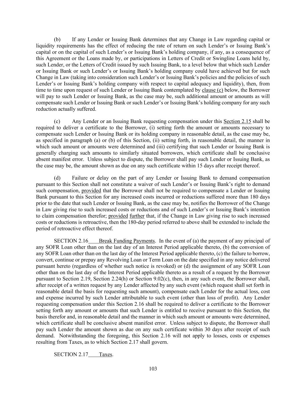 103 (b) If any Lender or Issuing Bank determines that any Change in Law regarding capital or liquidity requirements has the effect of reducing the rate of return on such Lender’s or Issuing Bank’s capital or on the capital of such Lender’s or Issuing Bank’s holding company, if any, as a consequence of this Agreement or the Loans made by, or participations in Letters of Credit or Swingline Loans held by, such Lender, or the Letters of Credit issued by such Issuing Bank, to a level below that which such Lender or Issuing Bank or such Lender’s or Issuing Bank’s holding company could have achieved but for such Change in Law (taking into consideration such Lender’s or Issuing Bank’s policies and the policies of such Lender’s or Issuing Bank’s holding company with respect to capital adequacy and liquidity), then, from time to time upon request of such Lender or Issuing Bank contemplated by clause (c) below, the Borrower will pay to such Lender or Issuing Bank, as the case may be, such additional amount or amounts as will compensate such Lender or Issuing Bank or such Lender’s or Issuing Bank’s holding company for any such reduction actually suffered. (c) Any Lender or an Issuing Bank requesting compensation under this Section 2.15 shall be required to deliver a certificate to the Borrower, (i) setting forth the amount or amounts necessary to compensate such Lender or Issuing Bank or its holding company in reasonable detail, as the case may be, as specified in paragraph (a) or (b) of this Section, (ii) setting forth, in reasonable detail, the manner in which such amount or amounts were determined and (iii) certifying that such Lender or Issuing Bank is generally charging such amounts to similarly situated borrowers, which certificate shall be conclusive absent manifest error. Unless subject to dispute, the Borrower shall pay such Lender or Issuing Bank, as the case may be, the amount shown as due on any such certificate within 15 days after receipt thereof. (d) Failure or delay on the part of any Lender or Issuing Bank to demand compensation pursuant to this Section shall not constitute a waiver of such Lender’s or Issuing Bank’s right to demand such compensation, provided that the Borrower shall not be required to compensate a Lender or Issuing Bank pursuant to this Section for any increased costs incurred or reductions suffered more than 180 days prior to the date that such Lender or Issuing Bank, as the case may be, notifies the Borrower of the Change in Law giving rise to such increased costs or reductions and of such Lender’s or Issuing Bank’s intention to claim compensation therefor; provided further that, if the Change in Law giving rise to such increased costs or reductions is retroactive, then the 180-day period referred to above shall be extended to include the period of retroactive effect thereof. SECTION 2.16 Break Funding Payments. In the event of (a) the payment of any principal of any SOFR Loan other than on the last day of an Interest Period applicable thereto, (b) the conversion of any SOFR Loan other than on the last day of the Interest Period applicable thereto, (c) the failure to borrow, convert, continue or prepay any Revolving Loan or Term Loan on the date specified in any notice delivered pursuant hereto (regardless of whether such notice is revoked) or (d) the assignment of any SOFR Loan other than on the last day of the Interest Period applicable thereto as a result of a request by the Borrower pursuant to Section 2.19, Section 2.24(h) or Section 9.02(c), then, in any such event, the Borrower shall, after receipt of a written request by any Lender affected by any such event (which request shall set forth in reasonable detail the basis for requesting such amount), compensate each Lender for the actual loss, cost and expense incurred by such Lender attributable to such event (other than loss of profit). Any Lender requesting compensation under this Section 2.16 shall be required to deliver a certificate to the Borrower setting forth any amount or amounts that such Lender is entitled to receive pursuant to this Section, the basis therefor and, in reasonable detail and the manner in which such amount or amounts were determined, which certificate shall be conclusive absent manifest error. Unless subject to dispute, the Borrower shall pay such Lender the amount shown as due on any such certificate within 30 days after receipt of such demand. Notwithstanding the foregoing, this Section 2.16 will not apply to losses, costs or expenses resulting from Taxes, as to which Section 2.17 shall govern. SECTION 2.17 Taxes.