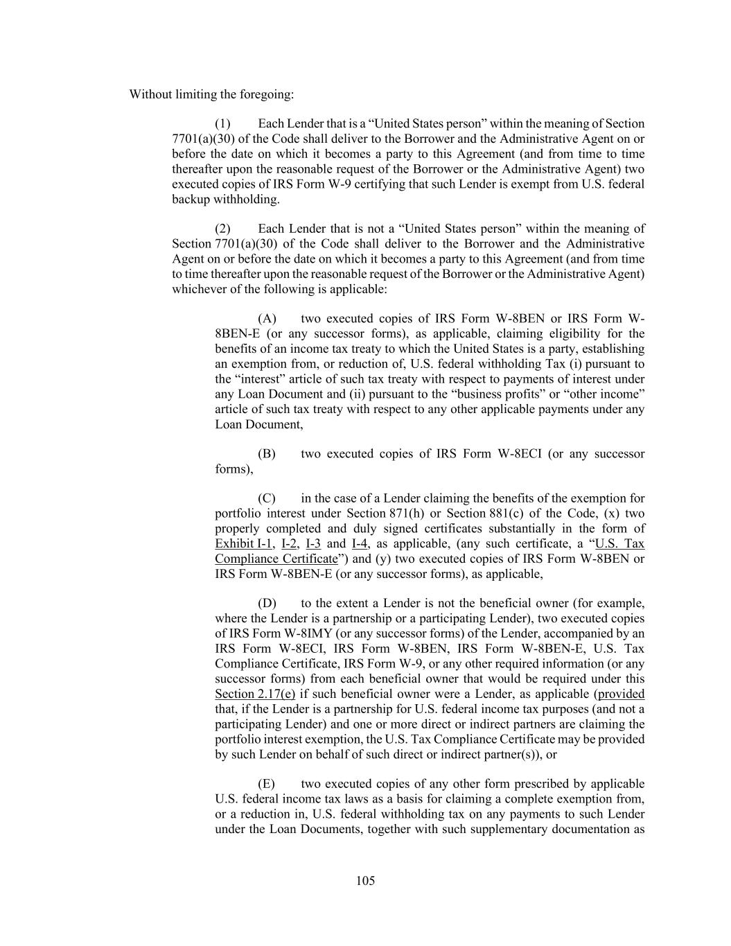 105 Without limiting the foregoing: (1) Each Lender that is a “United States person” within the meaning of Section 7701(a)(30) of the Code shall deliver to the Borrower and the Administrative Agent on or before the date on which it becomes a party to this Agreement (and from time to time thereafter upon the reasonable request of the Borrower or the Administrative Agent) two executed copies of IRS Form W-9 certifying that such Lender is exempt from U.S. federal backup withholding. (2) Each Lender that is not a “United States person” within the meaning of Section 7701(a)(30) of the Code shall deliver to the Borrower and the Administrative Agent on or before the date on which it becomes a party to this Agreement (and from time to time thereafter upon the reasonable request of the Borrower or the Administrative Agent) whichever of the following is applicable: (A) two executed copies of IRS Form W-8BEN or IRS Form W- 8BEN-E (or any successor forms), as applicable, claiming eligibility for the benefits of an income tax treaty to which the United States is a party, establishing an exemption from, or reduction of, U.S. federal withholding Tax (i) pursuant to the “interest” article of such tax treaty with respect to payments of interest under any Loan Document and (ii) pursuant to the “business profits” or “other income” article of such tax treaty with respect to any other applicable payments under any Loan Document, (B) two executed copies of IRS Form W-8ECI (or any successor forms), (C) in the case of a Lender claiming the benefits of the exemption for portfolio interest under Section 871(h) or Section 881(c) of the Code, (x) two properly completed and duly signed certificates substantially in the form of Exhibit I-1, I-2, I-3 and I-4, as applicable, (any such certificate, a “U.S. Tax Compliance Certificate”) and (y) two executed copies of IRS Form W-8BEN or IRS Form W-8BEN-E (or any successor forms), as applicable, (D) to the extent a Lender is not the beneficial owner (for example, where the Lender is a partnership or a participating Lender), two executed copies of IRS Form W-8IMY (or any successor forms) of the Lender, accompanied by an IRS Form W-8ECI, IRS Form W-8BEN, IRS Form W-8BEN-E, U.S. Tax Compliance Certificate, IRS Form W-9, or any other required information (or any successor forms) from each beneficial owner that would be required under this Section 2.17(e) if such beneficial owner were a Lender, as applicable (provided that, if the Lender is a partnership for U.S. federal income tax purposes (and not a participating Lender) and one or more direct or indirect partners are claiming the portfolio interest exemption, the U.S. Tax Compliance Certificate may be provided by such Lender on behalf of such direct or indirect partner(s)), or (E) two executed copies of any other form prescribed by applicable U.S. federal income tax laws as a basis for claiming a complete exemption from, or a reduction in, U.S. federal withholding tax on any payments to such Lender under the Loan Documents, together with such supplementary documentation as