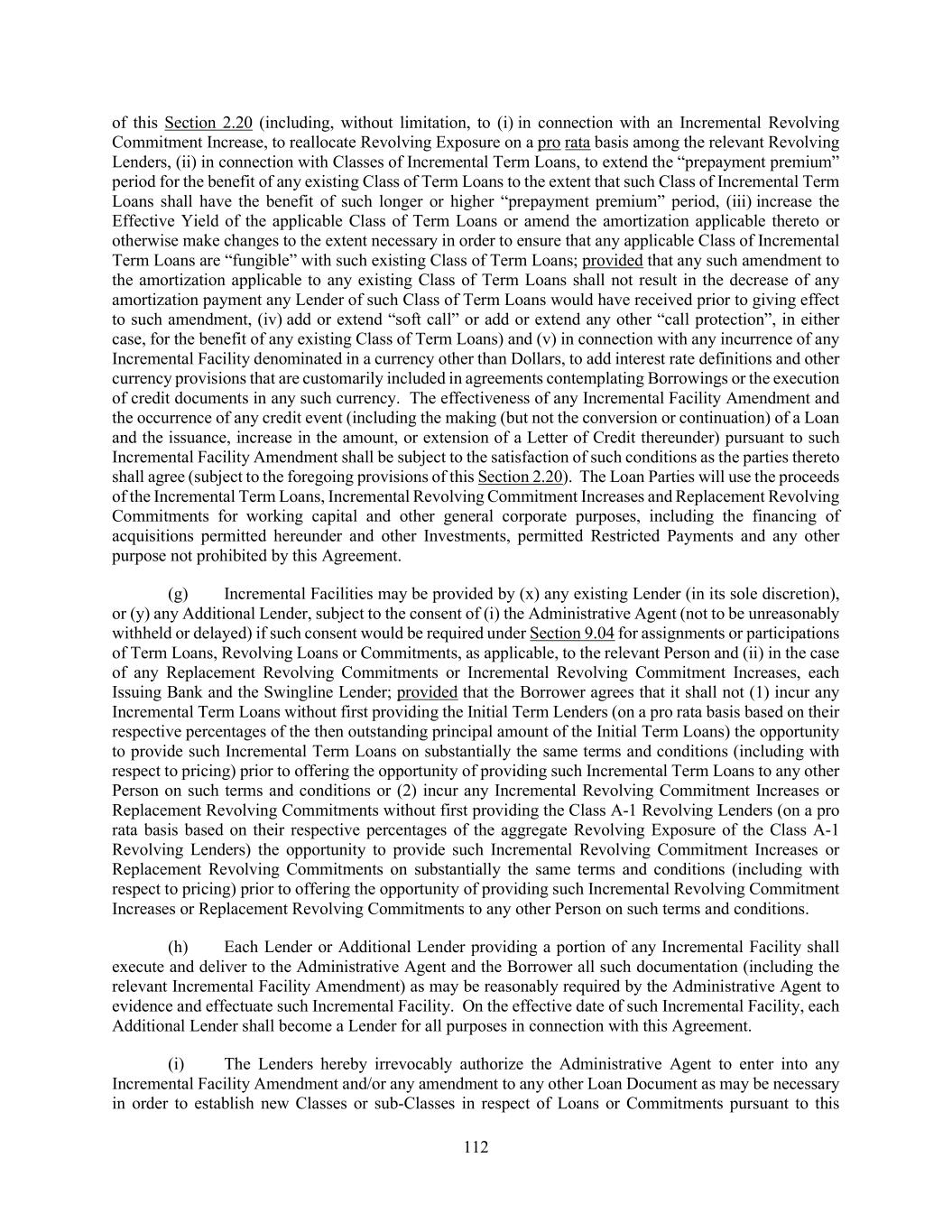 112 of this Section 2.20 (including, without limitation, to (i) in connection with an Incremental Revolving Commitment Increase, to reallocate Revolving Exposure on a pro rata basis among the relevant Revolving Lenders, (ii) in connection with Classes of Incremental Term Loans, to extend the “prepayment premium” period for the benefit of any existing Class of Term Loans to the extent that such Class of Incremental Term Loans shall have the benefit of such longer or higher “prepayment premium” period, (iii) increase the Effective Yield of the applicable Class of Term Loans or amend the amortization applicable thereto or otherwise make changes to the extent necessary in order to ensure that any applicable Class of Incremental Term Loans are “fungible” with such existing Class of Term Loans; provided that any such amendment to the amortization applicable to any existing Class of Term Loans shall not result in the decrease of any amortization payment any Lender of such Class of Term Loans would have received prior to giving effect to such amendment, (iv) add or extend “soft call” or add or extend any other “call protection”, in either case, for the benefit of any existing Class of Term Loans) and (v) in connection with any incurrence of any Incremental Facility denominated in a currency other than Dollars, to add interest rate definitions and other currency provisions that are customarily included in agreements contemplating Borrowings or the execution of credit documents in any such currency. The effectiveness of any Incremental Facility Amendment and the occurrence of any credit event (including the making (but not the conversion or continuation) of a Loan and the issuance, increase in the amount, or extension of a Letter of Credit thereunder) pursuant to such Incremental Facility Amendment shall be subject to the satisfaction of such conditions as the parties thereto shall agree (subject to the foregoing provisions of this Section 2.20). The Loan Parties will use the proceeds of the Incremental Term Loans, Incremental Revolving Commitment Increases and Replacement Revolving Commitments for working capital and other general corporate purposes, including the financing of acquisitions permitted hereunder and other Investments, permitted Restricted Payments and any other purpose not prohibited by this Agreement. (g) Incremental Facilities may be provided by (x) any existing Lender (in its sole discretion), or (y) any Additional Lender, subject to the consent of (i) the Administrative Agent (not to be unreasonably withheld or delayed) if such consent would be required under Section 9.04 for assignments or participations of Term Loans, Revolving Loans or Commitments, as applicable, to the relevant Person and (ii) in the case of any Replacement Revolving Commitments or Incremental Revolving Commitment Increases, each Issuing Bank and the Swingline Lender; provided that the Borrower agrees that it shall not (1) incur any Incremental Term Loans without first providing the Initial Term Lenders (on a pro rata basis based on their respective percentages of the then outstanding principal amount of the Initial Term Loans) the opportunity to provide such Incremental Term Loans on substantially the same terms and conditions (including with respect to pricing) prior to offering the opportunity of providing such Incremental Term Loans to any other Person on such terms and conditions or (2) incur any Incremental Revolving Commitment Increases or Replacement Revolving Commitments without first providing the Class A-1 Revolving Lenders (on a pro rata basis based on their respective percentages of the aggregate Revolving Exposure of the Class A-1 Revolving Lenders) the opportunity to provide such Incremental Revolving Commitment Increases or Replacement Revolving Commitments on substantially the same terms and conditions (including with respect to pricing) prior to offering the opportunity of providing such Incremental Revolving Commitment Increases or Replacement Revolving Commitments to any other Person on such terms and conditions. (h) Each Lender or Additional Lender providing a portion of any Incremental Facility shall execute and deliver to the Administrative Agent and the Borrower all such documentation (including the relevant Incremental Facility Amendment) as may be reasonably required by the Administrative Agent to evidence and effectuate such Incremental Facility. On the effective date of such Incremental Facility, each Additional Lender shall become a Lender for all purposes in connection with this Agreement. (i) The Lenders hereby irrevocably authorize the Administrative Agent to enter into any Incremental Facility Amendment and/or any amendment to any other Loan Document as may be necessary in order to establish new Classes or sub-Classes in respect of Loans or Commitments pursuant to this