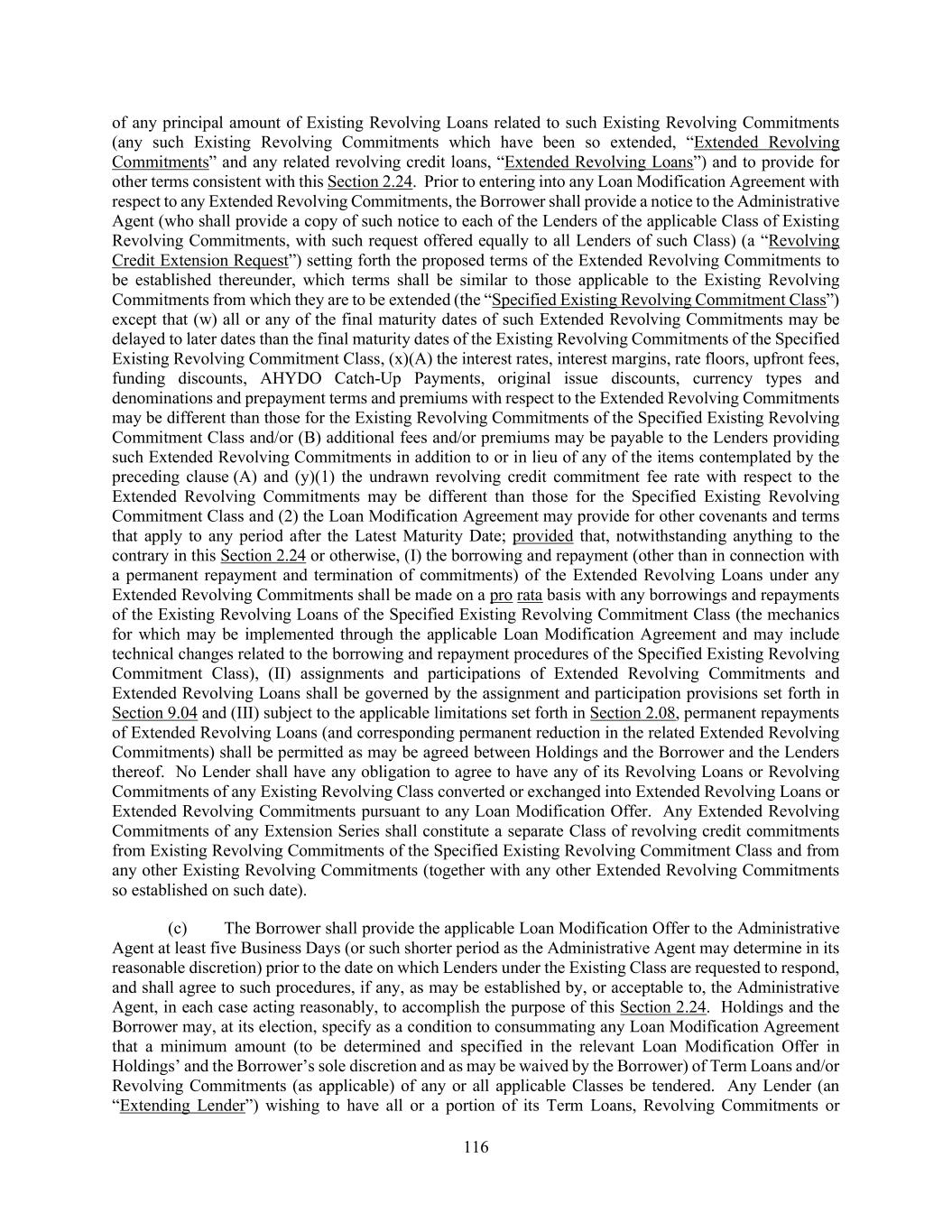 116 of any principal amount of Existing Revolving Loans related to such Existing Revolving Commitments (any such Existing Revolving Commitments which have been so extended, “Extended Revolving Commitments” and any related revolving credit loans, “Extended Revolving Loans”) and to provide for other terms consistent with this Section 2.24. Prior to entering into any Loan Modification Agreement with respect to any Extended Revolving Commitments, the Borrower shall provide a notice to the Administrative Agent (who shall provide a copy of such notice to each of the Lenders of the applicable Class of Existing Revolving Commitments, with such request offered equally to all Lenders of such Class) (a “Revolving Credit Extension Request”) setting forth the proposed terms of the Extended Revolving Commitments to be established thereunder, which terms shall be similar to those applicable to the Existing Revolving Commitments from which they are to be extended (the “Specified Existing Revolving Commitment Class”) except that (w) all or any of the final maturity dates of such Extended Revolving Commitments may be delayed to later dates than the final maturity dates of the Existing Revolving Commitments of the Specified Existing Revolving Commitment Class, (x)(A) the interest rates, interest margins, rate floors, upfront fees, funding discounts, AHYDO Catch-Up Payments, original issue discounts, currency types and denominations and prepayment terms and premiums with respect to the Extended Revolving Commitments may be different than those for the Existing Revolving Commitments of the Specified Existing Revolving Commitment Class and/or (B) additional fees and/or premiums may be payable to the Lenders providing such Extended Revolving Commitments in addition to or in lieu of any of the items contemplated by the preceding clause (A) and (y)(1) the undrawn revolving credit commitment fee rate with respect to the Extended Revolving Commitments may be different than those for the Specified Existing Revolving Commitment Class and (2) the Loan Modification Agreement may provide for other covenants and terms that apply to any period after the Latest Maturity Date; provided that, notwithstanding anything to the contrary in this Section 2.24 or otherwise, (I) the borrowing and repayment (other than in connection with a permanent repayment and termination of commitments) of the Extended Revolving Loans under any Extended Revolving Commitments shall be made on a pro rata basis with any borrowings and repayments of the Existing Revolving Loans of the Specified Existing Revolving Commitment Class (the mechanics for which may be implemented through the applicable Loan Modification Agreement and may include technical changes related to the borrowing and repayment procedures of the Specified Existing Revolving Commitment Class), (II) assignments and participations of Extended Revolving Commitments and Extended Revolving Loans shall be governed by the assignment and participation provisions set forth in Section 9.04 and (III) subject to the applicable limitations set forth in Section 2.08, permanent repayments of Extended Revolving Loans (and corresponding permanent reduction in the related Extended Revolving Commitments) shall be permitted as may be agreed between Holdings and the Borrower and the Lenders thereof. No Lender shall have any obligation to agree to have any of its Revolving Loans or Revolving Commitments of any Existing Revolving Class converted or exchanged into Extended Revolving Loans or Extended Revolving Commitments pursuant to any Loan Modification Offer. Any Extended Revolving Commitments of any Extension Series shall constitute a separate Class of revolving credit commitments from Existing Revolving Commitments of the Specified Existing Revolving Commitment Class and from any other Existing Revolving Commitments (together with any other Extended Revolving Commitments so established on such date). (c) The Borrower shall provide the applicable Loan Modification Offer to the Administrative Agent at least five Business Days (or such shorter period as the Administrative Agent may determine in its reasonable discretion) prior to the date on which Lenders under the Existing Class are requested to respond, and shall agree to such procedures, if any, as may be established by, or acceptable to, the Administrative Agent, in each case acting reasonably, to accomplish the purpose of this Section 2.24. Holdings and the Borrower may, at its election, specify as a condition to consummating any Loan Modification Agreement that a minimum amount (to be determined and specified in the relevant Loan Modification Offer in Holdings’ and the Borrower’s sole discretion and as may be waived by the Borrower) of Term Loans and/or Revolving Commitments (as applicable) of any or all applicable Classes be tendered. Any Lender (an “Extending Lender”) wishing to have all or a portion of its Term Loans, Revolving Commitments or