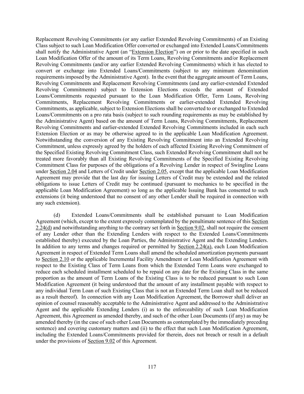 117 Replacement Revolving Commitments (or any earlier Extended Revolving Commitments) of an Existing Class subject to such Loan Modification Offer converted or exchanged into Extended Loans/Commitments shall notify the Administrative Agent (an “Extension Election”) on or prior to the date specified in such Loan Modification Offer of the amount of its Term Loans, Revolving Commitments and/or Replacement Revolving Commitments (and/or any earlier Extended Revolving Commitments) which it has elected to convert or exchange into Extended Loans/Commitments (subject to any minimum denomination requirements imposed by the Administrative Agent). In the event that the aggregate amount of Term Loans, Revolving Commitments and Replacement Revolving Commitments (and any earlier-extended Extended Revolving Commitments) subject to Extension Elections exceeds the amount of Extended Loans/Commitments requested pursuant to the Loan Modification Offer, Term Loans, Revolving Commitments, Replacement Revolving Commitments or earlier-extended Extended Revolving Commitments, as applicable, subject to Extension Elections shall be converted to or exchanged to Extended Loans/Commitments on a pro rata basis (subject to such rounding requirements as may be established by the Administrative Agent) based on the amount of Term Loans, Revolving Commitments, Replacement Revolving Commitments and earlier-extended Extended Revolving Commitments included in each such Extension Election or as may be otherwise agreed to in the applicable Loan Modification Agreement. Notwithstanding the conversion of any Existing Revolving Commitment into an Extended Revolving Commitment, unless expressly agreed by the holders of each affected Existing Revolving Commitment of the Specified Existing Revolving Commitment Class, such Extended Revolving Commitment shall not be treated more favorably than all Existing Revolving Commitments of the Specified Existing Revolving Commitment Class for purposes of the obligations of a Revolving Lender in respect of Swingline Loans under Section 2.04 and Letters of Credit under Section 2.05, except that the applicable Loan Modification Agreement may provide that the last day for issuing Letters of Credit may be extended and the related obligations to issue Letters of Credit may be continued (pursuant to mechanics to be specified in the applicable Loan Modification Agreement) so long as the applicable Issuing Bank has consented to such extensions (it being understood that no consent of any other Lender shall be required in connection with any such extension). (d) Extended Loans/Commitments shall be established pursuant to Loan Modification Agreement (which, except to the extent expressly contemplated by the penultimate sentence of this Section 2.24(d) and notwithstanding anything to the contrary set forth in Section 9.02, shall not require the consent of any Lender other than the Extending Lenders with respect to the Extended Loans/Commitments established thereby) executed by the Loan Parties, the Administrative Agent and the Extending Lenders. In addition to any terms and changes required or permitted by Section 2.24(a), each Loan Modification Agreement in respect of Extended Term Loans shall amend the scheduled amortization payments pursuant to Section 2.10 or the applicable Incremental Facility Amendment or Loan Modification Agreement with respect to the Existing Class of Term Loans from which the Extended Term Loans were exchanged to reduce each scheduled installment scheduled to be repaid on any date for the Existing Class in the same proportion as the amount of Term Loans of the Existing Class is to be reduced pursuant to such Loan Modification Agreement (it being understood that the amount of any installment payable with respect to any individual Term Loan of such Existing Class that is not an Extended Term Loan shall not be reduced as a result thereof). In connection with any Loan Modification Agreement, the Borrower shall deliver an opinion of counsel reasonably acceptable to the Administrative Agent and addressed to the Administrative Agent and the applicable Extending Lenders (i) as to the enforceability of such Loan Modification Agreement, this Agreement as amended thereby, and such of the other Loan Documents (if any) as may be amended thereby (in the case of such other Loan Documents as contemplated by the immediately preceding sentence) and covering customary matters and (ii) to the effect that such Loan Modification Agreement, including the Extended Loans/Commitments provided for therein, does not breach or result in a default under the provisions of Section 9.02 of this Agreement.