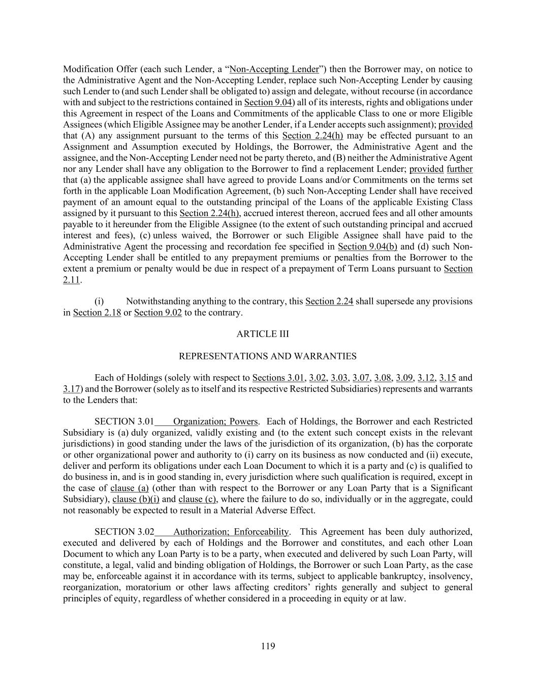 119 Modification Offer (each such Lender, a “Non-Accepting Lender”) then the Borrower may, on notice to the Administrative Agent and the Non-Accepting Lender, replace such Non-Accepting Lender by causing such Lender to (and such Lender shall be obligated to) assign and delegate, without recourse (in accordance with and subject to the restrictions contained in Section 9.04) all of its interests, rights and obligations under this Agreement in respect of the Loans and Commitments of the applicable Class to one or more Eligible Assignees (which Eligible Assignee may be another Lender, if a Lender accepts such assignment); provided that (A) any assignment pursuant to the terms of this Section 2.24(h) may be effected pursuant to an Assignment and Assumption executed by Holdings, the Borrower, the Administrative Agent and the assignee, and the Non-Accepting Lender need not be party thereto, and (B) neither the Administrative Agent nor any Lender shall have any obligation to the Borrower to find a replacement Lender; provided further that (a) the applicable assignee shall have agreed to provide Loans and/or Commitments on the terms set forth in the applicable Loan Modification Agreement, (b) such Non-Accepting Lender shall have received payment of an amount equal to the outstanding principal of the Loans of the applicable Existing Class assigned by it pursuant to this Section 2.24(h), accrued interest thereon, accrued fees and all other amounts payable to it hereunder from the Eligible Assignee (to the extent of such outstanding principal and accrued interest and fees), (c) unless waived, the Borrower or such Eligible Assignee shall have paid to the Administrative Agent the processing and recordation fee specified in Section 9.04(b) and (d) such Non- Accepting Lender shall be entitled to any prepayment premiums or penalties from the Borrower to the extent a premium or penalty would be due in respect of a prepayment of Term Loans pursuant to Section 2.11. (i) Notwithstanding anything to the contrary, this Section 2.24 shall supersede any provisions in Section 2.18 or Section 9.02 to the contrary. ARTICLE III REPRESENTATIONS AND WARRANTIES Each of Holdings (solely with respect to Sections 3.01, 3.02, 3.03, 3.07, 3.08, 3.09, 3.12, 3.15 and 3.17) and the Borrower (solely as to itself and its respective Restricted Subsidiaries) represents and warrants to the Lenders that: SECTION 3.01 Organization; Powers. Each of Holdings, the Borrower and each Restricted Subsidiary is (a) duly organized, validly existing and (to the extent such concept exists in the relevant jurisdictions) in good standing under the laws of the jurisdiction of its organization, (b) has the corporate or other organizational power and authority to (i) carry on its business as now conducted and (ii) execute, deliver and perform its obligations under each Loan Document to which it is a party and (c) is qualified to do business in, and is in good standing in, every jurisdiction where such qualification is required, except in the case of clause (a) (other than with respect to the Borrower or any Loan Party that is a Significant Subsidiary), clause (b)(i) and clause (c), where the failure to do so, individually or in the aggregate, could not reasonably be expected to result in a Material Adverse Effect. SECTION 3.02 Authorization; Enforceability. This Agreement has been duly authorized, executed and delivered by each of Holdings and the Borrower and constitutes, and each other Loan Document to which any Loan Party is to be a party, when executed and delivered by such Loan Party, will constitute, a legal, valid and binding obligation of Holdings, the Borrower or such Loan Party, as the case may be, enforceable against it in accordance with its terms, subject to applicable bankruptcy, insolvency, reorganization, moratorium or other laws affecting creditors’ rights generally and subject to general principles of equity, regardless of whether considered in a proceeding in equity or at law.