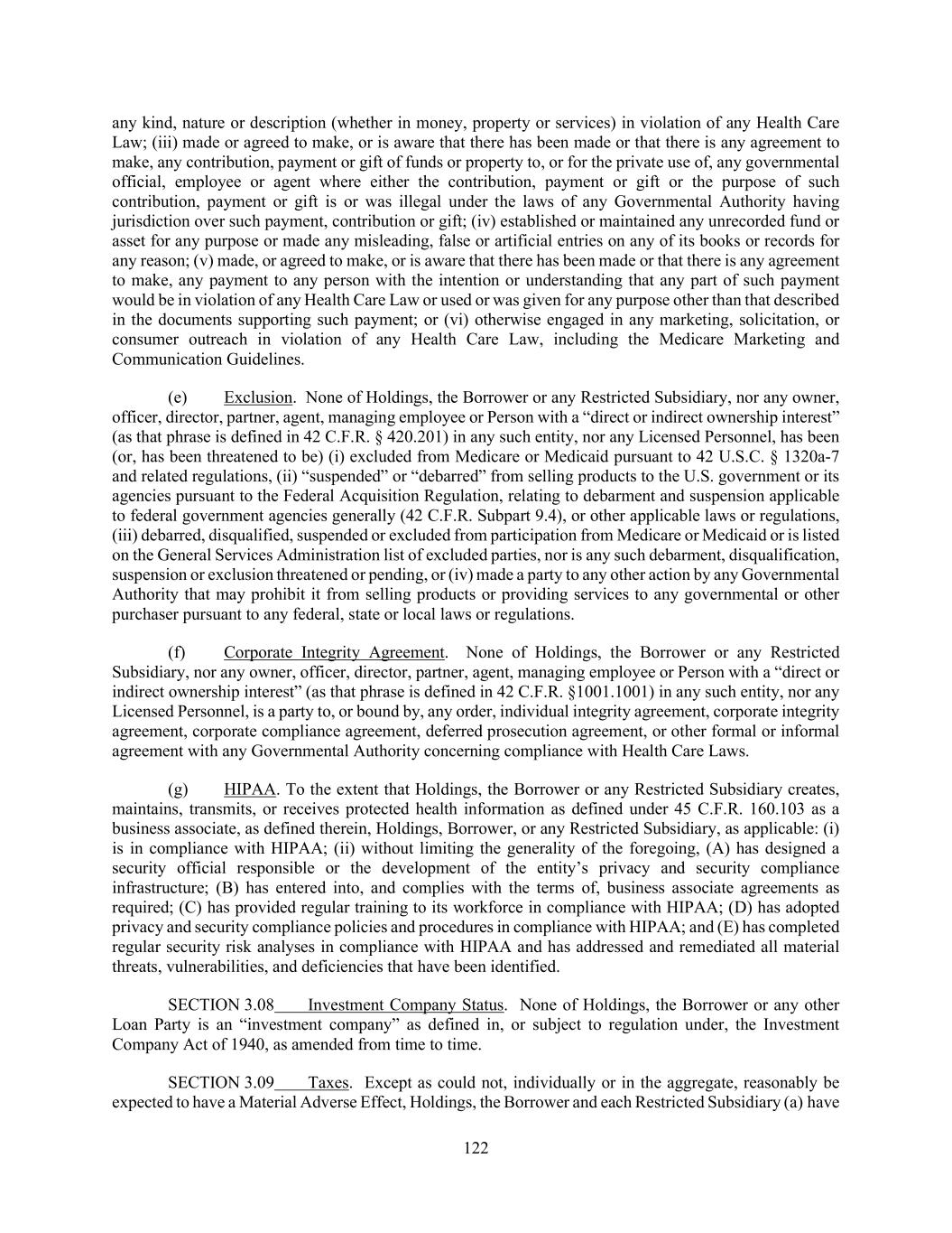 122 any kind, nature or description (whether in money, property or services) in violation of any Health Care Law; (iii) made or agreed to make, or is aware that there has been made or that there is any agreement to make, any contribution, payment or gift of funds or property to, or for the private use of, any governmental official, employee or agent where either the contribution, payment or gift or the purpose of such contribution, payment or gift is or was illegal under the laws of any Governmental Authority having jurisdiction over such payment, contribution or gift; (iv) established or maintained any unrecorded fund or asset for any purpose or made any misleading, false or artificial entries on any of its books or records for any reason; (v) made, or agreed to make, or is aware that there has been made or that there is any agreement to make, any payment to any person with the intention or understanding that any part of such payment would be in violation of any Health Care Law or used or was given for any purpose other than that described in the documents supporting such payment; or (vi) otherwise engaged in any marketing, solicitation, or consumer outreach in violation of any Health Care Law, including the Medicare Marketing and Communication Guidelines. (e) Exclusion. None of Holdings, the Borrower or any Restricted Subsidiary, nor any owner, officer, director, partner, agent, managing employee or Person with a “direct or indirect ownership interest” (as that phrase is defined in 42 C.F.R. § 420.201) in any such entity, nor any Licensed Personnel, has been (or, has been threatened to be) (i) excluded from Medicare or Medicaid pursuant to 42 U.S.C. § 1320a-7 and related regulations, (ii) “suspended” or “debarred” from selling products to the U.S. government or its agencies pursuant to the Federal Acquisition Regulation, relating to debarment and suspension applicable to federal government agencies generally (42 C.F.R. Subpart 9.4), or other applicable laws or regulations, (iii) debarred, disqualified, suspended or excluded from participation from Medicare or Medicaid or is listed on the General Services Administration list of excluded parties, nor is any such debarment, disqualification, suspension or exclusion threatened or pending, or (iv) made a party to any other action by any Governmental Authority that may prohibit it from selling products or providing services to any governmental or other purchaser pursuant to any federal, state or local laws or regulations. (f) Corporate Integrity Agreement. None of Holdings, the Borrower or any Restricted Subsidiary, nor any owner, officer, director, partner, agent, managing employee or Person with a “direct or indirect ownership interest” (as that phrase is defined in 42 C.F.R. §1001.1001) in any such entity, nor any Licensed Personnel, is a party to, or bound by, any order, individual integrity agreement, corporate integrity agreement, corporate compliance agreement, deferred prosecution agreement, or other formal or informal agreement with any Governmental Authority concerning compliance with Health Care Laws. (g) HIPAA. To the extent that Holdings, the Borrower or any Restricted Subsidiary creates, maintains, transmits, or receives protected health information as defined under 45 C.F.R. 160.103 as a business associate, as defined therein, Holdings, Borrower, or any Restricted Subsidiary, as applicable: (i) is in compliance with HIPAA; (ii) without limiting the generality of the foregoing, (A) has designed a security official responsible or the development of the entity’s privacy and security compliance infrastructure; (B) has entered into, and complies with the terms of, business associate agreements as required; (C) has provided regular training to its workforce in compliance with HIPAA; (D) has adopted privacy and security compliance policies and procedures in compliance with HIPAA; and (E) has completed regular security risk analyses in compliance with HIPAA and has addressed and remediated all material threats, vulnerabilities, and deficiencies that have been identified. SECTION 3.08 Investment Company Status. None of Holdings, the Borrower or any other Loan Party is an “investment company” as defined in, or subject to regulation under, the Investment Company Act of 1940, as amended from time to time. SECTION 3.09 Taxes. Except as could not, individually or in the aggregate, reasonably be expected to have a Material Adverse Effect, Holdings, the Borrower and each Restricted Subsidiary (a) have