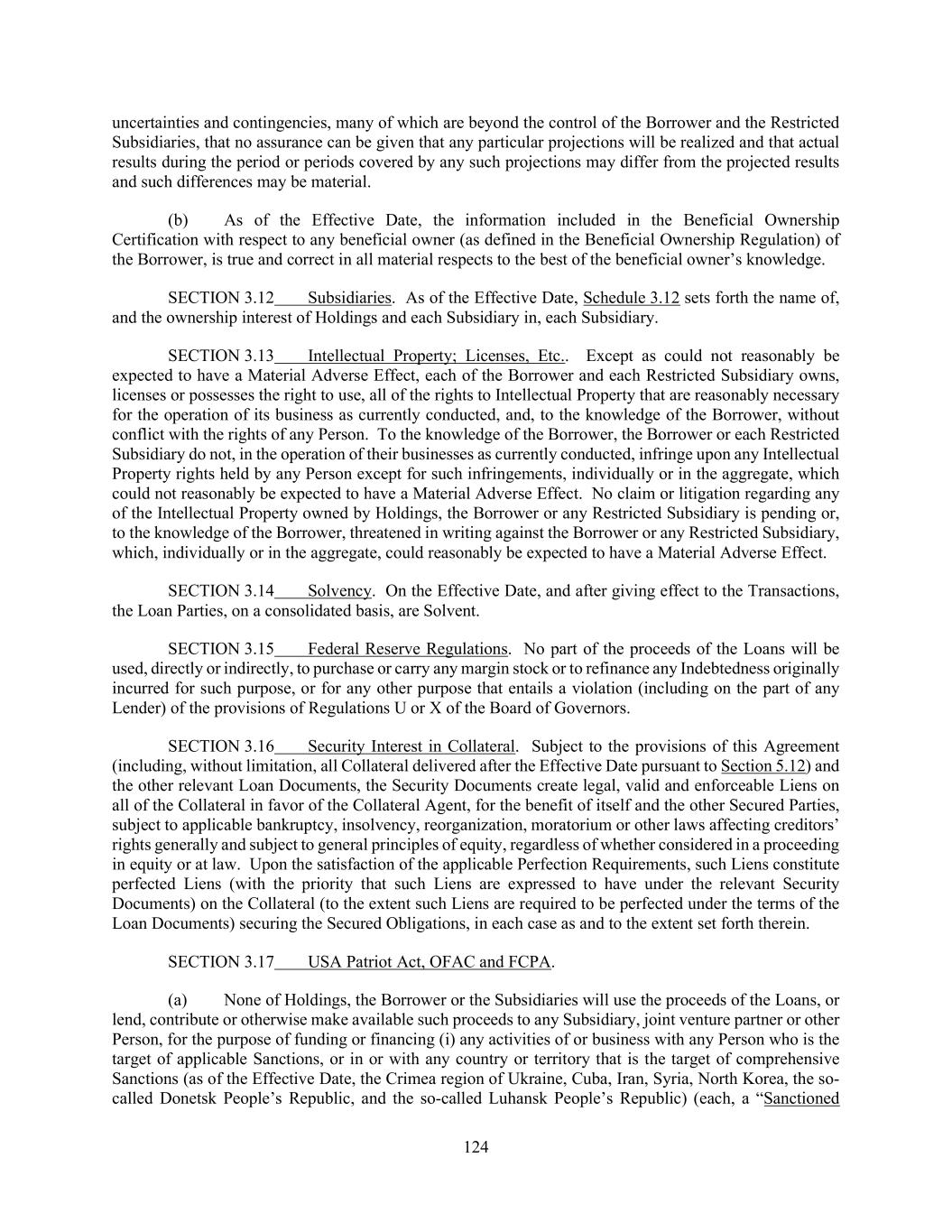 124 uncertainties and contingencies, many of which are beyond the control of the Borrower and the Restricted Subsidiaries, that no assurance can be given that any particular projections will be realized and that actual results during the period or periods covered by any such projections may differ from the projected results and such differences may be material. (b) As of the Effective Date, the information included in the Beneficial Ownership Certification with respect to any beneficial owner (as defined in the Beneficial Ownership Regulation) of the Borrower, is true and correct in all material respects to the best of the beneficial owner’s knowledge. SECTION 3.12 Subsidiaries. As of the Effective Date, Schedule 3.12 sets forth the name of, and the ownership interest of Holdings and each Subsidiary in, each Subsidiary. SECTION 3.13 Intellectual Property; Licenses, Etc.. Except as could not reasonably be expected to have a Material Adverse Effect, each of the Borrower and each Restricted Subsidiary owns, licenses or possesses the right to use, all of the rights to Intellectual Property that are reasonably necessary for the operation of its business as currently conducted, and, to the knowledge of the Borrower, without conflict with the rights of any Person. To the knowledge of the Borrower, the Borrower or each Restricted Subsidiary do not, in the operation of their businesses as currently conducted, infringe upon any Intellectual Property rights held by any Person except for such infringements, individually or in the aggregate, which could not reasonably be expected to have a Material Adverse Effect. No claim or litigation regarding any of the Intellectual Property owned by Holdings, the Borrower or any Restricted Subsidiary is pending or, to the knowledge of the Borrower, threatened in writing against the Borrower or any Restricted Subsidiary, which, individually or in the aggregate, could reasonably be expected to have a Material Adverse Effect. SECTION 3.14 Solvency. On the Effective Date, and after giving effect to the Transactions, the Loan Parties, on a consolidated basis, are Solvent. SECTION 3.15 Federal Reserve Regulations. No part of the proceeds of the Loans will be used, directly or indirectly, to purchase or carry any margin stock or to refinance any Indebtedness originally incurred for such purpose, or for any other purpose that entails a violation (including on the part of any Lender) of the provisions of Regulations U or X of the Board of Governors. SECTION 3.16 Security Interest in Collateral. Subject to the provisions of this Agreement (including, without limitation, all Collateral delivered after the Effective Date pursuant to Section 5.12) and the other relevant Loan Documents, the Security Documents create legal, valid and enforceable Liens on all of the Collateral in favor of the Collateral Agent, for the benefit of itself and the other Secured Parties, subject to applicable bankruptcy, insolvency, reorganization, moratorium or other laws affecting creditors’ rights generally and subject to general principles of equity, regardless of whether considered in a proceeding in equity or at law. Upon the satisfaction of the applicable Perfection Requirements, such Liens constitute perfected Liens (with the priority that such Liens are expressed to have under the relevant Security Documents) on the Collateral (to the extent such Liens are required to be perfected under the terms of the Loan Documents) securing the Secured Obligations, in each case as and to the extent set forth therein. SECTION 3.17 USA Patriot Act, OFAC and FCPA. (a) None of Holdings, the Borrower or the Subsidiaries will use the proceeds of the Loans, or lend, contribute or otherwise make available such proceeds to any Subsidiary, joint venture partner or other Person, for the purpose of funding or financing (i) any activities of or business with any Person who is the target of applicable Sanctions, or in or with any country or territory that is the target of comprehensive Sanctions (as of the Effective Date, the Crimea region of Ukraine, Cuba, Iran, Syria, North Korea, the so- called Donetsk People’s Republic, and the so-called Luhansk People’s Republic) (each, a “Sanctioned