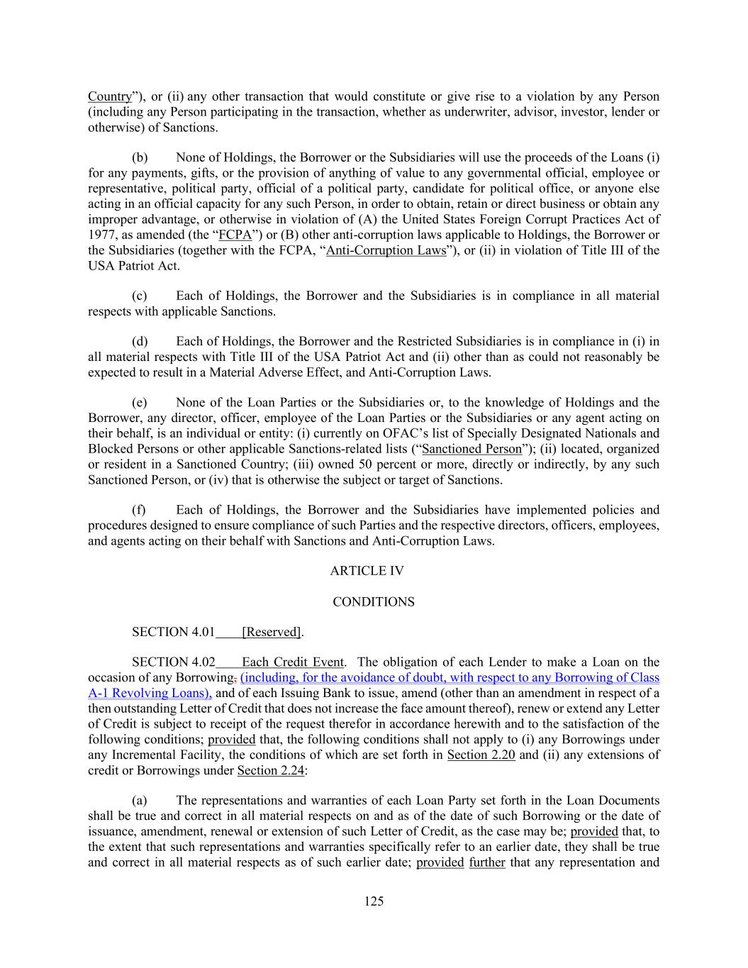 125 Country”), or (ii) any other transaction that would constitute or give rise to a violation by any Person (including any Person participating in the transaction, whether as underwriter, advisor, investor, lender or otherwise) of Sanctions. (b) None of Holdings, the Borrower or the Subsidiaries will use the proceeds of the Loans (i) for any payments, gifts, or the provision of anything of value to any governmental official, employee or representative, political party, official of a political party, candidate for political office, or anyone else acting in an official capacity for any such Person, in order to obtain, retain or direct business or obtain any improper advantage, or otherwise in violation of (A) the United States Foreign Corrupt Practices Act of 1977, as amended (the “FCPA”) or (B) other anti-corruption laws applicable to Holdings, the Borrower or the Subsidiaries (together with the FCPA, “Anti-Corruption Laws”), or (ii) in violation of Title III of the USA Patriot Act. (c) Each of Holdings, the Borrower and the Subsidiaries is in compliance in all material respects with applicable Sanctions. (d) Each of Holdings, the Borrower and the Restricted Subsidiaries is in compliance in (i) in all material respects with Title III of the USA Patriot Act and (ii) other than as could not reasonably be expected to result in a Material Adverse Effect, and Anti-Corruption Laws. (e) None of the Loan Parties or the Subsidiaries or, to the knowledge of Holdings and the Borrower, any director, officer, employee of the Loan Parties or the Subsidiaries or any agent acting on their behalf, is an individual or entity: (i) currently on OFAC’s list of Specially Designated Nationals and Blocked Persons or other applicable Sanctions-related lists (“Sanctioned Person”); (ii) located, organized or resident in a Sanctioned Country; (iii) owned 50 percent or more, directly or indirectly, by any such Sanctioned Person, or (iv) that is otherwise the subject or target of Sanctions. (f) Each of Holdings, the Borrower and the Subsidiaries have implemented policies and procedures designed to ensure compliance of such Parties and the respective directors, officers, employees, and agents acting on their behalf with Sanctions and Anti-Corruption Laws. ARTICLE IV CONDITIONS SECTION 4.01 [Reserved]. SECTION 4.02 Each Credit Event. The obligation of each Lender to make a Loan on the occasion of any Borrowing, (including, for the avoidance of doubt, with respect to any Borrowing of Class A-1 Revolving Loans), and of each Issuing Bank to issue, amend (other than an amendment in respect of a then outstanding Letter of Credit that does not increase the face amount thereof), renew or extend any Letter of Credit is subject to receipt of the request therefor in accordance herewith and to the satisfaction of the following conditions; provided that, the following conditions shall not apply to (i) any Borrowings under any Incremental Facility, the conditions of which are set forth in Section 2.20 and (ii) any extensions of credit or Borrowings under Section 2.24: (a) The representations and warranties of each Loan Party set forth in the Loan Documents shall be true and correct in all material respects on and as of the date of such Borrowing or the date of issuance, amendment, renewal or extension of such Letter of Credit, as the case may be; provided that, to the extent that such representations and warranties specifically refer to an earlier date, they shall be true and correct in all material respects as of such earlier date; provided further that any representation and