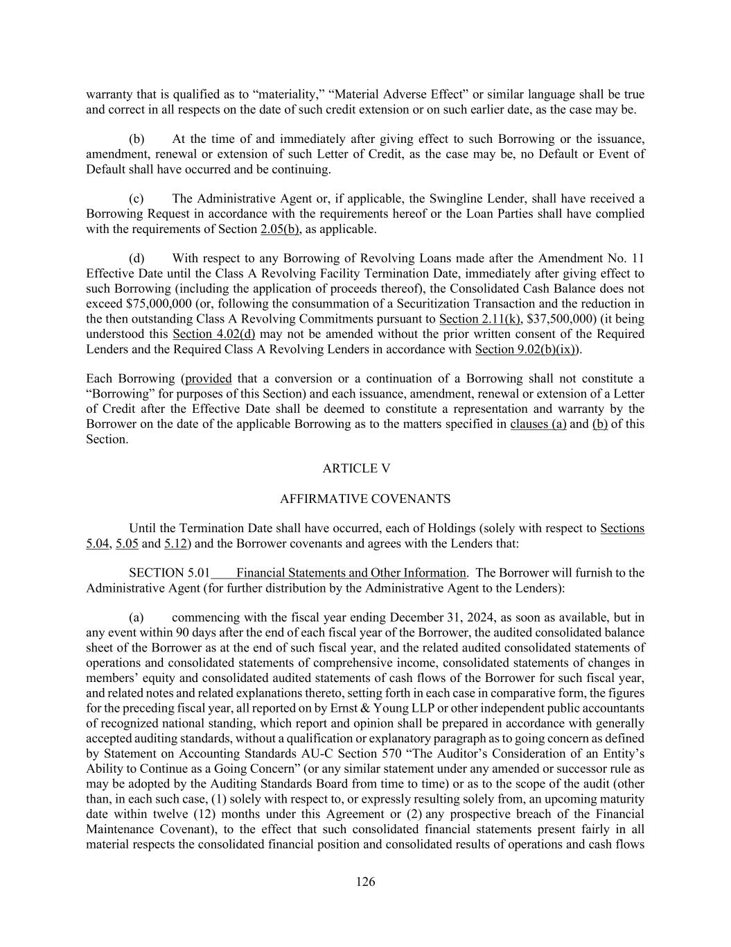 126 warranty that is qualified as to “materiality,” “Material Adverse Effect” or similar language shall be true and correct in all respects on the date of such credit extension or on such earlier date, as the case may be. (b) At the time of and immediately after giving effect to such Borrowing or the issuance, amendment, renewal or extension of such Letter of Credit, as the case may be, no Default or Event of Default shall have occurred and be continuing. (c) The Administrative Agent or, if applicable, the Swingline Lender, shall have received a Borrowing Request in accordance with the requirements hereof or the Loan Parties shall have complied with the requirements of Section 2.05(b), as applicable. (d) With respect to any Borrowing of Revolving Loans made after the Amendment No. 11 Effective Date until the Class A Revolving Facility Termination Date, immediately after giving effect to such Borrowing (including the application of proceeds thereof), the Consolidated Cash Balance does not exceed $75,000,000 (or, following the consummation of a Securitization Transaction and the reduction in the then outstanding Class A Revolving Commitments pursuant to Section 2.11(k), $37,500,000) (it being understood this Section 4.02(d) may not be amended without the prior written consent of the Required Lenders and the Required Class A Revolving Lenders in accordance with Section 9.02(b)(ix)). Each Borrowing (provided that a conversion or a continuation of a Borrowing shall not constitute a “Borrowing” for purposes of this Section) and each issuance, amendment, renewal or extension of a Letter of Credit after the Effective Date shall be deemed to constitute a representation and warranty by the Borrower on the date of the applicable Borrowing as to the matters specified in clauses (a) and (b) of this Section. ARTICLE V AFFIRMATIVE COVENANTS Until the Termination Date shall have occurred, each of Holdings (solely with respect to Sections 5.04, 5.05 and 5.12) and the Borrower covenants and agrees with the Lenders that: SECTION 5.01 Financial Statements and Other Information. The Borrower will furnish to the Administrative Agent (for further distribution by the Administrative Agent to the Lenders): (a) commencing with the fiscal year ending December 31, 2024, as soon as available, but in any event within 90 days after the end of each fiscal year of the Borrower, the audited consolidated balance sheet of the Borrower as at the end of such fiscal year, and the related audited consolidated statements of operations and consolidated statements of comprehensive income, consolidated statements of changes in members’ equity and consolidated audited statements of cash flows of the Borrower for such fiscal year, and related notes and related explanations thereto, setting forth in each case in comparative form, the figures for the preceding fiscal year, all reported on by Ernst & Young LLP or other independent public accountants of recognized national standing, which report and opinion shall be prepared in accordance with generally accepted auditing standards, without a qualification or explanatory paragraph as to going concern as defined by Statement on Accounting Standards AU-C Section 570 “The Auditor’s Consideration of an Entity’s Ability to Continue as a Going Concern” (or any similar statement under any amended or successor rule as may be adopted by the Auditing Standards Board from time to time) or as to the scope of the audit (other than, in each such case, (1) solely with respect to, or expressly resulting solely from, an upcoming maturity date within twelve (12) months under this Agreement or (2) any prospective breach of the Financial Maintenance Covenant), to the effect that such consolidated financial statements present fairly in all material respects the consolidated financial position and consolidated results of operations and cash flows