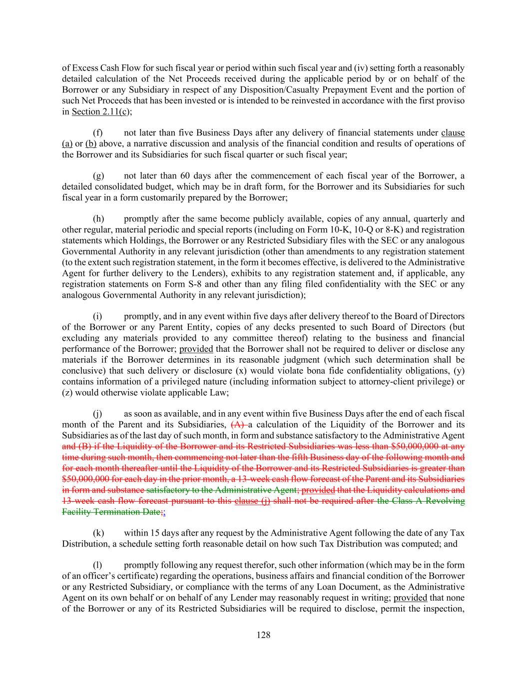 128 of Excess Cash Flow for such fiscal year or period within such fiscal year and (iv) setting forth a reasonably detailed calculation of the Net Proceeds received during the applicable period by or on behalf of the Borrower or any Subsidiary in respect of any Disposition/Casualty Prepayment Event and the portion of such Net Proceeds that has been invested or is intended to be reinvested in accordance with the first proviso in Section 2.11(c); (f) not later than five Business Days after any delivery of financial statements under clause (a) or (b) above, a narrative discussion and analysis of the financial condition and results of operations of the Borrower and its Subsidiaries for such fiscal quarter or such fiscal year; (g) not later than 60 days after the commencement of each fiscal year of the Borrower, a detailed consolidated budget, which may be in draft form, for the Borrower and its Subsidiaries for such fiscal year in a form customarily prepared by the Borrower; (h) promptly after the same become publicly available, copies of any annual, quarterly and other regular, material periodic and special reports (including on Form 10-K, 10-Q or 8-K) and registration statements which Holdings, the Borrower or any Restricted Subsidiary files with the SEC or any analogous Governmental Authority in any relevant jurisdiction (other than amendments to any registration statement (to the extent such registration statement, in the form it becomes effective, is delivered to the Administrative Agent for further delivery to the Lenders), exhibits to any registration statement and, if applicable, any registration statements on Form S-8 and other than any filing filed confidentiality with the SEC or any analogous Governmental Authority in any relevant jurisdiction); (i) promptly, and in any event within five days after delivery thereof to the Board of Directors of the Borrower or any Parent Entity, copies of any decks presented to such Board of Directors (but excluding any materials provided to any committee thereof) relating to the business and financial performance of the Borrower; provided that the Borrower shall not be required to deliver or disclose any materials if the Borrower determines in its reasonable judgment (which such determination shall be conclusive) that such delivery or disclosure (x) would violate bona fide confidentiality obligations, (y) contains information of a privileged nature (including information subject to attorney-client privilege) or (z) would otherwise violate applicable Law; (j) as soon as available, and in any event within five Business Days after the end of each fiscal month of the Parent and its Subsidiaries, (A) a calculation of the Liquidity of the Borrower and its Subsidiaries as of the last day of such month, in form and substance satisfactory to the Administrative Agent and (B) if the Liquidity of the Borrower and its Restricted Subsidiaries was less than $50,000,000 at any time during such month, then commencing not later than the fifth Business day of the following month and for each month thereafter until the Liquidity of the Borrower and its Restricted Subsidiaries is greater than $50,000,000 for each day in the prior month, a 13-week cash flow forecast of the Parent and its Subsidiaries in form and substance satisfactory to the Administrative Agent; provided that the Liquidity calculations and 13-week cash flow forecast pursuant to this clause (j) shall not be required after the Class A Revolving Facility Termination Date;; (k) within 15 days after any request by the Administrative Agent following the date of any Tax Distribution, a schedule setting forth reasonable detail on how such Tax Distribution was computed; and (l) promptly following any request therefor, such other information (which may be in the form of an officer’s certificate) regarding the operations, business affairs and financial condition of the Borrower or any Restricted Subsidiary, or compliance with the terms of any Loan Document, as the Administrative Agent on its own behalf or on behalf of any Lender may reasonably request in writing; provided that none of the Borrower or any of its Restricted Subsidiaries will be required to disclose, permit the inspection,
