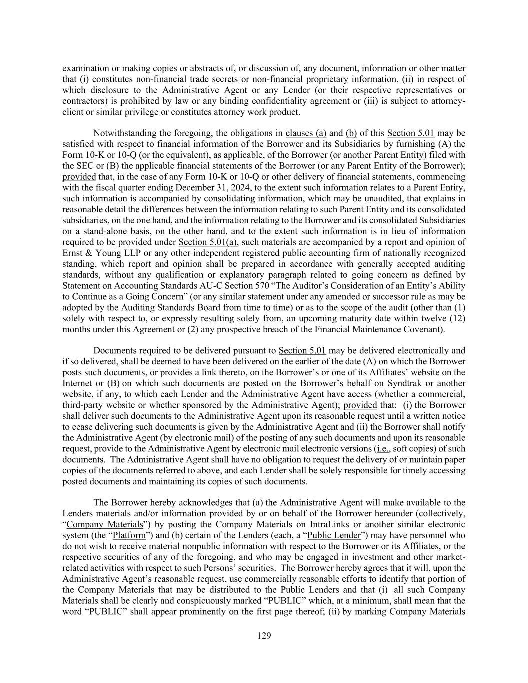 129 examination or making copies or abstracts of, or discussion of, any document, information or other matter that (i) constitutes non-financial trade secrets or non-financial proprietary information, (ii) in respect of which disclosure to the Administrative Agent or any Lender (or their respective representatives or contractors) is prohibited by law or any binding confidentiality agreement or (iii) is subject to attorney- client or similar privilege or constitutes attorney work product. Notwithstanding the foregoing, the obligations in clauses (a) and (b) of this Section 5.01 may be satisfied with respect to financial information of the Borrower and its Subsidiaries by furnishing (A) the Form 10-K or 10-Q (or the equivalent), as applicable, of the Borrower (or another Parent Entity) filed with the SEC or (B) the applicable financial statements of the Borrower (or any Parent Entity of the Borrower); provided that, in the case of any Form 10-K or 10-Q or other delivery of financial statements, commencing with the fiscal quarter ending December 31, 2024, to the extent such information relates to a Parent Entity, such information is accompanied by consolidating information, which may be unaudited, that explains in reasonable detail the differences between the information relating to such Parent Entity and its consolidated subsidiaries, on the one hand, and the information relating to the Borrower and its consolidated Subsidiaries on a stand-alone basis, on the other hand, and to the extent such information is in lieu of information required to be provided under Section 5.01(a), such materials are accompanied by a report and opinion of Ernst & Young LLP or any other independent registered public accounting firm of nationally recognized standing, which report and opinion shall be prepared in accordance with generally accepted auditing standards, without any qualification or explanatory paragraph related to going concern as defined by Statement on Accounting Standards AU-C Section 570 “The Auditor’s Consideration of an Entity’s Ability to Continue as a Going Concern” (or any similar statement under any amended or successor rule as may be adopted by the Auditing Standards Board from time to time) or as to the scope of the audit (other than (1) solely with respect to, or expressly resulting solely from, an upcoming maturity date within twelve (12) months under this Agreement or (2) any prospective breach of the Financial Maintenance Covenant). Documents required to be delivered pursuant to Section 5.01 may be delivered electronically and if so delivered, shall be deemed to have been delivered on the earlier of the date (A) on which the Borrower posts such documents, or provides a link thereto, on the Borrower’s or one of its Affiliates’ website on the Internet or (B) on which such documents are posted on the Borrower’s behalf on Syndtrak or another website, if any, to which each Lender and the Administrative Agent have access (whether a commercial, third-party website or whether sponsored by the Administrative Agent); provided that: (i) the Borrower shall deliver such documents to the Administrative Agent upon its reasonable request until a written notice to cease delivering such documents is given by the Administrative Agent and (ii) the Borrower shall notify the Administrative Agent (by electronic mail) of the posting of any such documents and upon its reasonable request, provide to the Administrative Agent by electronic mail electronic versions (i.e., soft copies) of such documents. The Administrative Agent shall have no obligation to request the delivery of or maintain paper copies of the documents referred to above, and each Lender shall be solely responsible for timely accessing posted documents and maintaining its copies of such documents. The Borrower hereby acknowledges that (a) the Administrative Agent will make available to the Lenders materials and/or information provided by or on behalf of the Borrower hereunder (collectively, “Company Materials”) by posting the Company Materials on IntraLinks or another similar electronic system (the “Platform”) and (b) certain of the Lenders (each, a “Public Lender”) may have personnel who do not wish to receive material nonpublic information with respect to the Borrower or its Affiliates, or the respective securities of any of the foregoing, and who may be engaged in investment and other market- related activities with respect to such Persons’ securities. The Borrower hereby agrees that it will, upon the Administrative Agent’s reasonable request, use commercially reasonable efforts to identify that portion of the Company Materials that may be distributed to the Public Lenders and that (i) all such Company Materials shall be clearly and conspicuously marked “PUBLIC” which, at a minimum, shall mean that the word “PUBLIC” shall appear prominently on the first page thereof; (ii) by marking Company Materials