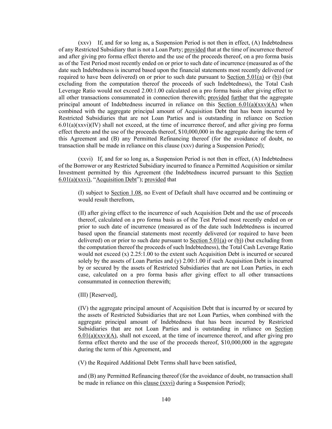 140 (xxv) If, and for so long as, a Suspension Period is not then in effect, (A) Indebtedness of any Restricted Subsidiary that is not a Loan Party; provided that at the time of incurrence thereof and after giving pro forma effect thereto and the use of the proceeds thereof, on a pro forma basis as of the Test Period most recently ended on or prior to such date of incurrence (measured as of the date such Indebtedness is incurred based upon the financial statements most recently delivered (or required to have been delivered) on or prior to such date pursuant to Section 5.01(a) or (b)) (but excluding from the computation thereof the proceeds of such Indebtedness), the Total Cash Leverage Ratio would not exceed 2.00:1.00 calculated on a pro forma basis after giving effect to all other transactions consummated in connection therewith; provided further that the aggregate principal amount of Indebtedness incurred in reliance on this Section 6.01(a)(xxv)(A) when combined with the aggregate principal amount of Acquisition Debt that has been incurred by Restricted Subsidiaries that are not Loan Parties and is outstanding in reliance on Section 6.01(a)(xxvi)(IV) shall not exceed, at the time of incurrence thereof, and after giving pro forma effect thereto and the use of the proceeds thereof, $10,000,000 in the aggregate during the term of this Agreement and (B) any Permitted Refinancing thereof (for the avoidance of doubt, no transaction shall be made in reliance on this clause (xxv) during a Suspension Period); (xxvi) If, and for so long as, a Suspension Period is not then in effect, (A) Indebtedness of the Borrower or any Restricted Subsidiary incurred to finance a Permitted Acquisition or similar Investment permitted by this Agreement (the Indebtedness incurred pursuant to this Section 6.01(a)(xxvi), “Acquisition Debt”); provided that (I) subject to Section 1.08, no Event of Default shall have occurred and be continuing or would result therefrom, (II) after giving effect to the incurrence of such Acquisition Debt and the use of proceeds thereof, calculated on a pro forma basis as of the Test Period most recently ended on or prior to such date of incurrence (measured as of the date such Indebtedness is incurred based upon the financial statements most recently delivered (or required to have been delivered) on or prior to such date pursuant to Section 5.01(a) or (b)) (but excluding from the computation thereof the proceeds of such Indebtedness), the Total Cash Leverage Ratio would not exceed (x) 2.25:1.00 to the extent such Acquisition Debt is incurred or secured solely by the assets of Loan Parties and (y) 2.00:1.00 if such Acquisition Debt is incurred by or secured by the assets of Restricted Subsidiaries that are not Loan Parties, in each case, calculated on a pro forma basis after giving effect to all other transactions consummated in connection therewith; (III) [Reserved], (IV) the aggregate principal amount of Acquisition Debt that is incurred by or secured by the assets of Restricted Subsidiaries that are not Loan Parties, when combined with the aggregate principal amount of Indebtedness that has been incurred by Restricted Subsidiaries that are not Loan Parties and is outstanding in reliance on Section 6.01(a)(xxv)(A), shall not exceed, at the time of incurrence thereof, and after giving pro forma effect thereto and the use of the proceeds thereof, $10,000,000 in the aggregate during the term of this Agreement, and (V) the Required Additional Debt Terms shall have been satisfied, and (B) any Permitted Refinancing thereof (for the avoidance of doubt, no transaction shall be made in reliance on this clause (xxvi) during a Suspension Period);