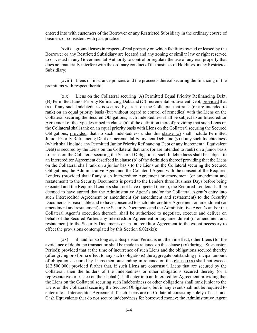 144 entered into with customers of the Borrower or any Restricted Subsidiary in the ordinary course of business or consistent with past practice; (xvii) ground leases in respect of real property on which facilities owned or leased by the Borrower or any Restricted Subsidiary are located and any zoning or similar law or right reserved to or vested in any Governmental Authority to control or regulate the use of any real property that does not materially interfere with the ordinary conduct of the business of Holdings or any Restricted Subsidiary; (xviii) Liens on insurance policies and the proceeds thereof securing the financing of the premiums with respect thereto; (xix) Liens on the Collateral securing (A) Permitted Equal Priority Refinancing Debt, (B) Permitted Junior Priority Refinancing Debt and (C) Incremental Equivalent Debt; provided that (x) if any such Indebtedness is secured by Liens on the Collateral that rank (or are intended to rank) on an equal priority basis (but without regard to control of remedies) with the Liens on the Collateral securing the Secured Obligations, such Indebtedness shall be subject to an Intercreditor Agreement of the type described in clause (a) of the definition thereof providing that such Liens on the Collateral shall rank on an equal priority basis with Liens on the Collateral securing the Secured Obligations; provided, that no such Indebtedness under this clause (x) shall include Permitted Junior Priority Refinancing Debt or Incremental Equivalent Debt and (y) if any such Indebtedness (which shall include any Permitted Junior Priority Refinancing Debt or any Incremental Equivalent Debt) is secured by the Liens on the Collateral that rank (or are intended to rank) on a junior basis to Liens on the Collateral securing the Secured Obligations, such Indebtedness shall be subject to an Intercreditor Agreement described in clause (b) of the definition thereof providing that the Liens on the Collateral shall rank on a junior basis to the Liens on the Collateral securing the Secured Obligations; the Administrative Agent and the Collateral Agent, with the consent of the Required Lenders (provided that if any such Intercreditor Agreement or amendment (or amendment and restatement) to the Security Documents is posted to the Lenders three Business Days before being executed and the Required Lenders shall not have objected thereto, the Required Lenders shall be deemed to have agreed that the Administrative Agent’s and/or the Collateral Agent’s entry into such Intercreditor Agreement or amendment (or amendment and restatement) to the Security Documents is reasonable and to have consented to such Intercreditor Agreement or amendment (or amendment and restatement) to the Security Documents and the Administrative Agent’s and/or the Collateral Agent’s execution thereof), shall be authorized to negotiate, execute and deliver on behalf of the Secured Parties any Intercreditor Agreement or any amendment (or amendment and restatement) to the Security Documents or an Intercreditor Agreement to the extent necessary to effect the provisions contemplated by this Section 6.02(xix); (xx) if, and for so long as, a Suspension Period is not then in effect, other Liens (for the avoidance of doubt, no transaction shall be made in reliance on this clause (xx) during a Suspension Period); provided that at the time of incurrence of such Liens and the obligations secured thereby (after giving pro forma effect to any such obligations) the aggregate outstanding principal amount of obligations secured by Liens then outstanding in reliance on this clause (xx) shall not exceed $12,500,000; provided further that, if such Liens are consensual Liens that are secured by the Collateral, then the holders of the Indebtedness or other obligations secured thereby (or a representative or trustee on their behalf) shall enter into an Intercreditor Agreement providing that the Liens on the Collateral securing such Indebtedness or other obligations shall rank junior to the Liens on the Collateral securing the Secured Obligations, but in any event shall not be required to enter into a Intercreditor Agreement if such Liens are on Collateral consisting solely of cash and Cash Equivalents that do not secure indebtedness for borrowed money; the Administrative Agent