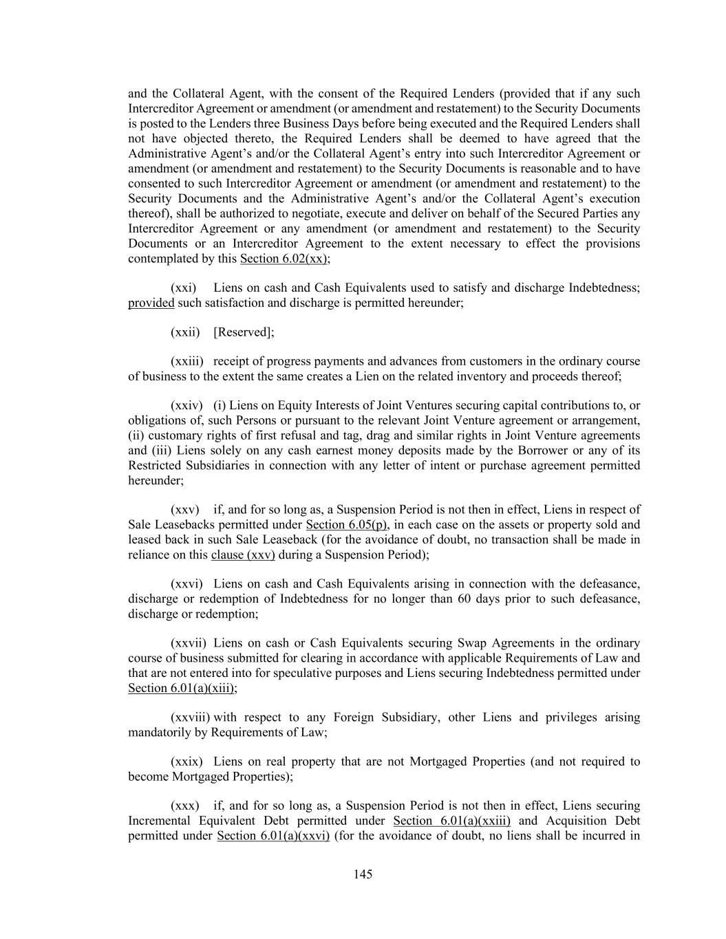 145 and the Collateral Agent, with the consent of the Required Lenders (provided that if any such Intercreditor Agreement or amendment (or amendment and restatement) to the Security Documents is posted to the Lenders three Business Days before being executed and the Required Lenders shall not have objected thereto, the Required Lenders shall be deemed to have agreed that the Administrative Agent’s and/or the Collateral Agent’s entry into such Intercreditor Agreement or amendment (or amendment and restatement) to the Security Documents is reasonable and to have consented to such Intercreditor Agreement or amendment (or amendment and restatement) to the Security Documents and the Administrative Agent’s and/or the Collateral Agent’s execution thereof), shall be authorized to negotiate, execute and deliver on behalf of the Secured Parties any Intercreditor Agreement or any amendment (or amendment and restatement) to the Security Documents or an Intercreditor Agreement to the extent necessary to effect the provisions contemplated by this Section 6.02(xx); (xxi) Liens on cash and Cash Equivalents used to satisfy and discharge Indebtedness; provided such satisfaction and discharge is permitted hereunder; (xxii) [Reserved]; (xxiii) receipt of progress payments and advances from customers in the ordinary course of business to the extent the same creates a Lien on the related inventory and proceeds thereof; (xxiv) (i) Liens on Equity Interests of Joint Ventures securing capital contributions to, or obligations of, such Persons or pursuant to the relevant Joint Venture agreement or arrangement, (ii) customary rights of first refusal and tag, drag and similar rights in Joint Venture agreements and (iii) Liens solely on any cash earnest money deposits made by the Borrower or any of its Restricted Subsidiaries in connection with any letter of intent or purchase agreement permitted hereunder; (xxv) if, and for so long as, a Suspension Period is not then in effect, Liens in respect of Sale Leasebacks permitted under Section 6.05(p), in each case on the assets or property sold and leased back in such Sale Leaseback (for the avoidance of doubt, no transaction shall be made in reliance on this clause (xxv) during a Suspension Period); (xxvi) Liens on cash and Cash Equivalents arising in connection with the defeasance, discharge or redemption of Indebtedness for no longer than 60 days prior to such defeasance, discharge or redemption; (xxvii) Liens on cash or Cash Equivalents securing Swap Agreements in the ordinary course of business submitted for clearing in accordance with applicable Requirements of Law and that are not entered into for speculative purposes and Liens securing Indebtedness permitted under Section 6.01(a)(xiii); (xxviii) with respect to any Foreign Subsidiary, other Liens and privileges arising mandatorily by Requirements of Law; (xxix) Liens on real property that are not Mortgaged Properties (and not required to become Mortgaged Properties); (xxx) if, and for so long as, a Suspension Period is not then in effect, Liens securing Incremental Equivalent Debt permitted under Section 6.01(a)(xxiii) and Acquisition Debt permitted under Section 6.01(a)(xxvi) (for the avoidance of doubt, no liens shall be incurred in