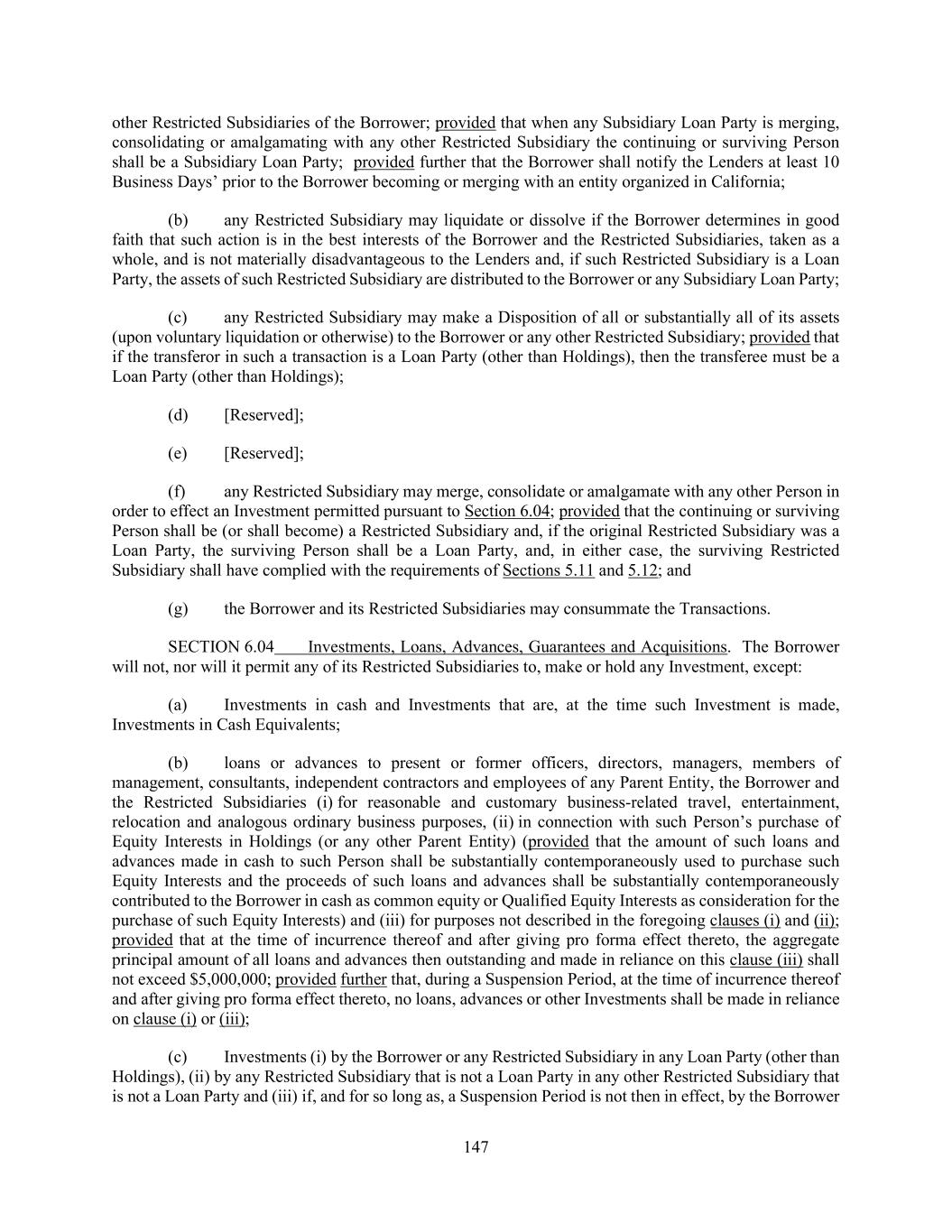 147 other Restricted Subsidiaries of the Borrower; provided that when any Subsidiary Loan Party is merging, consolidating or amalgamating with any other Restricted Subsidiary the continuing or surviving Person shall be a Subsidiary Loan Party; provided further that the Borrower shall notify the Lenders at least 10 Business Days’ prior to the Borrower becoming or merging with an entity organized in California; (b) any Restricted Subsidiary may liquidate or dissolve if the Borrower determines in good faith that such action is in the best interests of the Borrower and the Restricted Subsidiaries, taken as a whole, and is not materially disadvantageous to the Lenders and, if such Restricted Subsidiary is a Loan Party, the assets of such Restricted Subsidiary are distributed to the Borrower or any Subsidiary Loan Party; (c) any Restricted Subsidiary may make a Disposition of all or substantially all of its assets (upon voluntary liquidation or otherwise) to the Borrower or any other Restricted Subsidiary; provided that if the transferor in such a transaction is a Loan Party (other than Holdings), then the transferee must be a Loan Party (other than Holdings); (d) [Reserved]; (e) [Reserved]; (f) any Restricted Subsidiary may merge, consolidate or amalgamate with any other Person in order to effect an Investment permitted pursuant to Section 6.04; provided that the continuing or surviving Person shall be (or shall become) a Restricted Subsidiary and, if the original Restricted Subsidiary was a Loan Party, the surviving Person shall be a Loan Party, and, in either case, the surviving Restricted Subsidiary shall have complied with the requirements of Sections 5.11 and 5.12; and (g) the Borrower and its Restricted Subsidiaries may consummate the Transactions. SECTION 6.04 Investments, Loans, Advances, Guarantees and Acquisitions. The Borrower will not, nor will it permit any of its Restricted Subsidiaries to, make or hold any Investment, except: (a) Investments in cash and Investments that are, at the time such Investment is made, Investments in Cash Equivalents; (b) loans or advances to present or former officers, directors, managers, members of management, consultants, independent contractors and employees of any Parent Entity, the Borrower and the Restricted Subsidiaries (i) for reasonable and customary business-related travel, entertainment, relocation and analogous ordinary business purposes, (ii) in connection with such Person’s purchase of Equity Interests in Holdings (or any other Parent Entity) (provided that the amount of such loans and advances made in cash to such Person shall be substantially contemporaneously used to purchase such Equity Interests and the proceeds of such loans and advances shall be substantially contemporaneously contributed to the Borrower in cash as common equity or Qualified Equity Interests as consideration for the purchase of such Equity Interests) and (iii) for purposes not described in the foregoing clauses (i) and (ii); provided that at the time of incurrence thereof and after giving pro forma effect thereto, the aggregate principal amount of all loans and advances then outstanding and made in reliance on this clause (iii) shall not exceed $5,000,000; provided further that, during a Suspension Period, at the time of incurrence thereof and after giving pro forma effect thereto, no loans, advances or other Investments shall be made in reliance on clause (i) or (iii); (c) Investments (i) by the Borrower or any Restricted Subsidiary in any Loan Party (other than Holdings), (ii) by any Restricted Subsidiary that is not a Loan Party in any other Restricted Subsidiary that is not a Loan Party and (iii) if, and for so long as, a Suspension Period is not then in effect, by the Borrower
