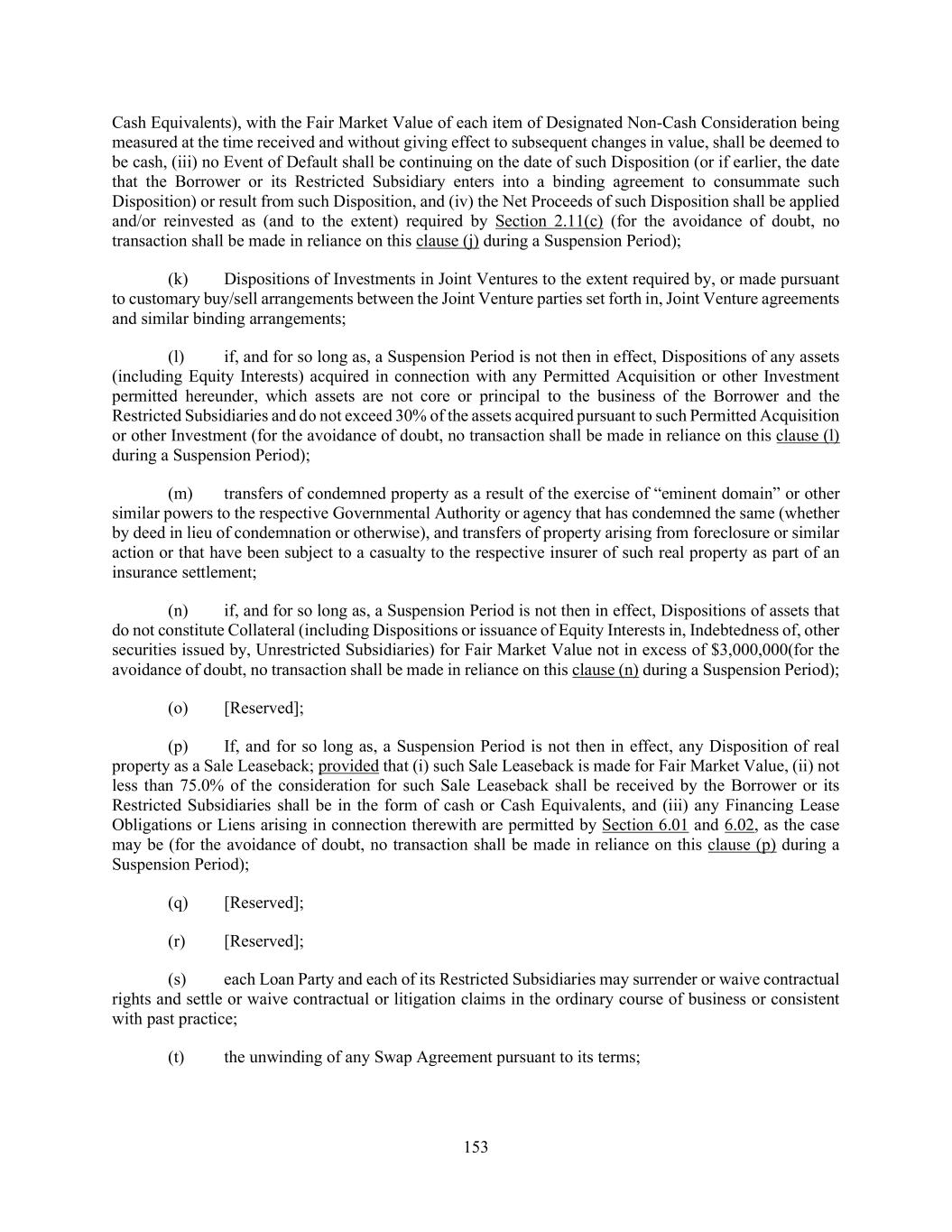 153 Cash Equivalents), with the Fair Market Value of each item of Designated Non-Cash Consideration being measured at the time received and without giving effect to subsequent changes in value, shall be deemed to be cash, (iii) no Event of Default shall be continuing on the date of such Disposition (or if earlier, the date that the Borrower or its Restricted Subsidiary enters into a binding agreement to consummate such Disposition) or result from such Disposition, and (iv) the Net Proceeds of such Disposition shall be applied and/or reinvested as (and to the extent) required by Section 2.11(c) (for the avoidance of doubt, no transaction shall be made in reliance on this clause (j) during a Suspension Period); (k) Dispositions of Investments in Joint Ventures to the extent required by, or made pursuant to customary buy/sell arrangements between the Joint Venture parties set forth in, Joint Venture agreements and similar binding arrangements; (l) if, and for so long as, a Suspension Period is not then in effect, Dispositions of any assets (including Equity Interests) acquired in connection with any Permitted Acquisition or other Investment permitted hereunder, which assets are not core or principal to the business of the Borrower and the Restricted Subsidiaries and do not exceed 30% of the assets acquired pursuant to such Permitted Acquisition or other Investment (for the avoidance of doubt, no transaction shall be made in reliance on this clause (l) during a Suspension Period); (m) transfers of condemned property as a result of the exercise of “eminent domain” or other similar powers to the respective Governmental Authority or agency that has condemned the same (whether by deed in lieu of condemnation or otherwise), and transfers of property arising from foreclosure or similar action or that have been subject to a casualty to the respective insurer of such real property as part of an insurance settlement; (n) if, and for so long as, a Suspension Period is not then in effect, Dispositions of assets that do not constitute Collateral (including Dispositions or issuance of Equity Interests in, Indebtedness of, other securities issued by, Unrestricted Subsidiaries) for Fair Market Value not in excess of $3,000,000(for the avoidance of doubt, no transaction shall be made in reliance on this clause (n) during a Suspension Period); (o) [Reserved]; (p) If, and for so long as, a Suspension Period is not then in effect, any Disposition of real property as a Sale Leaseback; provided that (i) such Sale Leaseback is made for Fair Market Value, (ii) not less than 75.0% of the consideration for such Sale Leaseback shall be received by the Borrower or its Restricted Subsidiaries shall be in the form of cash or Cash Equivalents, and (iii) any Financing Lease Obligations or Liens arising in connection therewith are permitted by Section 6.01 and 6.02, as the case may be (for the avoidance of doubt, no transaction shall be made in reliance on this clause (p) during a Suspension Period); (q) [Reserved]; (r) [Reserved]; (s) each Loan Party and each of its Restricted Subsidiaries may surrender or waive contractual rights and settle or waive contractual or litigation claims in the ordinary course of business or consistent with past practice; (t) the unwinding of any Swap Agreement pursuant to its terms;