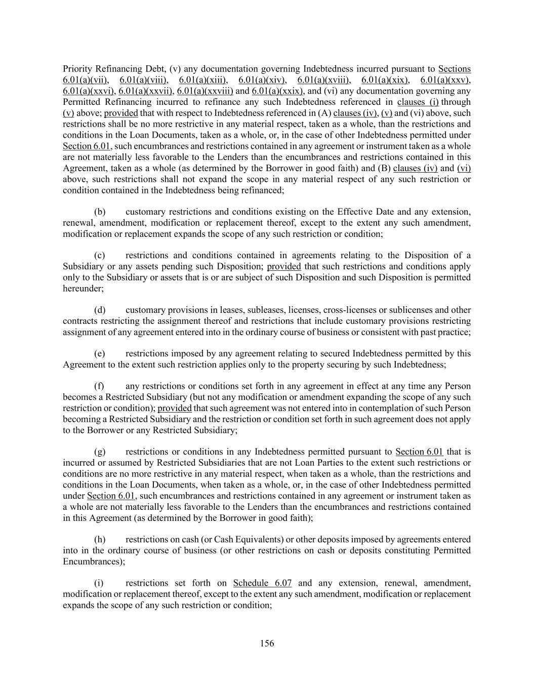 156 Priority Refinancing Debt, (v) any documentation governing Indebtedness incurred pursuant to Sections 6.01(a)(vii), 6.01(a)(viii), 6.01(a)(xiii), 6.01(a)(xiv), 6.01(a)(xviii), 6.01(a)(xix), 6.01(a)(xxv), 6.01(a)(xxvi), 6.01(a)(xxvii), 6.01(a)(xxviii) and 6.01(a)(xxix), and (vi) any documentation governing any Permitted Refinancing incurred to refinance any such Indebtedness referenced in clauses (i) through (v) above; provided that with respect to Indebtedness referenced in (A) clauses (iv), (v) and (vi) above, such restrictions shall be no more restrictive in any material respect, taken as a whole, than the restrictions and conditions in the Loan Documents, taken as a whole, or, in the case of other Indebtedness permitted under Section 6.01, such encumbrances and restrictions contained in any agreement or instrument taken as a whole are not materially less favorable to the Lenders than the encumbrances and restrictions contained in this Agreement, taken as a whole (as determined by the Borrower in good faith) and (B) clauses (iv) and (vi) above, such restrictions shall not expand the scope in any material respect of any such restriction or condition contained in the Indebtedness being refinanced; (b) customary restrictions and conditions existing on the Effective Date and any extension, renewal, amendment, modification or replacement thereof, except to the extent any such amendment, modification or replacement expands the scope of any such restriction or condition; (c) restrictions and conditions contained in agreements relating to the Disposition of a Subsidiary or any assets pending such Disposition; provided that such restrictions and conditions apply only to the Subsidiary or assets that is or are subject of such Disposition and such Disposition is permitted hereunder; (d) customary provisions in leases, subleases, licenses, cross-licenses or sublicenses and other contracts restricting the assignment thereof and restrictions that include customary provisions restricting assignment of any agreement entered into in the ordinary course of business or consistent with past practice; (e) restrictions imposed by any agreement relating to secured Indebtedness permitted by this Agreement to the extent such restriction applies only to the property securing by such Indebtedness; (f) any restrictions or conditions set forth in any agreement in effect at any time any Person becomes a Restricted Subsidiary (but not any modification or amendment expanding the scope of any such restriction or condition); provided that such agreement was not entered into in contemplation of such Person becoming a Restricted Subsidiary and the restriction or condition set forth in such agreement does not apply to the Borrower or any Restricted Subsidiary; (g) restrictions or conditions in any Indebtedness permitted pursuant to Section 6.01 that is incurred or assumed by Restricted Subsidiaries that are not Loan Parties to the extent such restrictions or conditions are no more restrictive in any material respect, when taken as a whole, than the restrictions and conditions in the Loan Documents, when taken as a whole, or, in the case of other Indebtedness permitted under Section 6.01, such encumbrances and restrictions contained in any agreement or instrument taken as a whole are not materially less favorable to the Lenders than the encumbrances and restrictions contained in this Agreement (as determined by the Borrower in good faith); (h) restrictions on cash (or Cash Equivalents) or other deposits imposed by agreements entered into in the ordinary course of business (or other restrictions on cash or deposits constituting Permitted Encumbrances); (i) restrictions set forth on Schedule 6.07 and any extension, renewal, amendment, modification or replacement thereof, except to the extent any such amendment, modification or replacement expands the scope of any such restriction or condition;