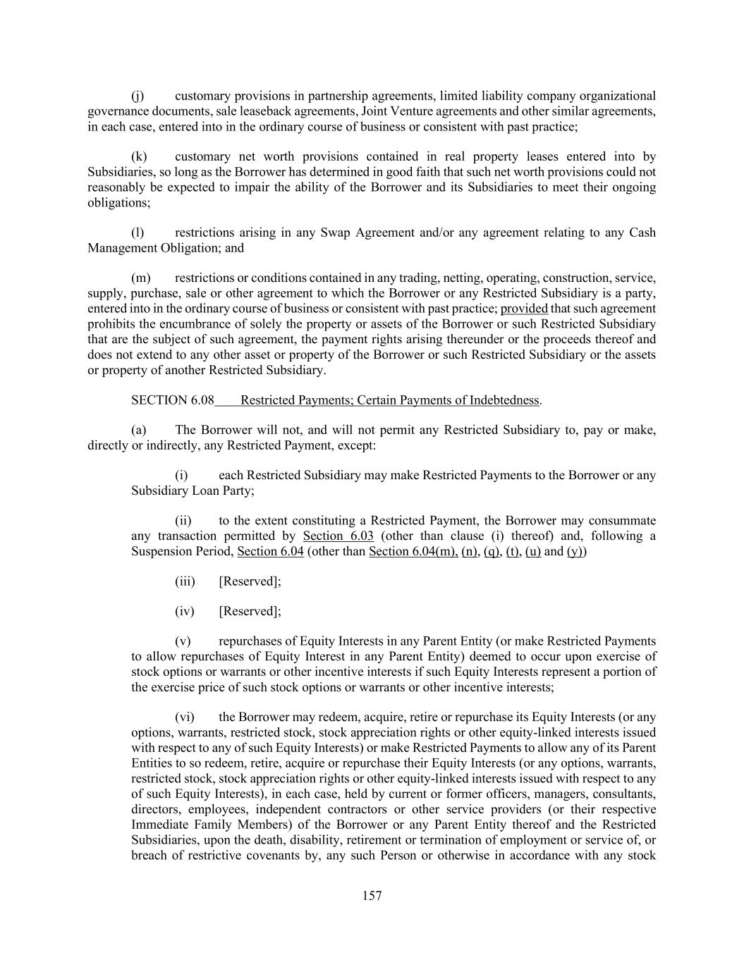 157 (j) customary provisions in partnership agreements, limited liability company organizational governance documents, sale leaseback agreements, Joint Venture agreements and other similar agreements, in each case, entered into in the ordinary course of business or consistent with past practice; (k) customary net worth provisions contained in real property leases entered into by Subsidiaries, so long as the Borrower has determined in good faith that such net worth provisions could not reasonably be expected to impair the ability of the Borrower and its Subsidiaries to meet their ongoing obligations; (l) restrictions arising in any Swap Agreement and/or any agreement relating to any Cash Management Obligation; and (m) restrictions or conditions contained in any trading, netting, operating, construction, service, supply, purchase, sale or other agreement to which the Borrower or any Restricted Subsidiary is a party, entered into in the ordinary course of business or consistent with past practice; provided that such agreement prohibits the encumbrance of solely the property or assets of the Borrower or such Restricted Subsidiary that are the subject of such agreement, the payment rights arising thereunder or the proceeds thereof and does not extend to any other asset or property of the Borrower or such Restricted Subsidiary or the assets or property of another Restricted Subsidiary. SECTION 6.08 Restricted Payments; Certain Payments of Indebtedness. (a) The Borrower will not, and will not permit any Restricted Subsidiary to, pay or make, directly or indirectly, any Restricted Payment, except: (i) each Restricted Subsidiary may make Restricted Payments to the Borrower or any Subsidiary Loan Party; (ii) to the extent constituting a Restricted Payment, the Borrower may consummate any transaction permitted by Section 6.03 (other than clause (i) thereof) and, following a Suspension Period, Section 6.04 (other than Section 6.04(m), (n), (q), (t), (u) and (y)) (iii) [Reserved]; (iv) [Reserved]; (v) repurchases of Equity Interests in any Parent Entity (or make Restricted Payments to allow repurchases of Equity Interest in any Parent Entity) deemed to occur upon exercise of stock options or warrants or other incentive interests if such Equity Interests represent a portion of the exercise price of such stock options or warrants or other incentive interests; (vi) the Borrower may redeem, acquire, retire or repurchase its Equity Interests (or any options, warrants, restricted stock, stock appreciation rights or other equity-linked interests issued with respect to any of such Equity Interests) or make Restricted Payments to allow any of its Parent Entities to so redeem, retire, acquire or repurchase their Equity Interests (or any options, warrants, restricted stock, stock appreciation rights or other equity-linked interests issued with respect to any of such Equity Interests), in each case, held by current or former officers, managers, consultants, directors, employees, independent contractors or other service providers (or their respective Immediate Family Members) of the Borrower or any Parent Entity thereof and the Restricted Subsidiaries, upon the death, disability, retirement or termination of employment or service of, or breach of restrictive covenants by, any such Person or otherwise in accordance with any stock