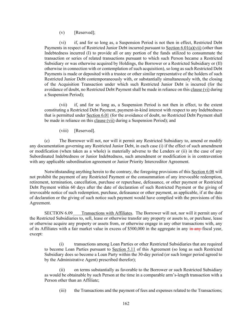 162 (v) [Reserved]; (vi) if, and for so long as, a Suspension Period is not then in effect, Restricted Debt Payments in respect of Restricted Junior Debt incurred pursuant to Section 6.01(a)(vii) (other than Indebtedness incurred (I) to provide all or any portion of the funds utilized to consummate the transaction or series of related transactions pursuant to which such Person became a Restricted Subsidiary or was otherwise acquired by Holdings, the Borrower or a Restricted Subsidiary or (II) otherwise in connection with or contemplation of such acquisition), so long as such Restricted Debt Payments is made or deposited with a trustee or other similar representative of the holders of such Restricted Junior Debt contemporaneously with, or substantially simultaneously with, the closing of the Acquisition Transaction under which such Restricted Junior Debt is incurred (for the avoidance of doubt, no Restricted Debt Payment shall be made in reliance on this clause (vi) during a Suspension Period); (vii) if, and for so long as, a Suspension Period is not then in effect, to the extent constituting a Restricted Debt Payment, payment-in-kind interest with respect to any Indebtedness that is permitted under Section 6.01 (for the avoidance of doubt, no Restricted Debt Payment shall be made in reliance on this clause (vii) during a Suspension Period); and (viii) [Reserved]. (c) The Borrower will not, nor will it permit any Restricted Subsidiary to, amend or modify any documentation governing any Restricted Junior Debt, in each case (i) if the effect of such amendment or modification (when taken as a whole) is materially adverse to the Lenders or (ii) in the case of any Subordinated Indebtedness or Junior Indebtedness, such amendment or modification is in contravention with any applicable subordination agreement or Junior Priority Intercreditor Agreement. Notwithstanding anything herein to the contrary, the foregoing provisions of this Section 6.08 will not prohibit the payment of any Restricted Payment or the consummation of any irrevocable redemption, retirement, termination, cancellation, purchase or repurchase, defeasance, or other payment or Restricted Debt Payment within 60 days after the date of declaration of such Restricted Payment or the giving of irrevocable notice of such redemption, purchase, defeasance or other payment, as applicable, if at the date of declaration or the giving of such notice such payment would have complied with the provisions of this Agreement. SECTION 6.09 Transactions with Affiliates. The Borrower will not, nor will it permit any of the Restricted Subsidiaries to, sell, lease or otherwise transfer any property or assets to, or purchase, lease or otherwise acquire any property or assets from, or otherwise engage in any other transactions with, any of its Affiliates with a fair market value in excess of $500,000 in the aggregate in any in any fiscal year, except: (i) transactions among Loan Parties or other Restricted Subsidiaries that are required to become Loan Parties pursuant to Section 5.11 of this Agreement (so long as such Restricted Subsidiary does so become a Loan Party within the 30-day period (or such longer period agreed to by the Administrative Agent) prescribed therefor); (ii) on terms substantially as favorable to the Borrower or such Restricted Subsidiary as would be obtainable by such Person at the time in a comparable arm’s-length transaction with a Person other than an Affiliate; (iii) the Transactions and the payment of fees and expenses related to the Transactions;