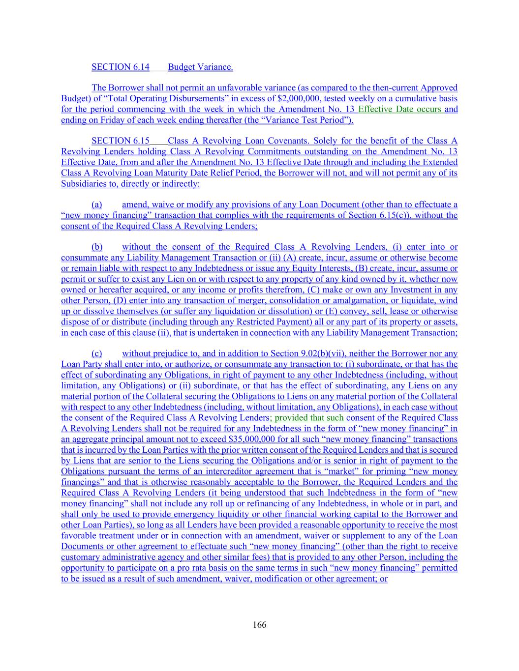 166 SECTION 6.14 Budget Variance. The Borrower shall not permit an unfavorable variance (as compared to the then-current Approved Budget) of “Total Operating Disbursements” in excess of $2,000,000, tested weekly on a cumulative basis for the period commencing with the week in which the Amendment No. 13 Effective Date occurs and ending on Friday of each week ending thereafter (the “Variance Test Period”). SECTION 6.15 Class A Revolving Loan Covenants. Solely for the benefit of the Class A Revolving Lenders holding Class A Revolving Commitments outstanding on the Amendment No. 13 Effective Date, from and after the Amendment No. 13 Effective Date through and including the Extended Class A Revolving Loan Maturity Date Relief Period, the Borrower will not, and will not permit any of its Subsidiaries to, directly or indirectly: (a) amend, waive or modify any provisions of any Loan Document (other than to effectuate a “new money financing” transaction that complies with the requirements of Section 6.15(c)), without the consent of the Required Class A Revolving Lenders; (b) without the consent of the Required Class A Revolving Lenders, (i) enter into or consummate any Liability Management Transaction or (ii) (A) create, incur, assume or otherwise become or remain liable with respect to any Indebtedness or issue any Equity Interests, (B) create, incur, assume or permit or suffer to exist any Lien on or with respect to any property of any kind owned by it, whether now owned or hereafter acquired, or any income or profits therefrom, (C) make or own any Investment in any other Person, (D) enter into any transaction of merger, consolidation or amalgamation, or liquidate, wind up or dissolve themselves (or suffer any liquidation or dissolution) or (E) convey, sell, lease or otherwise dispose of or distribute (including through any Restricted Payment) all or any part of its property or assets, in each case of this clause (ii), that is undertaken in connection with any Liability Management Transaction; (c) without prejudice to, and in addition to Section 9.02(b)(vii), neither the Borrower nor any Loan Party shall enter into, or authorize, or consummate any transaction to: (i) subordinate, or that has the effect of subordinating any Obligations, in right of payment to any other Indebtedness (including, without limitation, any Obligations) or (ii) subordinate, or that has the effect of subordinating, any Liens on any material portion of the Collateral securing the Obligations to Liens on any material portion of the Collateral with respect to any other Indebtedness (including, without limitation, any Obligations), in each case without the consent of the Required Class A Revolving Lenders; provided that such consent of the Required Class A Revolving Lenders shall not be required for any Indebtedness in the form of “new money financing” in an aggregate principal amount not to exceed $35,000,000 for all such “new money financing” transactions that is incurred by the Loan Parties with the prior written consent of the Required Lenders and that is secured by Liens that are senior to the Liens securing the Obligations and/or is senior in right of payment to the Obligations pursuant the terms of an intercreditor agreement that is “market” for priming “new money financings” and that is otherwise reasonably acceptable to the Borrower, the Required Lenders and the Required Class A Revolving Lenders (it being understood that such Indebtedness in the form of “new money financing” shall not include any roll up or refinancing of any Indebtedness, in whole or in part, and shall only be used to provide emergency liquidity or other financial working capital to the Borrower and other Loan Parties), so long as all Lenders have been provided a reasonable opportunity to receive the most favorable treatment under or in connection with an amendment, waiver or supplement to any of the Loan Documents or other agreement to effectuate such “new money financing” (other than the right to receive customary administrative agency and other similar fees) that is provided to any other Person, including the opportunity to participate on a pro rata basis on the same terms in such “new money financing” permitted to be issued as a result of such amendment, waiver, modification or other agreement; or