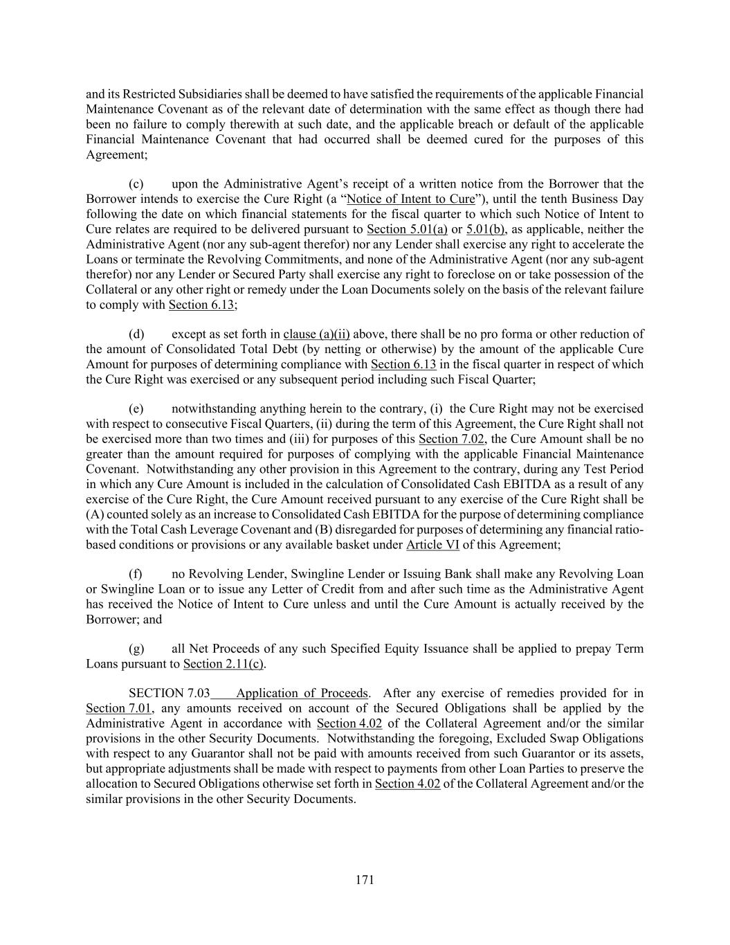 171 and its Restricted Subsidiaries shall be deemed to have satisfied the requirements of the applicable Financial Maintenance Covenant as of the relevant date of determination with the same effect as though there had been no failure to comply therewith at such date, and the applicable breach or default of the applicable Financial Maintenance Covenant that had occurred shall be deemed cured for the purposes of this Agreement; (c) upon the Administrative Agent’s receipt of a written notice from the Borrower that the Borrower intends to exercise the Cure Right (a “Notice of Intent to Cure”), until the tenth Business Day following the date on which financial statements for the fiscal quarter to which such Notice of Intent to Cure relates are required to be delivered pursuant to Section 5.01(a) or 5.01(b), as applicable, neither the Administrative Agent (nor any sub-agent therefor) nor any Lender shall exercise any right to accelerate the Loans or terminate the Revolving Commitments, and none of the Administrative Agent (nor any sub-agent therefor) nor any Lender or Secured Party shall exercise any right to foreclose on or take possession of the Collateral or any other right or remedy under the Loan Documents solely on the basis of the relevant failure to comply with Section 6.13; (d) except as set forth in clause (a)(ii) above, there shall be no pro forma or other reduction of the amount of Consolidated Total Debt (by netting or otherwise) by the amount of the applicable Cure Amount for purposes of determining compliance with Section 6.13 in the fiscal quarter in respect of which the Cure Right was exercised or any subsequent period including such Fiscal Quarter; (e) notwithstanding anything herein to the contrary, (i) the Cure Right may not be exercised with respect to consecutive Fiscal Quarters, (ii) during the term of this Agreement, the Cure Right shall not be exercised more than two times and (iii) for purposes of this Section 7.02, the Cure Amount shall be no greater than the amount required for purposes of complying with the applicable Financial Maintenance Covenant. Notwithstanding any other provision in this Agreement to the contrary, during any Test Period in which any Cure Amount is included in the calculation of Consolidated Cash EBITDA as a result of any exercise of the Cure Right, the Cure Amount received pursuant to any exercise of the Cure Right shall be (A) counted solely as an increase to Consolidated Cash EBITDA for the purpose of determining compliance with the Total Cash Leverage Covenant and (B) disregarded for purposes of determining any financial ratio- based conditions or provisions or any available basket under Article VI of this Agreement; (f) no Revolving Lender, Swingline Lender or Issuing Bank shall make any Revolving Loan or Swingline Loan or to issue any Letter of Credit from and after such time as the Administrative Agent has received the Notice of Intent to Cure unless and until the Cure Amount is actually received by the Borrower; and (g) all Net Proceeds of any such Specified Equity Issuance shall be applied to prepay Term Loans pursuant to Section 2.11(c). SECTION 7.03 Application of Proceeds. After any exercise of remedies provided for in Section 7.01, any amounts received on account of the Secured Obligations shall be applied by the Administrative Agent in accordance with Section 4.02 of the Collateral Agreement and/or the similar provisions in the other Security Documents. Notwithstanding the foregoing, Excluded Swap Obligations with respect to any Guarantor shall not be paid with amounts received from such Guarantor or its assets, but appropriate adjustments shall be made with respect to payments from other Loan Parties to preserve the allocation to Secured Obligations otherwise set forth in Section 4.02 of the Collateral Agreement and/or the similar provisions in the other Security Documents.