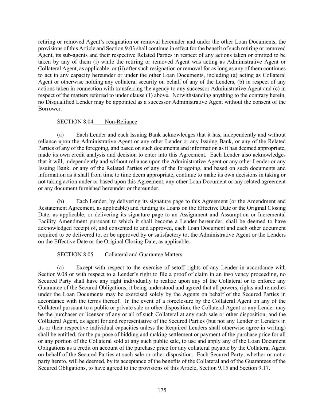 175 retiring or removed Agent’s resignation or removal hereunder and under the other Loan Documents, the provisions of this Article and Section 9.03 shall continue in effect for the benefit of such retiring or removed Agent, its sub-agents and their respective Related Parties in respect of any actions taken or omitted to be taken by any of them (i) while the retiring or removed Agent was acting as Administrative Agent or Collateral Agent, as applicable, or (ii) after such resignation or removal for as long as any of them continues to act in any capacity hereunder or under the other Loan Documents, including (a) acting as Collateral Agent or otherwise holding any collateral security on behalf of any of the Lenders, (b) in respect of any actions taken in connection with transferring the agency to any successor Administrative Agent and (c) in respect of the matters referred to under clause (1) above. Notwithstanding anything to the contrary herein, no Disqualified Lender may be appointed as a successor Administrative Agent without the consent of the Borrower. SECTION 8.04 Non-Reliance (a) Each Lender and each Issuing Bank acknowledges that it has, independently and without reliance upon the Administrative Agent or any other Lender or any Issuing Bank, or any of the Related Parties of any of the foregoing, and based on such documents and information as it has deemed appropriate, made its own credit analysis and decision to enter into this Agreement. Each Lender also acknowledges that it will, independently and without reliance upon the Administrative Agent or any other Lender or any Issuing Bank, or any of the Related Parties of any of the foregoing, and based on such documents and information as it shall from time to time deem appropriate, continue to make its own decisions in taking or not taking action under or based upon this Agreement, any other Loan Document or any related agreement or any document furnished hereunder or thereunder. (b) Each Lender, by delivering its signature page to this Agreement (or the Amendment and Restatement Agreement, as applicable) and funding its Loans on the Effective Date or the Original Closing Date, as applicable, or delivering its signature page to an Assignment and Assumption or Incremental Facility Amendment pursuant to which it shall become a Lender hereunder, shall be deemed to have acknowledged receipt of, and consented to and approved, each Loan Document and each other document required to be delivered to, or be approved by or satisfactory to, the Administrative Agent or the Lenders on the Effective Date or the Original Closing Date, as applicable. SECTION 8.05 Collateral and Guarantee Matters (a) Except with respect to the exercise of setoff rights of any Lender in accordance with Section 9.08 or with respect to a Lender’s right to file a proof of claim in an insolvency proceeding, no Secured Party shall have any right individually to realize upon any of the Collateral or to enforce any Guarantee of the Secured Obligations, it being understood and agreed that all powers, rights and remedies under the Loan Documents may be exercised solely by the Agents on behalf of the Secured Parties in accordance with the terms thereof. In the event of a foreclosure by the Collateral Agent on any of the Collateral pursuant to a public or private sale or other disposition, the Collateral Agent or any Lender may be the purchaser or licensor of any or all of such Collateral at any such sale or other disposition, and the Collateral Agent, as agent for and representative of the Secured Parties (but not any Lender or Lenders in its or their respective individual capacities unless the Required Lenders shall otherwise agree in writing) shall be entitled, for the purpose of bidding and making settlement or payment of the purchase price for all or any portion of the Collateral sold at any such public sale, to use and apply any of the Loan Document Obligations as a credit on account of the purchase price for any collateral payable by the Collateral Agent on behalf of the Secured Parties at such sale or other disposition. Each Secured Party, whether or not a party hereto, will be deemed, by its acceptance of the benefits of the Collateral and of the Guarantees of the Secured Obligations, to have agreed to the provisions of this Article, Section 9.15 and Section 9.17.