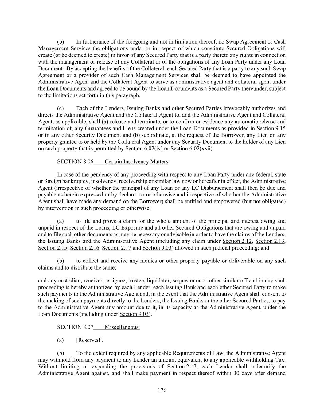 176 (b) In furtherance of the foregoing and not in limitation thereof, no Swap Agreement or Cash Management Services the obligations under or in respect of which constitute Secured Obligations will create (or be deemed to create) in favor of any Secured Party that is a party thereto any rights in connection with the management or release of any Collateral or of the obligations of any Loan Party under any Loan Document. By accepting the benefits of the Collateral, each Secured Party that is a party to any such Swap Agreement or a provider of such Cash Management Services shall be deemed to have appointed the Administrative Agent and the Collateral Agent to serve as administrative agent and collateral agent under the Loan Documents and agreed to be bound by the Loan Documents as a Secured Party thereunder, subject to the limitations set forth in this paragraph. (c) Each of the Lenders, Issuing Banks and other Secured Parties irrevocably authorizes and directs the Administrative Agent and the Collateral Agent to, and the Administrative Agent and Collateral Agent, as applicable, shall (a) release and terminate, or to confirm or evidence any automatic release and termination of, any Guarantees and Liens created under the Loan Documents as provided in Section 9.15 or in any other Security Document and (b) subordinate, at the request of the Borrower, any Lien on any property granted to or held by the Collateral Agent under any Security Document to the holder of any Lien on such property that is permitted by Section 6.02(iv) or Section 6.02(xxii). SECTION 8.06 Certain Insolvency Matters In case of the pendency of any proceeding with respect to any Loan Party under any federal, state or foreign bankruptcy, insolvency, receivership or similar law now or hereafter in effect, the Administrative Agent (irrespective of whether the principal of any Loan or any LC Disbursement shall then be due and payable as herein expressed or by declaration or otherwise and irrespective of whether the Administrative Agent shall have made any demand on the Borrower) shall be entitled and empowered (but not obligated) by intervention in such proceeding or otherwise: (a) to file and prove a claim for the whole amount of the principal and interest owing and unpaid in respect of the Loans, LC Exposure and all other Secured Obligations that are owing and unpaid and to file such other documents as may be necessary or advisable in order to have the claims of the Lenders, the Issuing Banks and the Administrative Agent (including any claim under Section 2.12, Section 2.13, Section 2.15, Section 2.16, Section 2.17 and Section 9.03) allowed in such judicial proceeding; and (b) to collect and receive any monies or other property payable or deliverable on any such claims and to distribute the same; and any custodian, receiver, assignee, trustee, liquidator, sequestrator or other similar official in any such proceeding is hereby authorized by each Lender, each Issuing Bank and each other Secured Party to make such payments to the Administrative Agent and, in the event that the Administrative Agent shall consent to the making of such payments directly to the Lenders, the Issuing Banks or the other Secured Parties, to pay to the Administrative Agent any amount due to it, in its capacity as the Administrative Agent, under the Loan Documents (including under Section 9.03). SECTION 8.07 Miscellaneous. (a) [Reserved]. (b) To the extent required by any applicable Requirements of Law, the Administrative Agent may withhold from any payment to any Lender an amount equivalent to any applicable withholding Tax. Without limiting or expanding the provisions of Section 2.17, each Lender shall indemnify the Administrative Agent against, and shall make payment in respect thereof within 30 days after demand