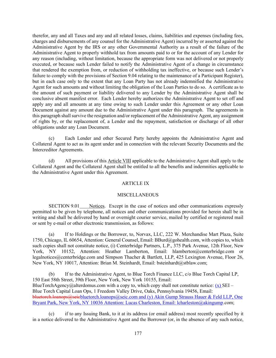 177 therefor, any and all Taxes and any and all related losses, claims, liabilities and expenses (including fees, charges and disbursements of any counsel for the Administrative Agent) incurred by or asserted against the Administrative Agent by the IRS or any other Governmental Authority as a result of the failure of the Administrative Agent to properly withhold tax from amounts paid to or for the account of any Lender for any reason (including, without limitation, because the appropriate form was not delivered or not properly executed, or because such Lender failed to notify the Administrative Agent of a change in circumstance that rendered the exemption from, or reduction of withholding tax ineffective, or because such Lender’s failure to comply with the provisions of Section 9.04 relating to the maintenance of a Participant Register), but in each case only to the extent that any Loan Party has not already indemnified the Administrative Agent for such amounts and without limiting the obligation of the Loan Parties to do so. A certificate as to the amount of such payment or liability delivered to any Lender by the Administrative Agent shall be conclusive absent manifest error. Each Lender hereby authorizes the Administrative Agent to set off and apply any and all amounts at any time owing to such Lender under this Agreement or any other Loan Document against any amount due to the Administrative Agent under this paragraph. The agreements in this paragraph shall survive the resignation and/or replacement of the Administrative Agent, any assignment of rights by, or the replacement of, a Lender and the repayment, satisfaction or discharge of all other obligations under any Loan Document. (c) Each Lender and other Secured Party hereby appoints the Administrative Agent and Collateral Agent to act as its agent under and in connection with the relevant Security Documents and the Intercreditor Agreements. (d) All provisions of this Article VIII applicable to the Administrative Agent shall apply to the Collateral Agent and the Collateral Agent shall be entitled to all the benefits and indemnities applicable to the Administrative Agent under this Agreement. ARTICLE IX MISCELLANEOUS SECTION 9.01 Notices. Except in the case of notices and other communications expressly permitted to be given by telephone, all notices and other communications provided for herein shall be in writing and shall be delivered by hand or overnight courier service, mailed by certified or registered mail or sent by e-mail or other electronic transmission, as follows: (a) If to Holdings or the Borrower, to, Norvax, LLC, 222 W. Merchandise Mart Plaza, Suite 1750, Chicago, IL 60654, Attention: General Counsel, Email: BBurd@gohealth.com, with copies to, which such copies shall not constitute notice, (i) Centerbridge Partners, L.P., 375 Park Avenue, 12th Floor, New York, NY 10152, Attention: Heather Lamberton, Email: hlamberton@centerbridge.com or legalnotices@centerbridge.com and Simpson Thacher & Bartlett, LLP, 425 Lexington Avenue, Floor 26, New York, NY 10017, Attention: Brian M. Steinhardt, Email: bsteinhardt@stblaw.com; (b) If to the Administrative Agent, to Blue Torch Finance LLC, c/o Blue Torch Capital LP, 150 East 58th Street, 39th Floor, New York, New York 10155, Email: BlueTorchAgency@alterdomus.com with a copy to, which copy shall not constitute notice: (x) SEI – Blue Torch Capital Loan Ops, 1 Freedom Valley Drive, Oaks, Pennsylvania 19456, Email: bluetorch.loanops@seicbluetorch.loanops@seic.com and (y) Akin Gump Strauss Hauer & Feld LLP, One Bryant Park, New York, NY 10036 Attention: Lucas Charleston, Email: lcharleston@akingump.com; (c) if to any Issuing Bank, to it at its address (or email address) most recently specified by it in a notice delivered to the Administrative Agent and the Borrower (or, in the absence of any such notice,