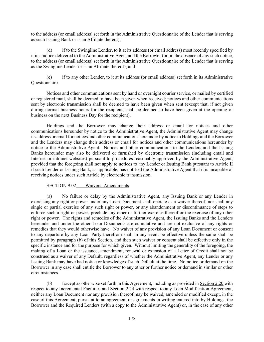 178 to the address (or email address) set forth in the Administrative Questionnaire of the Lender that is serving as such Issuing Bank or is an Affiliate thereof); (d) if to the Swingline Lender, to it at its address (or email address) most recently specified by it in a notice delivered to the Administrative Agent and the Borrower (or, in the absence of any such notice, to the address (or email address) set forth in the Administrative Questionnaire of the Lender that is serving as the Swingline Lender or is an Affiliate thereof); and (e) if to any other Lender, to it at its address (or email address) set forth in its Administrative Questionnaire. Notices and other communications sent by hand or overnight courier service, or mailed by certified or registered mail, shall be deemed to have been given when received; notices and other communications sent by electronic transmission shall be deemed to have been given when sent (except that, if not given during normal business hours for the recipient, shall be deemed to have been given at the opening of business on the next Business Day for the recipient). Holdings and the Borrower may change their address or email for notices and other communications hereunder by notice to the Administrative Agent, the Administrative Agent may change its address or email for notices and other communications hereunder by notice to Holdings and the Borrower and the Lenders may change their address or email for notices and other communications hereunder by notice to the Administrative Agent. Notices and other communications to the Lenders and the Issuing Banks hereunder may also be delivered or furnished by electronic transmission (including email and Internet or intranet websites) pursuant to procedures reasonably approved by the Administrative Agent; provided that the foregoing shall not apply to notices to any Lender or Issuing Bank pursuant to Article II if such Lender or Issuing Bank, as applicable, has notified the Administrative Agent that it is incapable of receiving notices under such Article by electronic transmission. SECTION 9.02 Waivers; Amendments. (a) No failure or delay by the Administrative Agent, any Issuing Bank or any Lender in exercising any right or power under any Loan Document shall operate as a waiver thereof, nor shall any single or partial exercise of any such right or power, or any abandonment or discontinuance of steps to enforce such a right or power, preclude any other or further exercise thereof or the exercise of any other right or power. The rights and remedies of the Administrative Agent, the Issuing Banks and the Lenders hereunder and under the other Loan Documents are cumulative and are not exclusive of any rights or remedies that they would otherwise have. No waiver of any provision of any Loan Document or consent to any departure by any Loan Party therefrom shall in any event be effective unless the same shall be permitted by paragraph (b) of this Section, and then such waiver or consent shall be effective only in the specific instance and for the purpose for which given. Without limiting the generality of the foregoing, the making of a Loan or the issuance, amendment, renewal or extension of a Letter of Credit shall not be construed as a waiver of any Default, regardless of whether the Administrative Agent, any Lender or any Issuing Bank may have had notice or knowledge of such Default at the time. No notice or demand on the Borrower in any case shall entitle the Borrower to any other or further notice or demand in similar or other circumstances. (b) Except as otherwise set forth in this Agreement, including as provided in Section 2.20 with respect to any Incremental Facilities and Section 2.24 with respect to any Loan Modification Agreement, neither any Loan Document nor any provision thereof may be waived, amended or modified except, in the case of this Agreement, pursuant to an agreement or agreements in writing entered into by Holdings, the Borrower and the Required Lenders (with a copy to the Administrative Agent) or, in the case of any other