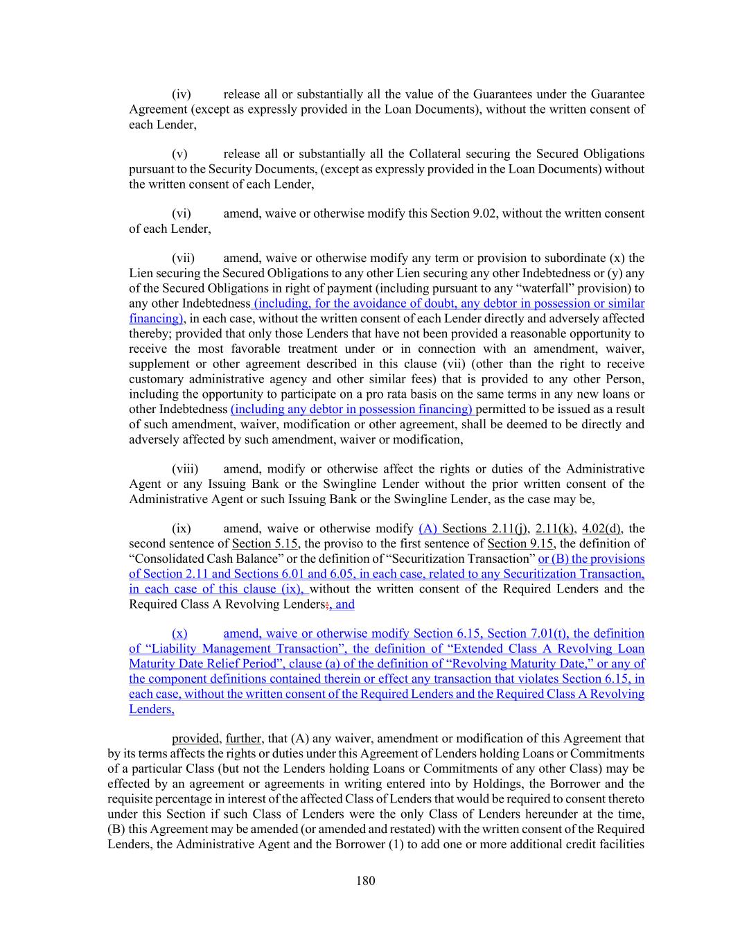 180 (iv) release all or substantially all the value of the Guarantees under the Guarantee Agreement (except as expressly provided in the Loan Documents), without the written consent of each Lender, (v) release all or substantially all the Collateral securing the Secured Obligations pursuant to the Security Documents, (except as expressly provided in the Loan Documents) without the written consent of each Lender, (vi) amend, waive or otherwise modify this Section 9.02, without the written consent of each Lender, (vii) amend, waive or otherwise modify any term or provision to subordinate (x) the Lien securing the Secured Obligations to any other Lien securing any other Indebtedness or (y) any of the Secured Obligations in right of payment (including pursuant to any “waterfall” provision) to any other Indebtedness (including, for the avoidance of doubt, any debtor in possession or similar financing), in each case, without the written consent of each Lender directly and adversely affected thereby; provided that only those Lenders that have not been provided a reasonable opportunity to receive the most favorable treatment under or in connection with an amendment, waiver, supplement or other agreement described in this clause (vii) (other than the right to receive customary administrative agency and other similar fees) that is provided to any other Person, including the opportunity to participate on a pro rata basis on the same terms in any new loans or other Indebtedness (including any debtor in possession financing) permitted to be issued as a result of such amendment, waiver, modification or other agreement, shall be deemed to be directly and adversely affected by such amendment, waiver or modification, (viii) amend, modify or otherwise affect the rights or duties of the Administrative Agent or any Issuing Bank or the Swingline Lender without the prior written consent of the Administrative Agent or such Issuing Bank or the Swingline Lender, as the case may be, (ix) amend, waive or otherwise modify (A) Sections 2.11(j), 2.11(k), 4.02(d), the second sentence of Section 5.15, the proviso to the first sentence of Section 9.15, the definition of “Consolidated Cash Balance” or the definition of “Securitization Transaction” or (B) the provisions of Section 2.11 and Sections 6.01 and 6.05, in each case, related to any Securitization Transaction, in each case of this clause (ix), without the written consent of the Required Lenders and the Required Class A Revolving Lenders;, and (x) amend, waive or otherwise modify Section 6.15, Section 7.01(t), the definition of “Liability Management Transaction”, the definition of “Extended Class A Revolving Loan Maturity Date Relief Period”, clause (a) of the definition of “Revolving Maturity Date,” or any of the component definitions contained therein or effect any transaction that violates Section 6.15, in each case, without the written consent of the Required Lenders and the Required Class A Revolving Lenders, provided, further, that (A) any waiver, amendment or modification of this Agreement that by its terms affects the rights or duties under this Agreement of Lenders holding Loans or Commitments of a particular Class (but not the Lenders holding Loans or Commitments of any other Class) may be effected by an agreement or agreements in writing entered into by Holdings, the Borrower and the requisite percentage in interest of the affected Class of Lenders that would be required to consent thereto under this Section if such Class of Lenders were the only Class of Lenders hereunder at the time, (B) this Agreement may be amended (or amended and restated) with the written consent of the Required Lenders, the Administrative Agent and the Borrower (1) to add one or more additional credit facilities