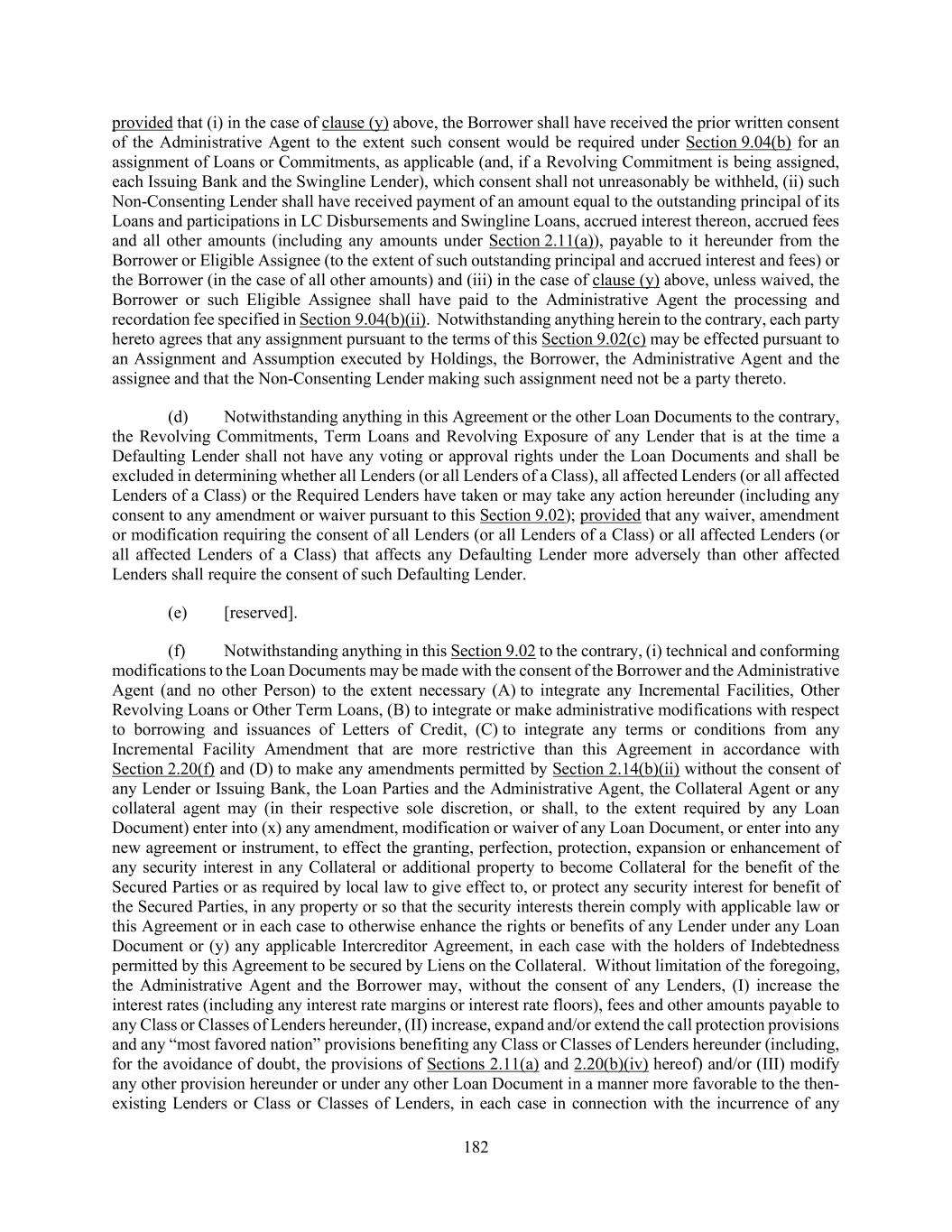 182 provided that (i) in the case of clause (y) above, the Borrower shall have received the prior written consent of the Administrative Agent to the extent such consent would be required under Section 9.04(b) for an assignment of Loans or Commitments, as applicable (and, if a Revolving Commitment is being assigned, each Issuing Bank and the Swingline Lender), which consent shall not unreasonably be withheld, (ii) such Non-Consenting Lender shall have received payment of an amount equal to the outstanding principal of its Loans and participations in LC Disbursements and Swingline Loans, accrued interest thereon, accrued fees and all other amounts (including any amounts under Section 2.11(a)), payable to it hereunder from the Borrower or Eligible Assignee (to the extent of such outstanding principal and accrued interest and fees) or the Borrower (in the case of all other amounts) and (iii) in the case of clause (y) above, unless waived, the Borrower or such Eligible Assignee shall have paid to the Administrative Agent the processing and recordation fee specified in Section 9.04(b)(ii). Notwithstanding anything herein to the contrary, each party hereto agrees that any assignment pursuant to the terms of this Section 9.02(c) may be effected pursuant to an Assignment and Assumption executed by Holdings, the Borrower, the Administrative Agent and the assignee and that the Non-Consenting Lender making such assignment need not be a party thereto. (d) Notwithstanding anything in this Agreement or the other Loan Documents to the contrary, the Revolving Commitments, Term Loans and Revolving Exposure of any Lender that is at the time a Defaulting Lender shall not have any voting or approval rights under the Loan Documents and shall be excluded in determining whether all Lenders (or all Lenders of a Class), all affected Lenders (or all affected Lenders of a Class) or the Required Lenders have taken or may take any action hereunder (including any consent to any amendment or waiver pursuant to this Section 9.02); provided that any waiver, amendment or modification requiring the consent of all Lenders (or all Lenders of a Class) or all affected Lenders (or all affected Lenders of a Class) that affects any Defaulting Lender more adversely than other affected Lenders shall require the consent of such Defaulting Lender. (e) [reserved]. (f) Notwithstanding anything in this Section 9.02 to the contrary, (i) technical and conforming modifications to the Loan Documents may be made with the consent of the Borrower and the Administrative Agent (and no other Person) to the extent necessary (A) to integrate any Incremental Facilities, Other Revolving Loans or Other Term Loans, (B) to integrate or make administrative modifications with respect to borrowing and issuances of Letters of Credit, (C) to integrate any terms or conditions from any Incremental Facility Amendment that are more restrictive than this Agreement in accordance with Section 2.20(f) and (D) to make any amendments permitted by Section 2.14(b)(ii) without the consent of any Lender or Issuing Bank, the Loan Parties and the Administrative Agent, the Collateral Agent or any collateral agent may (in their respective sole discretion, or shall, to the extent required by any Loan Document) enter into (x) any amendment, modification or waiver of any Loan Document, or enter into any new agreement or instrument, to effect the granting, perfection, protection, expansion or enhancement of any security interest in any Collateral or additional property to become Collateral for the benefit of the Secured Parties or as required by local law to give effect to, or protect any security interest for benefit of the Secured Parties, in any property or so that the security interests therein comply with applicable law or this Agreement or in each case to otherwise enhance the rights or benefits of any Lender under any Loan Document or (y) any applicable Intercreditor Agreement, in each case with the holders of Indebtedness permitted by this Agreement to be secured by Liens on the Collateral. Without limitation of the foregoing, the Administrative Agent and the Borrower may, without the consent of any Lenders, (I) increase the interest rates (including any interest rate margins or interest rate floors), fees and other amounts payable to any Class or Classes of Lenders hereunder, (II) increase, expand and/or extend the call protection provisions and any “most favored nation” provisions benefiting any Class or Classes of Lenders hereunder (including, for the avoidance of doubt, the provisions of Sections 2.11(a) and 2.20(b)(iv) hereof) and/or (III) modify any other provision hereunder or under any other Loan Document in a manner more favorable to the then- existing Lenders or Class or Classes of Lenders, in each case in connection with the incurrence of any