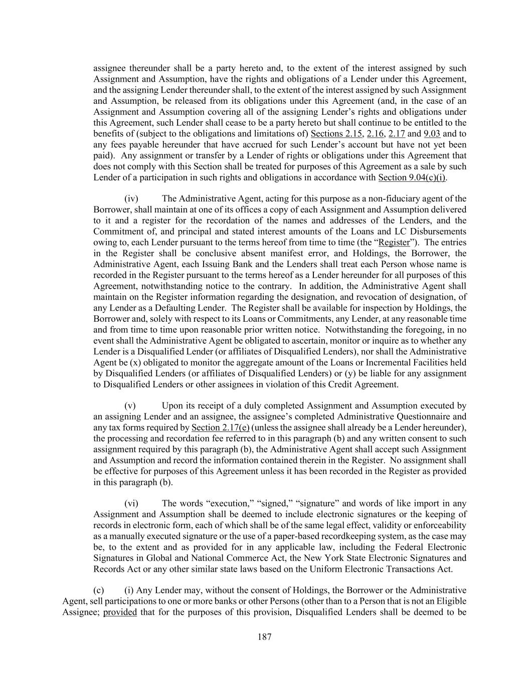 187 assignee thereunder shall be a party hereto and, to the extent of the interest assigned by such Assignment and Assumption, have the rights and obligations of a Lender under this Agreement, and the assigning Lender thereunder shall, to the extent of the interest assigned by such Assignment and Assumption, be released from its obligations under this Agreement (and, in the case of an Assignment and Assumption covering all of the assigning Lender’s rights and obligations under this Agreement, such Lender shall cease to be a party hereto but shall continue to be entitled to the benefits of (subject to the obligations and limitations of) Sections 2.15, 2.16, 2.17 and 9.03 and to any fees payable hereunder that have accrued for such Lender’s account but have not yet been paid). Any assignment or transfer by a Lender of rights or obligations under this Agreement that does not comply with this Section shall be treated for purposes of this Agreement as a sale by such Lender of a participation in such rights and obligations in accordance with Section 9.04(c)(i). (iv) The Administrative Agent, acting for this purpose as a non-fiduciary agent of the Borrower, shall maintain at one of its offices a copy of each Assignment and Assumption delivered to it and a register for the recordation of the names and addresses of the Lenders, and the Commitment of, and principal and stated interest amounts of the Loans and LC Disbursements owing to, each Lender pursuant to the terms hereof from time to time (the “Register”). The entries in the Register shall be conclusive absent manifest error, and Holdings, the Borrower, the Administrative Agent, each Issuing Bank and the Lenders shall treat each Person whose name is recorded in the Register pursuant to the terms hereof as a Lender hereunder for all purposes of this Agreement, notwithstanding notice to the contrary. In addition, the Administrative Agent shall maintain on the Register information regarding the designation, and revocation of designation, of any Lender as a Defaulting Lender. The Register shall be available for inspection by Holdings, the Borrower and, solely with respect to its Loans or Commitments, any Lender, at any reasonable time and from time to time upon reasonable prior written notice. Notwithstanding the foregoing, in no event shall the Administrative Agent be obligated to ascertain, monitor or inquire as to whether any Lender is a Disqualified Lender (or affiliates of Disqualified Lenders), nor shall the Administrative Agent be (x) obligated to monitor the aggregate amount of the Loans or Incremental Facilities held by Disqualified Lenders (or affiliates of Disqualified Lenders) or (y) be liable for any assignment to Disqualified Lenders or other assignees in violation of this Credit Agreement. (v) Upon its receipt of a duly completed Assignment and Assumption executed by an assigning Lender and an assignee, the assignee’s completed Administrative Questionnaire and any tax forms required by Section 2.17(e) (unless the assignee shall already be a Lender hereunder), the processing and recordation fee referred to in this paragraph (b) and any written consent to such assignment required by this paragraph (b), the Administrative Agent shall accept such Assignment and Assumption and record the information contained therein in the Register. No assignment shall be effective for purposes of this Agreement unless it has been recorded in the Register as provided in this paragraph (b). (vi) The words “execution,” “signed,” “signature” and words of like import in any Assignment and Assumption shall be deemed to include electronic signatures or the keeping of records in electronic form, each of which shall be of the same legal effect, validity or enforceability as a manually executed signature or the use of a paper-based recordkeeping system, as the case may be, to the extent and as provided for in any applicable law, including the Federal Electronic Signatures in Global and National Commerce Act, the New York State Electronic Signatures and Records Act or any other similar state laws based on the Uniform Electronic Transactions Act. (c) (i) Any Lender may, without the consent of Holdings, the Borrower or the Administrative Agent, sell participations to one or more banks or other Persons (other than to a Person that is not an Eligible Assignee; provided that for the purposes of this provision, Disqualified Lenders shall be deemed to be