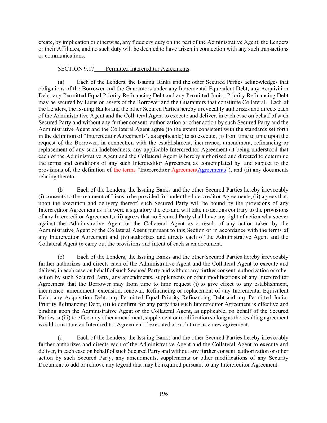 196 create, by implication or otherwise, any fiduciary duty on the part of the Administrative Agent, the Lenders or their Affiliates, and no such duty will be deemed to have arisen in connection with any such transactions or communications. SECTION 9.17 Permitted Intercreditor Agreements. (a) Each of the Lenders, the Issuing Banks and the other Secured Parties acknowledges that obligations of the Borrower and the Guarantors under any Incremental Equivalent Debt, any Acquisition Debt, any Permitted Equal Priority Refinancing Debt and any Permitted Junior Priority Refinancing Debt may be secured by Liens on assets of the Borrower and the Guarantors that constitute Collateral. Each of the Lenders, the Issuing Banks and the other Secured Parties hereby irrevocably authorizes and directs each of the Administrative Agent and the Collateral Agent to execute and deliver, in each case on behalf of such Secured Party and without any further consent, authorization or other action by such Secured Party and the Administrative Agent and the Collateral Agent agree (to the extent consistent with the standards set forth in the definition of “Intercreditor Agreements”, as applicable) to so execute, (i) from time to time upon the request of the Borrower, in connection with the establishment, incurrence, amendment, refinancing or replacement of any such Indebtedness, any applicable Intercreditor Agreement (it being understood that each of the Administrative Agent and the Collateral Agent is hereby authorized and directed to determine the terms and conditions of any such Intercreditor Agreement as contemplated by, and subject to the provisions of, the definition of the terms “Intercreditor AgreementAgreements”), and (ii) any documents relating thereto. (b) Each of the Lenders, the Issuing Banks and the other Secured Parties hereby irrevocably (i) consents to the treatment of Liens to be provided for under the Intercreditor Agreements, (ii) agrees that, upon the execution and delivery thereof, such Secured Party will be bound by the provisions of any Intercreditor Agreement as if it were a signatory thereto and will take no actions contrary to the provisions of any Intercreditor Agreement, (iii) agrees that no Secured Party shall have any right of action whatsoever against the Administrative Agent or the Collateral Agent as a result of any action taken by the Administrative Agent or the Collateral Agent pursuant to this Section or in accordance with the terms of any Intercreditor Agreement and (iv) authorizes and directs each of the Administrative Agent and the Collateral Agent to carry out the provisions and intent of each such document. (c) Each of the Lenders, the Issuing Banks and the other Secured Parties hereby irrevocably further authorizes and directs each of the Administrative Agent and the Collateral Agent to execute and deliver, in each case on behalf of such Secured Party and without any further consent, authorization or other action by such Secured Party, any amendments, supplements or other modifications of any Intercreditor Agreement that the Borrower may from time to time request (i) to give effect to any establishment, incurrence, amendment, extension, renewal, Refinancing or replacement of any Incremental Equivalent Debt, any Acquisition Debt, any Permitted Equal Priority Refinancing Debt and any Permitted Junior Priority Refinancing Debt, (ii) to confirm for any party that such Intercreditor Agreement is effective and binding upon the Administrative Agent or the Collateral Agent, as applicable, on behalf of the Secured Parties or (iii) to effect any other amendment, supplement or modification so long as the resulting agreement would constitute an Intercreditor Agreement if executed at such time as a new agreement. (d) Each of the Lenders, the Issuing Banks and the other Secured Parties hereby irrevocably further authorizes and directs each of the Administrative Agent and the Collateral Agent to execute and deliver, in each case on behalf of such Secured Party and without any further consent, authorization or other action by such Secured Party, any amendments, supplements or other modifications of any Security Document to add or remove any legend that may be required pursuant to any Intercreditor Agreement.