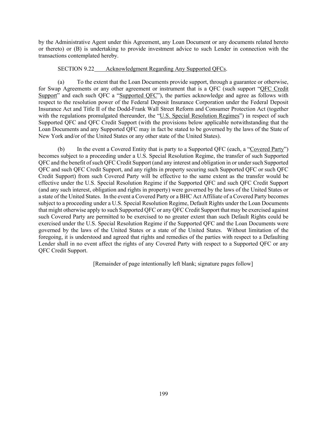 199 by the Administrative Agent under this Agreement, any Loan Document or any documents related hereto or thereto) or (B) is undertaking to provide investment advice to such Lender in connection with the transactions contemplated hereby. SECTION 9.22 Acknowledgment Regarding Any Supported QFCs. (a) To the extent that the Loan Documents provide support, through a guarantee or otherwise, for Swap Agreements or any other agreement or instrument that is a QFC (such support “QFC Credit Support” and each such QFC a “Supported QFC”), the parties acknowledge and agree as follows with respect to the resolution power of the Federal Deposit Insurance Corporation under the Federal Deposit Insurance Act and Title II of the Dodd-Frank Wall Street Reform and Consumer Protection Act (together with the regulations promulgated thereunder, the “U.S. Special Resolution Regimes”) in respect of such Supported QFC and QFC Credit Support (with the provisions below applicable notwithstanding that the Loan Documents and any Supported QFC may in fact be stated to be governed by the laws of the State of New York and/or of the United States or any other state of the United States). (b) In the event a Covered Entity that is party to a Supported QFC (each, a “Covered Party”) becomes subject to a proceeding under a U.S. Special Resolution Regime, the transfer of such Supported QFC and the benefit of such QFC Credit Support (and any interest and obligation in or under such Supported QFC and such QFC Credit Support, and any rights in property securing such Supported QFC or such QFC Credit Support) from such Covered Party will be effective to the same extent as the transfer would be effective under the U.S. Special Resolution Regime if the Supported QFC and such QFC Credit Support (and any such interest, obligation and rights in property) were governed by the laws of the United States or a state of the United States. In the event a Covered Party or a BHC Act Affiliate of a Covered Party becomes subject to a proceeding under a U.S. Special Resolution Regime, Default Rights under the Loan Documents that might otherwise apply to such Supported QFC or any QFC Credit Support that may be exercised against such Covered Party are permitted to be exercised to no greater extent than such Default Rights could be exercised under the U.S. Special Resolution Regime if the Supported QFC and the Loan Documents were governed by the laws of the United States or a state of the United States. Without limitation of the foregoing, it is understood and agreed that rights and remedies of the parties with respect to a Defaulting Lender shall in no event affect the rights of any Covered Party with respect to a Supported QFC or any QFC Credit Support. [Remainder of page intentionally left blank; signature pages follow]