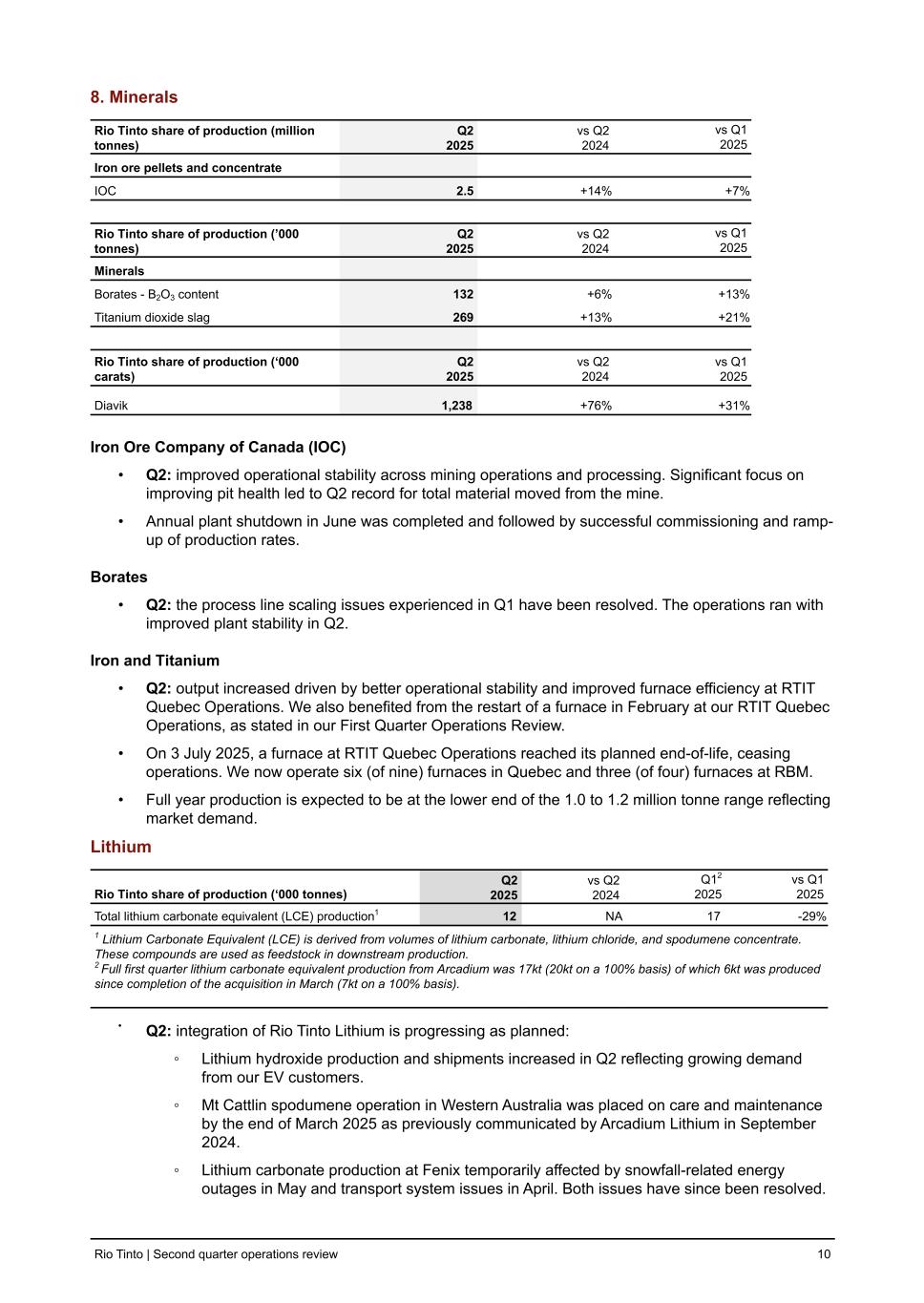 8. Minerals Rio Tinto share of production (million tonnes) Q2 2025 vs Q2 2024 vs Q1 2025 Iron ore pellets and concentrate IOC 2.5 +14 % +7 % Rio Tinto share of production (’000 tonnes) Q2 2025 vs Q2 2024 vs Q1 2025 Minerals Borates - B2O3 content 132 +6 % +13 % Titanium dioxide slag 269 +13 % +21 % Rio Tinto share of production (‘000 carats) Q2 2025 vs Q2 2024 vs Q1 2025 Diavik 1,238 +76 % +31 % Iron Ore Company of Canada (IOC) • Q2: improved operational stability across mining operations and processing. Significant focus on improving pit health led to Q2 record for total material moved from the mine. • Annual plant shutdown in June was completed and followed by successful commissioning and ramp- up of production rates. Borates • Q2: the process line scaling issues experienced in Q1 have been resolved. The operations ran with improved plant stability in Q2. Iron and Titanium • Q2: output increased driven by better operational stability and improved furnace efficiency at RTIT Quebec Operations. We also benefited from the restart of a furnace in February at our RTIT Quebec Operations, as stated in our First Quarter Operations Review. • On 3 July 2025, a furnace at RTIT Quebec Operations reached its planned end-of-life, ceasing operations. We now operate six (of nine) furnaces in Quebec and three (of four) furnaces at RBM. • Full year production is expected to be at the lower end of the 1.0 to 1.2 million tonne range reflecting market demand. Lithium Rio Tinto share of production (‘000 tonnes) Q2 2025 vs Q2 2024 Q12 2025 vs Q1 2025 Total lithium carbonate equivalent (LCE) production1 12 NA 17 -29 % 1 Lithium Carbonate Equivalent (LCE) is derived from volumes of lithium carbonate, lithium chloride, and spodumene concentrate. These compounds are used as feedstock in downstream production. 2 Full first quarter lithium carbonate equivalent production from Arcadium was 17kt (20kt on a 100% basis) of which 6kt was produced since completion of the acquisition in March (7kt on a 100% basis). • Q2: integration of Rio Tinto Lithium is progressing as planned: ◦ Lithium hydroxide production and shipments increased in Q2 reflecting growing demand from our EV customers. ◦ Mt Cattlin spodumene operation in Western Australia was placed on care and maintenance by the end of March 2025 as previously communicated by Arcadium Lithium in September 2024. ◦ Lithium carbonate production at Fenix temporarily affected by snowfall-related energy outages in May and transport system issues in April. Both issues have since been resolved. Rio Tinto | Second quarter operations review 10