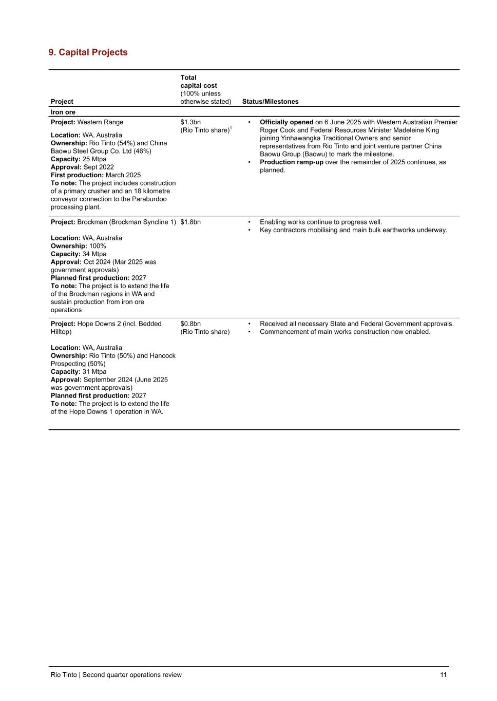 9. Capital Projects Project Total capital cost (100% unless otherwise stated) Status/Milestones Iron ore Project: Western Range Location: WA, Australia Ownership: Rio Tinto (54%) and China Baowu Steel Group Co. Ltd (46%) Capacity: 25 Mtpa Approval: Sept 2022 First production: March 2025 To note: The project includes construction of a primary crusher and an 18 kilometre conveyor connection to the Paraburdoo processing plant. $1.3bn (Rio Tinto share)1 • Officially opened on 6 June 2025 with Western Australian Premier Roger Cook and Federal Resources Minister Madeleine King joining Yinhawangka Traditional Owners and senior representatives from Rio Tinto and joint venture partner China Baowu Group (Baowu) to mark the milestone. • Production ramp-up over the remainder of 2025 continues, as planned. Project: Brockman (Brockman Syncline 1) Location: WA, Australia Ownership: 100% Capacity: 34 Mtpa Approval: Oct 2024 (Mar 2025 was government approvals) Planned first production: 2027 To note: The project is to extend the life of the Brockman regions in WA and sustain production from iron ore operations $1.8bn • Enabling works continue to progress well. • Key contractors mobilising and main bulk earthworks underway. Project: Hope Downs 2 (incl. Bedded Hilltop) Location: WA, Australia Ownership: Rio Tinto (50%) and Hancock Prospecting (50%) Capacity: 31 Mtpa Approval: September 2024 (June 2025 was government approvals) Planned first production: 2027 To note: The project is to extend the life of the Hope Downs 1 operation in WA. $0.8bn (Rio Tinto share) • Received all necessary State and Federal Government approvals. • Commencement of main works construction now enabled. Rio Tinto | Second quarter operations review 11