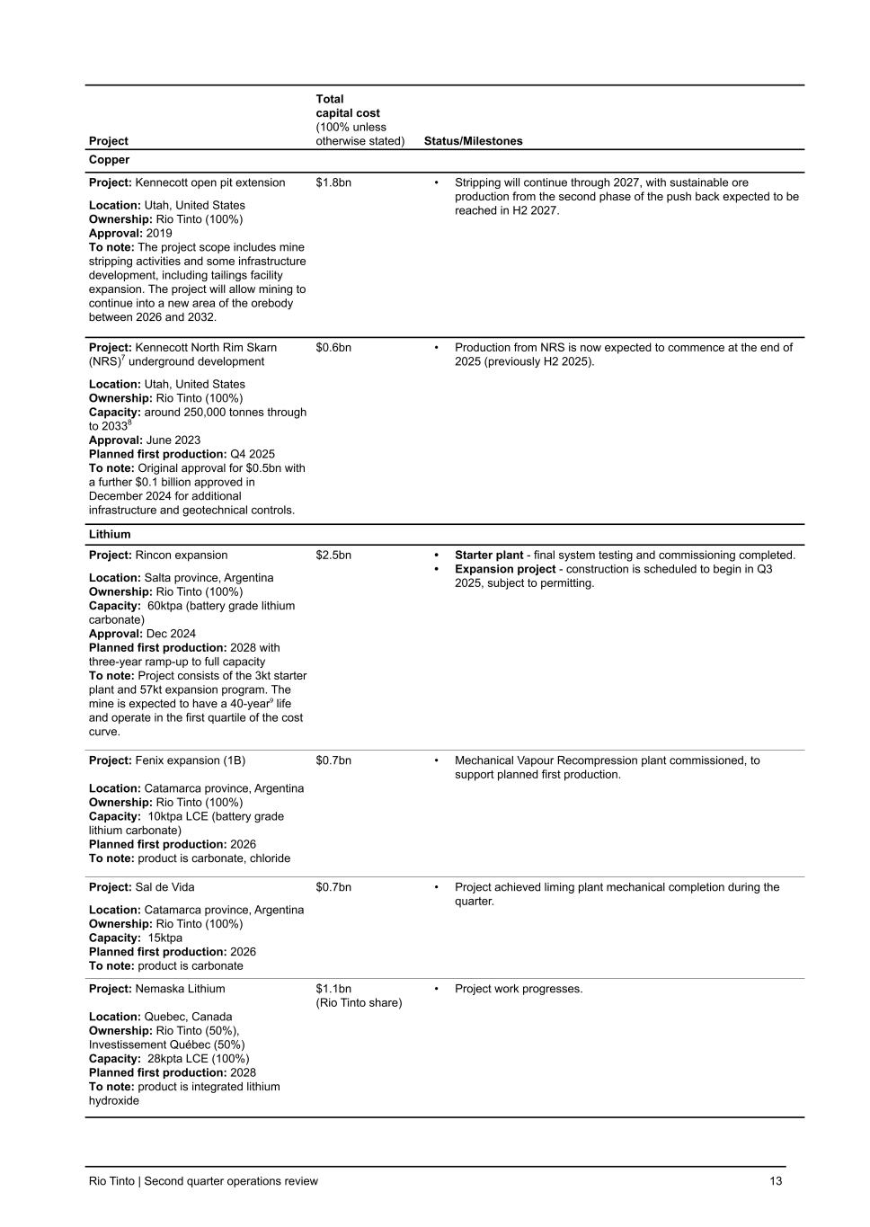 Project Total capital cost (100% unless otherwise stated) Status/Milestones Copper Project: Kennecott open pit extension Location: Utah, United States Ownership: Rio Tinto (100%) Approval: 2019 To note: The project scope includes mine stripping activities and some infrastructure development, including tailings facility expansion. The project will allow mining to continue into a new area of the orebody between 2026 and 2032. $1.8bn • Stripping will continue through 2027, with sustainable ore production from the second phase of the push back expected to be reached in H2 2027. Project: Kennecott North Rim Skarn (NRS)7 underground development Location: Utah, United States Ownership: Rio Tinto (100%) Capacity: around 250,000 tonnes through to 20338 Approval: June 2023 Planned first production: Q4 2025 To note: Original approval for $0.5bn with a further $0.1 billion approved in December 2024 for additional infrastructure and geotechnical controls. $0.6bn • Production from NRS is now expected to commence at the end of 2025 (previously H2 2025). Lithium Project: Rincon expansion Location: Salta province, Argentina Ownership: Rio Tinto (100%) Capacity: 60ktpa (battery grade lithium carbonate) Approval: Dec 2024 Planned first production: 2028 with three-year ramp-up to full capacity To note: Project consists of the 3kt starter plant and 57kt expansion program. The mine is expected to have a 40-year⁹ life and operate in the first quartile of the cost curve. $2.5bn • Starter plant - final system testing and commissioning completed. • Expansion project - construction is scheduled to begin in Q3 2025, subject to permitting. Project: Fenix expansion (1B) Location: Catamarca province, Argentina Ownership: Rio Tinto (100%) Capacity: 10ktpa LCE (battery grade lithium carbonate) Planned first production: 2026 To note: product is carbonate, chloride $0.7bn • Mechanical Vapour Recompression plant commissioned, to support planned first production. Project: Sal de Vida Location: Catamarca province, Argentina Ownership: Rio Tinto (100%) Capacity: 15ktpa Planned first production: 2026 To note: product is carbonate $0.7bn • Project achieved liming plant mechanical completion during the quarter. Project: Nemaska Lithium Location: Quebec, Canada Ownership: Rio Tinto (50%), Investissement Québec (50%) Capacity: 28kpta LCE (100%) Planned first production: 2028 To note: product is integrated lithium hydroxide $1.1bn (Rio Tinto share) • Project work progresses. Rio Tinto | Second quarter operations review 13