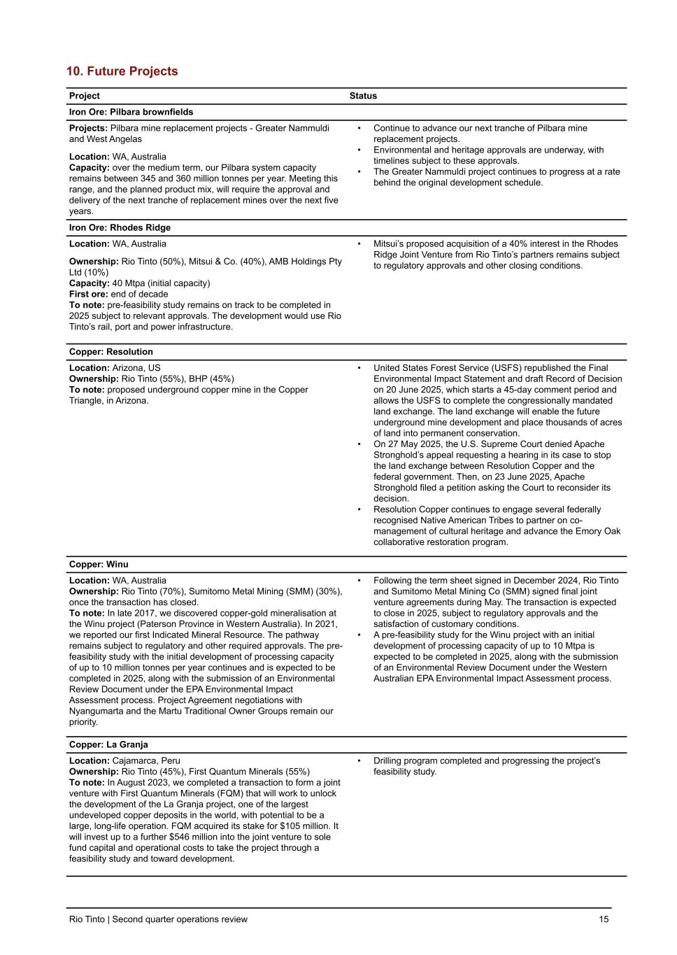 10. Future Projects Project Status Iron Ore: Pilbara brownfields Projects: Pilbara mine replacement projects - Greater Nammuldi and West Angelas Location: WA, Australia Capacity: over the medium term, our Pilbara system capacity remains between 345 and 360 million tonnes per year. Meeting this range, and the planned product mix, will require the approval and delivery of the next tranche of replacement mines over the next five years. • Continue to advance our next tranche of Pilbara mine replacement projects. • Environmental and heritage approvals are underway, with timelines subject to these approvals. • The Greater Nammuldi project continues to progress at a rate behind the original development schedule. Iron Ore: Rhodes Ridge Location: WA, Australia Ownership: Rio Tinto (50%), Mitsui & Co. (40%), AMB Holdings Pty Ltd (10%) Capacity: 40 Mtpa (initial capacity) First ore: end of decade To note: pre-feasibility study remains on track to be completed in 2025 subject to relevant approvals. The development would use Rio Tinto’s rail, port and power infrastructure. • Mitsui’s proposed acquisition of a 40% interest in the Rhodes Ridge Joint Venture from Rio Tinto’s partners remains subject to regulatory approvals and other closing conditions. Copper: Resolution Location: Arizona, US Ownership: Rio Tinto (55%), BHP (45%) To note: proposed underground copper mine in the Copper Triangle, in Arizona. • United States Forest Service (USFS) republished the Final Environmental Impact Statement and draft Record of Decision on 20 June 2025, which starts a 45-day comment period and allows the USFS to complete the congressionally mandated land exchange. The land exchange will enable the future underground mine development and place thousands of acres of land into permanent conservation. • On 27 May 2025, the U.S. Supreme Court denied Apache Stronghold’s appeal requesting a hearing in its case to stop the land exchange between Resolution Copper and the federal government. Then, on 23 June 2025, Apache Stronghold filed a petition asking the Court to reconsider its decision. • Resolution Copper continues to engage several federally recognised Native American Tribes to partner on co- management of cultural heritage and advance the Emory Oak collaborative restoration program. Copper: Winu Location: WA, Australia Ownership: Rio Tinto (70%), Sumitomo Metal Mining (SMM) (30%), once the transaction has closed. To note: In late 2017, we discovered copper-gold mineralisation at the Winu project (Paterson Province in Western Australia). In 2021, we reported our first Indicated Mineral Resource. The pathway remains subject to regulatory and other required approvals. The pre- feasibility study with the initial development of processing capacity of up to 10 million tonnes per year continues and is expected to be completed in 2025, along with the submission of an Environmental Review Document under the EPA Environmental Impact Assessment process. Project Agreement negotiations with Nyangumarta and the Martu Traditional Owner Groups remain our priority. • Following the term sheet signed in December 2024, Rio Tinto and Sumitomo Metal Mining Co (SMM) signed final joint venture agreements during May. The transaction is expected to close in 2025, subject to regulatory approvals and the satisfaction of customary conditions. • A pre-feasibility study for the Winu project with an initial development of processing capacity of up to 10 Mtpa is expected to be completed in 2025, along with the submission of an Environmental Review Document under the Western Australian EPA Environmental Impact Assessment process. Copper: La Granja Location: Cajamarca, Peru Ownership: Rio Tinto (45%), First Quantum Minerals (55%) To note: In August 2023, we completed a transaction to form a joint venture with First Quantum Minerals (FQM) that will work to unlock the development of the La Granja project, one of the largest undeveloped copper deposits in the world, with potential to be a large, long-life operation. FQM acquired its stake for $105 million. It will invest up to a further $546 million into the joint venture to sole fund capital and operational costs to take the project through a feasibility study and toward development. • Drilling program completed and progressing the project’s feasibility study. Rio Tinto | Second quarter operations review 15