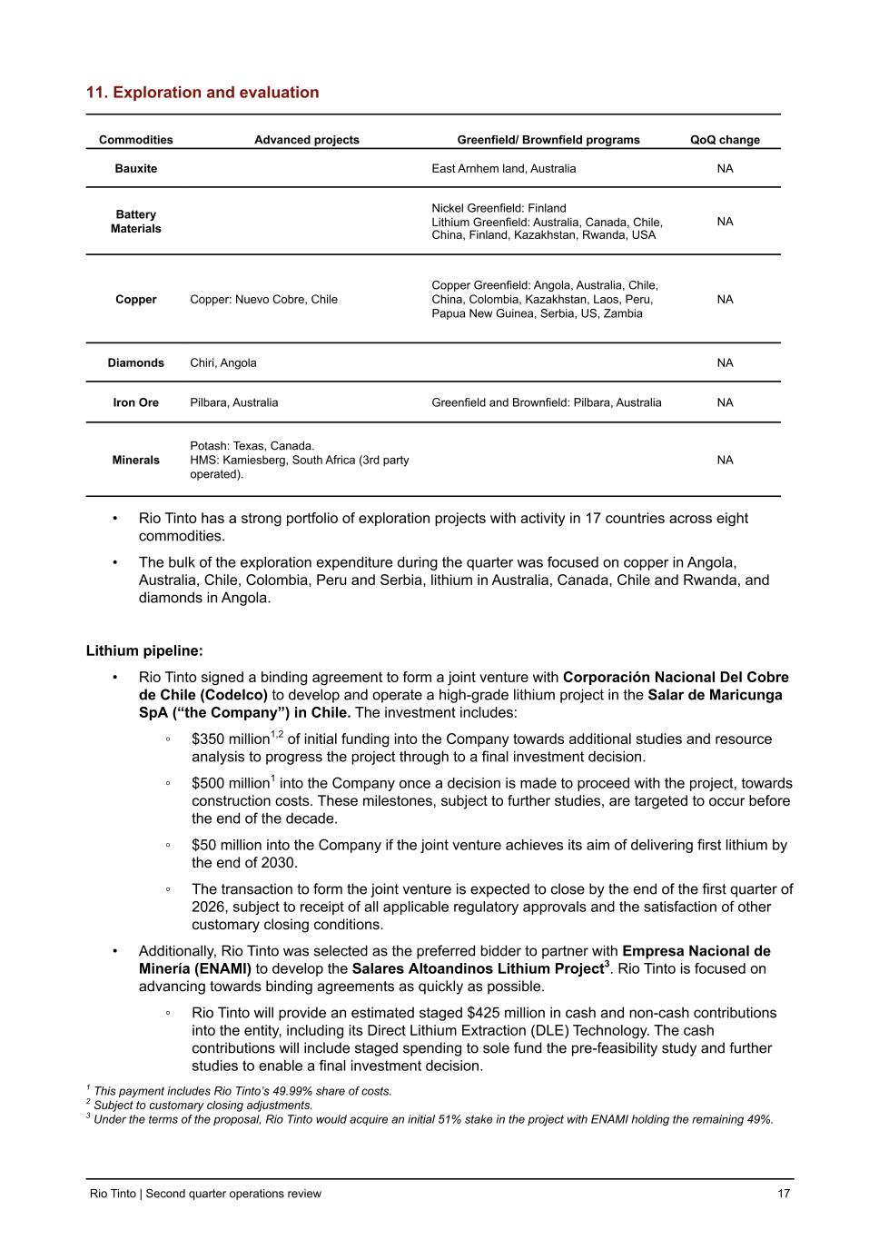 11. Exploration and evaluation Commodities Advanced projects Greenfield/ Brownfield programs QoQ change Bauxite East Arnhem land, Australia NA Battery Materials Nickel Greenfield: Finland Lithium Greenfield: Australia, Canada, Chile, China, Finland, Kazakhstan, Rwanda, USA NA Copper Copper: Nuevo Cobre, Chile Copper Greenfield: Angola, Australia, Chile, China, Colombia, Kazakhstan, Laos, Peru, Papua New Guinea, Serbia, US, Zambia NA Diamonds Chiri, Angola NA Iron Ore Pilbara, Australia Greenfield and Brownfield: Pilbara, Australia NA Minerals Potash: Texas, Canada. HMS: Kamiesberg, South Africa (3rd party operated). NA • Rio Tinto has a strong portfolio of exploration projects with activity in 17 countries across eight commodities. • The bulk of the exploration expenditure during the quarter was focused on copper in Angola, Australia, Chile, Colombia, Peru and Serbia, lithium in Australia, Canada, Chile and Rwanda, and diamonds in Angola. Lithium pipeline: • Rio Tinto signed a binding agreement to form a joint venture with Corporación Nacional Del Cobre de Chile (Codelco) to develop and operate a high-grade lithium project in the Salar de Maricunga SpA (“the Company”) in Chile. The investment includes: ◦ $350 million1,2 of initial funding into the Company towards additional studies and resource analysis to progress the project through to a final investment decision. ◦ $500 million1 into the Company once a decision is made to proceed with the project, towards construction costs. These milestones, subject to further studies, are targeted to occur before the end of the decade. ◦ $50 million into the Company if the joint venture achieves its aim of delivering first lithium by the end of 2030. ◦ The transaction to form the joint venture is expected to close by the end of the first quarter of 2026, subject to receipt of all applicable regulatory approvals and the satisfaction of other customary closing conditions. • Additionally, Rio Tinto was selected as the preferred bidder to partner with Empresa Nacional de Minería (ENAMI) to develop the Salares Altoandinos Lithium Project3. Rio Tinto is focused on advancing towards binding agreements as quickly as possible. ◦ Rio Tinto will provide an estimated staged $425 million in cash and non-cash contributions into the entity, including its Direct Lithium Extraction (DLE) Technology. The cash contributions will include staged spending to sole fund the pre-feasibility study and further studies to enable a final investment decision. 1 This payment includes Rio Tinto’s 49.99% share of costs. 2 Subject to customary closing adjustments. 3 Under the terms of the proposal, Rio Tinto would acquire an initial 51% stake in the project with ENAMI holding the remaining 49%. Rio Tinto | Second quarter operations review 17