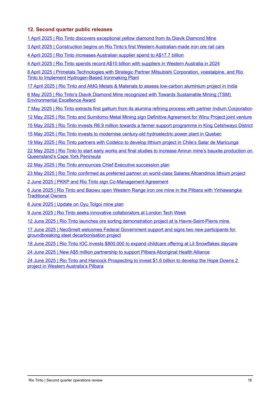 12. Second quarter public releases 1 April 2025 | Rio Tinto discovers exceptional yellow diamond from its Diavik Diamond Mine 3 April 2025 | Construction begins on Rio Tinto’s first Western Australian-made iron ore rail cars 4 April 2025 | Rio Tinto increases Australian supplier spend to A$17.7 billion 4 April 2025 | Rio Tinto spends record A$10 billion with suppliers in Western Australia in 2024 8 April 2025 | Primetals Technologies with Strategic Partner Mitsubishi Corporation, voestalpine, and Rio Tinto to Implement Hydrogen-Based Ironmaking Plant 17 April 2025 | Rio Tinto and AMG Metals & Materials to assess low-carbon aluminium project in India 6 May 2025 | Rio Tinto’s Diavik Diamond Mine recognized with Towards Sustainable Mining (TSM) Environmental Excellence Award 7 May 2025 | Rio Tinto extracts first gallium from its alumina refining process with partner Indium Corporation 12 May 2025 | Rio Tinto and Sumitomo Metal Mining sign Definitive Agreement for Winu Project joint venture 15 May 2025 | Rio Tinto invests R6.9 million towards a farmer support programme in King Cetshwayo District 15 May 2025 | Rio Tinto invests to modernise century-old hydroelectric power plant in Quebec 19 May 2025 | Rio Tinto partners with Codelco to develop lithium project in Chile’s Salar de Maricunga 22 May 2025 | Rio Tinto to start early works and final studies to increase Amrun mine’s bauxite production on Queensland’s Cape York Peninsula 22 May 2025 | Rio Tinto announces Chief Executive succession plan 23 May 2025 | Rio Tinto confirmed as preferred partner on world-class Salares Altoandinos lithium project 2 June 2025 | PKKP and Rio Tinto sign Co-Management Agreement 6 June 2025 | Rio Tinto and Baowu open Western Range iron ore mine in the Pilbara with Yinhawangka Traditional Owners 6 June 2025 | Update on Oyu Tolgoi mine plan 9 June 2025 | Rio Tinto seeks innovative collaborators at London Tech Week 12 June 2025 | Rio Tinto launches ore sorting demonstration project at is Havre-Saint-Pierre mine 17 June 2025 | NeoSmelt welcomes Federal Government support and signs two new participants for groundbreaking steel decarbonisation project 18 June 2025 | Rio Tinto IOC invests $800,000 to expand childcare offering at Lil Snowflakes daycare 24 June 2025 | New A$5 million partnership to support Pilbara Aboriginal Health Alliance 24 June 2025 | Rio Tinto and Hancock Prospecting to invest $1.6 billion to develop the Hope Downs 2 project in Western Australia’s Pilbara Rio Tinto | Second quarter operations review 18