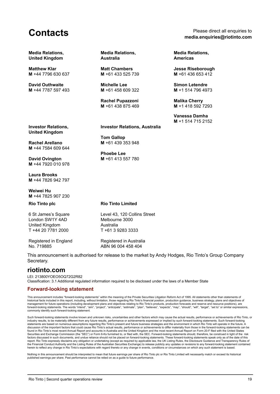 Contacts Please direct all enquiries to media.enquiries@riotinto.com Media Relations, United Kingdom Matthew Klar M +44 7796 630 637 David Outhwaite M +44 7787 597 493 Media Relations, Australia Matt Chambers M +61 433 525 739 Michelle Lee M +61 458 609 322 Rachel Pupazzoni M +61 438 875 469 Media Relations, Americas Jesse Riseborough M +61 436 653 412 Simon Letendre M +1 514 796 4973 Malika Cherry M +1 418 592 7293 Vanessa Damha M +1 514 715 2152 Investor Relations, United Kingdom Rachel Arellano M +44 7584 609 644 David Ovington M +44 7920 010 978 Laura Brooks M +44 7826 942 797 Weiwei Hu M +44 7825 907 230 Investor Relations, Australia Tom Gallop M +61 439 353 948 Phoebe Lee M +61 413 557 780 Rio Tinto plc 6 St James’s Square London SW1Y 4AD United Kingdom T +44 20 7781 2000 Registered in England No. 719885 Rio Tinto Limited Level 43, 120 Collins Street Melbourne 3000 Australia T +61 3 9283 3333 Registered in Australia ABN 96 004 458 404 This announcement is authorised for release to the market by Andy Hodges, Rio Tinto’s Group Company Secretary. riotinto.com LEI: 213800YOEO5OQ72G2R82 Classification: 3.1 Additional regulated information required to be disclosed under the laws of a Member State Forward-looking statement This announcement includes “forward-looking statements” within the meaning of the Private Securities Litigation Reform Act of 1995. All statements other than statements of historical facts included in this report, including, without limitation, those regarding Rio Tinto’s financial position, production guidance, business strategy, plans and objectives of management for future operations (including development plans and objectives relating to Rio Tinto’s products, production forecasts and reserve and resource positions), are forward-looking statements. The words “intend”, “aim”, “project”, “anticipate”, “estimate”, “plan”, “believes”, “expects”, “may”, “should”, “will”, “target”, “set to” or similar expressions, commonly identify such forward-looking statement. Such forward-looking statements involve known and unknown risks, uncertainties and other factors which may cause the actual results, performance or achievements of Rio Tinto, or industry results, to be materially different from any future results, performance or achievements expressed or implied by such forward-looking statements. Such forward-looking statements are based on numerous assumptions regarding Rio Tinto’s present and future business strategies and the environment in which Rio Tinto will operate in the future. A discussion of the important factors that could cause Rio Tinto’s actual results, performance or achievements to differ materially from those in the forward-looking statements can be found in Rio Tinto’s most recent Annual Report and accounts in Australia and the United Kingdom and the most recent Annual Report on Form 20-F filed with the United States Securities and Exchange Commission (the “SEC”) or Form 6-Ks furnished to, or filed with, the SEC. Forward-looking statements should, therefore, be construed in light of the risk factors discussed in such documents, and undue reliance should not be placed on forward-looking statements. These forward-looking statements speak only as of the date of this report. Rio Tinto expressly disclaims any obligation or undertaking (except as required by applicable law, the UK Listing Rules, the Disclosure Guidance and Transparency Rules of the Financial Conduct Authority and the Listing Rules of the Australian Securities Exchange) to release publicly any updates or revisions to any forward-looking statement contained herein to reflect any change in Rio Tinto’s expectations with regard thereto or any change in events, conditions or circumstances on which any such statement is based. Nothing in this announcement should be interpreted to mean that future earnings per share of Rio Tinto plc or Rio Tinto Limited will necessarily match or exceed its historical published earnings per share. Past performance cannot be relied on as a guide to future performance. Rio Tinto | Second quarter operations review 19