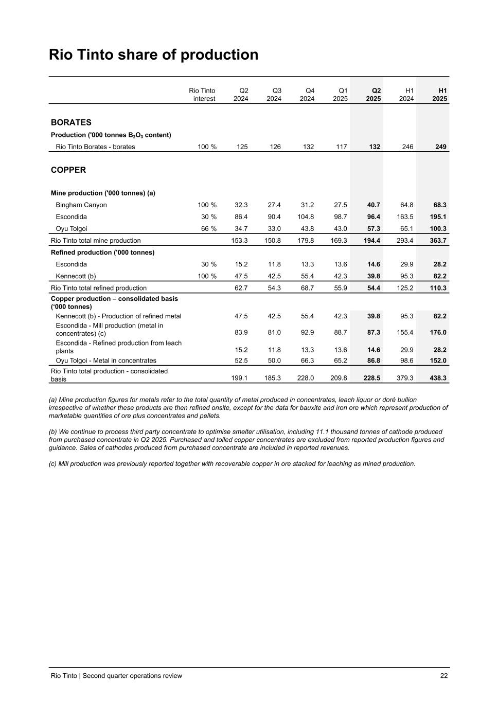 Rio Tinto share of production Rio Tinto interest Q2 2024 Q3 2024 Q4 2024 Q1 2025 Q2 2025 H1 2024 H1 2025 BORATES Production ('000 tonnes B2O3 content) Rio Tinto Borates - borates 100 % 125 126 132 117 132 246 249 COPPER Mine production ('000 tonnes) (a) Bingham Canyon 100 % 32.3 27.4 31.2 27.5 40.7 64.8 68.3 Escondida 30 % 86.4 90.4 104.8 98.7 96.4 163.5 195.1 Oyu Tolgoi 66 % 34.7 33.0 43.8 43.0 57.3 65.1 100.3 Rio Tinto total mine production 153.3 150.8 179.8 169.3 194.4 293.4 363.7 Refined production ('000 tonnes) Escondida 30 % 15.2 11.8 13.3 13.6 14.6 29.9 28.2 Kennecott (b) 100 % 47.5 42.5 55.4 42.3 39.8 95.3 82.2 Rio Tinto total refined production 62.7 54.3 68.7 55.9 54.4 125.2 110.3 Copper production – consolidated basis (‘000 tonnes) Kennecott (b) - Production of refined metal 47.5 42.5 55.4 42.3 39.8 95.3 82.2 Escondida - Mill production (metal in concentrates) (c) 83.9 81.0 92.9 88.7 87.3 155.4 176.0 Escondida - Refined production from leach plants 15.2 11.8 13.3 13.6 14.6 29.9 28.2 Oyu Tolgoi - Metal in concentrates 52.5 50.0 66.3 65.2 86.8 98.6 152.0 Rio Tinto total production - consolidated basis 199.1 185.3 228.0 209.8 228.5 379.3 438.3 (a) Mine production figures for metals refer to the total quantity of metal produced in concentrates, leach liquor or doré bullion irrespective of whether these products are then refined onsite, except for the data for bauxite and iron ore which represent production of marketable quantities of ore plus concentrates and pellets. (b) We continue to process third party concentrate to optimise smelter utilisation, including 11.1 thousand tonnes of cathode produced from purchased concentrate in Q2 2025. Purchased and tolled copper concentrates are excluded from reported production figures and guidance. Sales of cathodes produced from purchased concentrate are included in reported revenues. (c) Mill production was previously reported together with recoverable copper in ore stacked for leaching as mined production. Rio Tinto | Second quarter operations review 22
