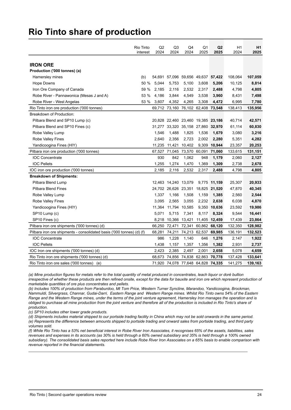 Rio Tinto share of production Rio Tinto interest Q2 2024 Q3 2024 Q4 2024 Q1 2025 Q2 2025 H1 2024 H1 2025 IRON ORE Production ('000 tonnes) (a) Hamersley mines (b) 54,691 57,096 59,656 49,637 57,422 108,064 107,059 Hope Downs 50 % 5,044 5,753 5,100 3,608 5,206 10,125 8,814 Iron Ore Company of Canada 59 % 2,185 2,116 2,532 2,317 2,488 4,798 4,805 Robe River - Pannawonica (Mesas J and A) 53 % 4,186 3,844 4,549 3,538 3,960 8,431 7,498 Robe River - West Angelas 53 % 3,607 4,352 4,265 3,308 4,472 6,995 7,780 Rio Tinto iron ore production ('000 tonnes) 69,712 73,160 76,102 62,408 73,548 138,413 135,956 Breakdown of Production: Pilbara Blend and SP10 Lump (c) 20,828 22,460 23,460 19,385 23,186 40,714 42,571 Pilbara Blend and SP10 Fines (c) 31,277 33,320 35,158 27,860 32,970 61,114 60,830 Robe Valley Lump 1,546 1,488 1,825 1,536 1,679 3,080 3,216 Robe Valley Fines 2,640 2,356 2,723 2,002 2,280 5,351 4,282 Yandicoogina Fines (HIY) 11,235 11,421 10,402 9,309 10,944 23,357 20,253 Pilbara iron ore production ('000 tonnes) 67,527 71,045 73,570 60,091 71,060 133,615 131,151 IOC Concentrate 930 842 1,062 948 1,179 2,060 2,127 IOC Pellets 1,255 1,274 1,470 1,369 1,309 2,738 2,678 IOC iron ore production ('000 tonnes) 2,185 2,116 2,532 2,317 2,488 4,798 4,805 Breakdown of Shipments: Pilbara Blend Lump 12,463 14,240 13,079 9,775 11,159 25,307 20,933 Pilbara Blend Fines 24,702 26,626 23,351 18,825 21,520 47,870 40,345 Robe Valley Lump 1,337 1,166 1,508 1,159 1,385 2,560 2,544 Robe Valley Fines 3,095 2,565 3,055 2,232 2,638 6,038 4,870 Yandicoogina Fines (HIY) 11,364 11,794 10,585 9,350 10,636 23,592 19,986 SP10 Lump (c) 5,071 5,715 7,341 8,117 8,324 9,544 16,441 SP10 Fines (c) 8,218 10,366 13,421 11,405 12,459 17,439 23,864 Pilbara iron ore shipments ('000 tonnes) (d) 66,250 72,471 72,341 60,862 68,120 132,350 128,982 Pilbara iron ore shipments - consolidated basis ('000 tonnes) (d) (f) 68,281 74,211 74,213 62,537 69,985 136,191 132,523 IOC Concentrate 986 1,228 1,140 646 1,276 2,147 1,922 IOC Pellets 1,438 1,157 1,357 1,356 1,382 2,931 2,737 IOC Iron ore shipments ('000 tonnes) (d) 2,423 2,385 2,497 2,001 2,658 5,078 4,659 Rio Tinto iron ore shipments ('000 tonnes) (d) 68,673 74,856 74,838 62,863 70,778 137,428 133,641 Rio Tinto iron ore sales ('000 tonnes) (e) 71,920 74,078 77,648 64,828 74,335 141,275 139,163 (a) Mine production figures for metals refer to the total quantity of metal produced in concentrates, leach liquor or doré bullion irrespective of whether these products are then refined onsite, except for the data for bauxite and iron ore which represent production of marketable quantities of ore plus concentrates and pellets. (b) Includes 100% of production from Paraburdoo, Mt Tom Price, Western Turner Syncline, Marandoo, Yandicoogina, Brockman, Nammuldi, Silvergrass, Channar, Gudai-Darri, Eastern Range and Western Range mines. Whilst Rio Tinto owns 54% of the Eastern Range and the Western Range mines, under the terms of the joint venture agreement, Hamersley Iron manages the operation and is obliged to purchase all mine production from the joint venture and therefore all of the production is included in Rio Tinto's share of production. (c) SP10 includes other lower grade products. (d) Shipments includes material shipped to our portside trading facility in China which may not be sold onwards in the same period. (e) Represents the difference between amounts shipped to portside trading and onward sales from portside trading, and third party volumes sold. (f) While Rio Tinto has a 53% net beneficial interest in Robe River Iron Associates, it recognises 65% of the assets, liabilities, sales revenues and expenses in its accounts (as 30% is held through a 60% owned subsidiary and 35% is held through a 100% owned subsidiary). The consolidated basis sales reported here include Robe River Iron Associates on a 65% basis to enable comparison with revenue reported in the financial statements. Rio Tinto | Second quarter operations review 24