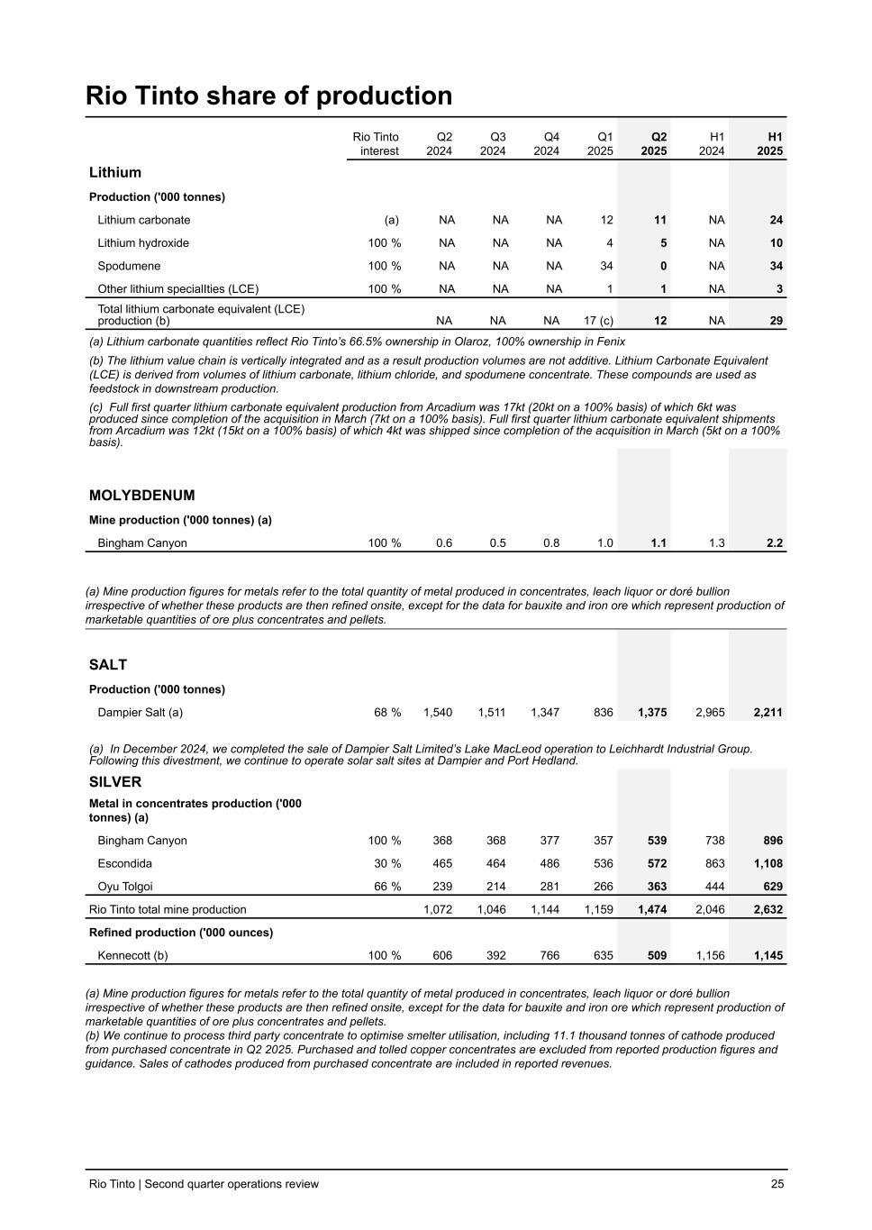 Rio Tinto share of production Rio Tinto interest Q2 2024 Q3 2024 Q4 2024 Q1 2025 Q2 2025 H1 2024 H1 2025 Lithium Production ('000 tonnes) Lithium carbonate (a) NA NA NA 12 11 NA 24 Lithium hydroxide 100 % NA NA NA 4 5 NA 10 Spodumene 100 % NA NA NA 34 0 NA 34 Other lithium specialIties (LCE) 100 % NA NA NA 1 1 NA 3 Total lithium carbonate equivalent (LCE) production (b) NA NA NA 17 (c) 12 NA 29 (a) Lithium carbonate quantities reflect Rio Tinto’s 66.5% ownership in Olaroz, 100% ownership in Fenix (b) The lithium value chain is vertically integrated and as a result production volumes are not additive. Lithium Carbonate Equivalent (LCE) is derived from volumes of lithium carbonate, lithium chloride, and spodumene concentrate. These compounds are used as feedstock in downstream production. (c) Full first quarter lithium carbonate equivalent production from Arcadium was 17kt (20kt on a 100% basis) of which 6kt was produced since completion of the acquisition in March (7kt on a 100% basis). Full first quarter lithium carbonate equivalent shipments from Arcadium was 12kt (15kt on a 100% basis) of which 4kt was shipped since completion of the acquisition in March (5kt on a 100% basis). MOLYBDENUM Mine production ('000 tonnes) (a) Bingham Canyon 100 % 0.6 0.5 0.8 1.0 1.1 1.3 2.2 (a) Mine production figures for metals refer to the total quantity of metal produced in concentrates, leach liquor or doré bullion irrespective of whether these products are then refined onsite, except for the data for bauxite and iron ore which represent production of marketable quantities of ore plus concentrates and pellets. SALT Production ('000 tonnes) Dampier Salt (a) 68 % 1,540 1,511 1,347 836 1,375 2,965 2,211 (a) In December 2024, we completed the sale of Dampier Salt Limited’s Lake MacLeod operation to Leichhardt Industrial Group. Following this divestment, we continue to operate solar salt sites at Dampier and Port Hedland. SILVER Metal in concentrates production ('000 tonnes) (a) Bingham Canyon 100 % 368 368 377 357 539 738 896 Escondida 30 % 465 464 486 536 572 863 1,108 Oyu Tolgoi 66 % 239 214 281 266 363 444 629 Rio Tinto total mine production 1,072 1,046 1,144 1,159 1,474 2,046 2,632 Refined production ('000 ounces) Kennecott (b) 100 % 606 392 766 635 509 1,156 1,145 (a) Mine production figures for metals refer to the total quantity of metal produced in concentrates, leach liquor or doré bullion irrespective of whether these products are then refined onsite, except for the data for bauxite and iron ore which represent production of marketable quantities of ore plus concentrates and pellets. (b) We continue to process third party concentrate to optimise smelter utilisation, including 11.1 thousand tonnes of cathode produced from purchased concentrate in Q2 2025. Purchased and tolled copper concentrates are excluded from reported production figures and guidance. Sales of cathodes produced from purchased concentrate are included in reported revenues. Rio Tinto | Second quarter operations review 25