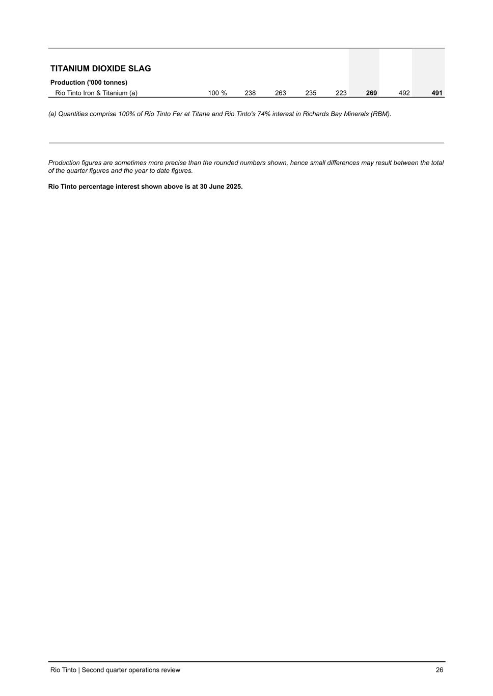 TITANIUM DIOXIDE SLAG Production ('000 tonnes) Rio Tinto Iron & Titanium (a) 100 % 238 263 235 223 269 492 491 (a) Quantities comprise 100% of Rio Tinto Fer et Titane and Rio Tinto's 74% interest in Richards Bay Minerals (RBM). Production figures are sometimes more precise than the rounded numbers shown, hence small differences may result between the total of the quarter figures and the year to date figures. Rio Tinto percentage interest shown above is at 30 June 2025. Rio Tinto | Second quarter operations review 26