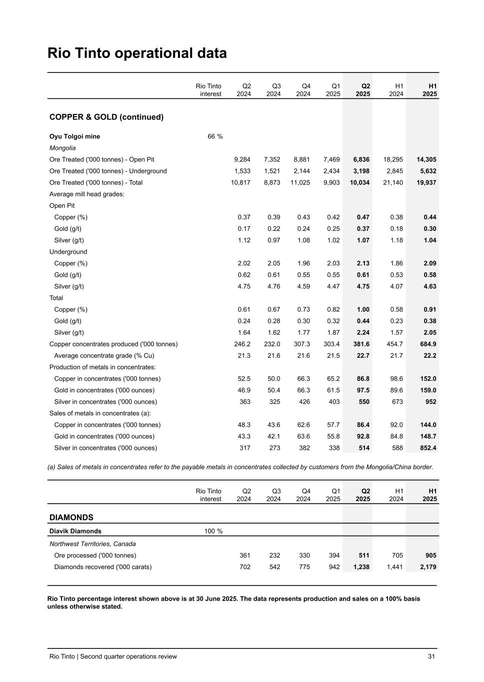 Rio Tinto operational data Rio Tinto interest Q2 2024 Q3 2024 Q4 2024 Q1 2025 Q2 2025 H1 2024 H1 2025 COPPER & GOLD (continued) Oyu Tolgoi mine 66 % Mongolia Ore Treated ('000 tonnes) - Open Pit 9,284 7,352 8,881 7,469 6,836 18,295 14,305 Ore Treated ('000 tonnes) - Underground 1,533 1,521 2,144 2,434 3,198 2,845 5,632 Ore Treated ('000 tonnes) - Total 10,817 8,873 11,025 9,903 10,034 21,140 19,937 Average mill head grades: Open Pit Copper (%) 0.37 0.39 0.43 0.42 0.47 0.38 0.44 Gold (g/t) 0.17 0.22 0.24 0.25 0.37 0.18 0.30 Silver (g/t) 1.12 0.97 1.08 1.02 1.07 1.18 1.04 Underground Copper (%) 2.02 2.05 1.96 2.03 2.13 1.86 2.09 Gold (g/t) 0.62 0.61 0.55 0.55 0.61 0.53 0.58 Silver (g/t) 4.75 4.76 4.59 4.47 4.75 4.07 4.63 Total Copper (%) 0.61 0.67 0.73 0.82 1.00 0.58 0.91 Gold (g/t) 0.24 0.28 0.30 0.32 0.44 0.23 0.38 Silver (g/t) 1.64 1.62 1.77 1.87 2.24 1.57 2.05 Copper concentrates produced ('000 tonnes) 246.2 232.0 307.3 303.4 381.6 454.7 684.9 Average concentrate grade (% Cu) 21.3 21.6 21.6 21.5 22.7 21.7 22.2 Production of metals in concentrates: Copper in concentrates ('000 tonnes) 52.5 50.0 66.3 65.2 86.8 98.6 152.0 Gold in concentrates ('000 ounces) 46.9 50.4 66.3 61.5 97.5 89.6 159.0 Silver in concentrates ('000 ounces) 363 325 426 403 550 673 952 Sales of metals in concentrates (a): Copper in concentrates ('000 tonnes) 48.3 43.6 62.6 57.7 86.4 92.0 144.0 Gold in concentrates ('000 ounces) 43.3 42.1 63.6 55.8 92.8 84.8 148.7 Silver in concentrates ('000 ounces) 317 273 382 338 514 588 852.4 (a) Sales of metals in concentrates refer to the payable metals in concentrates collected by customers from the Mongolia/China border. Rio Tinto interest Q2 2024 Q3 2024 Q4 2024 Q1 2025 Q2 2025 H1 2024 H1 2025 DIAMONDS Diavik Diamonds 100 % Northwest Territories, Canada Ore processed ('000 tonnes) 361 232 330 394 511 705 905 Diamonds recovered ('000 carats) 702 542 775 942 1,238 1,441 2,179 Rio Tinto percentage interest shown above is at 30 June 2025. The data represents production and sales on a 100% basis unless otherwise stated. Rio Tinto | Second quarter operations review 31